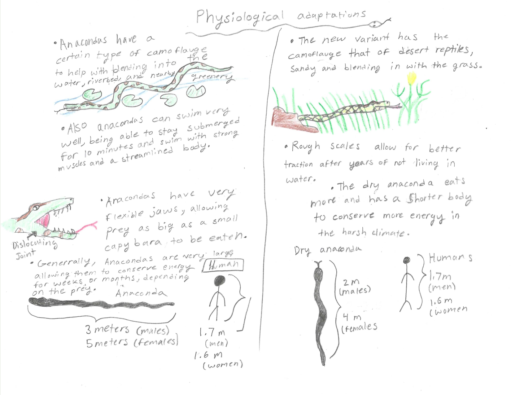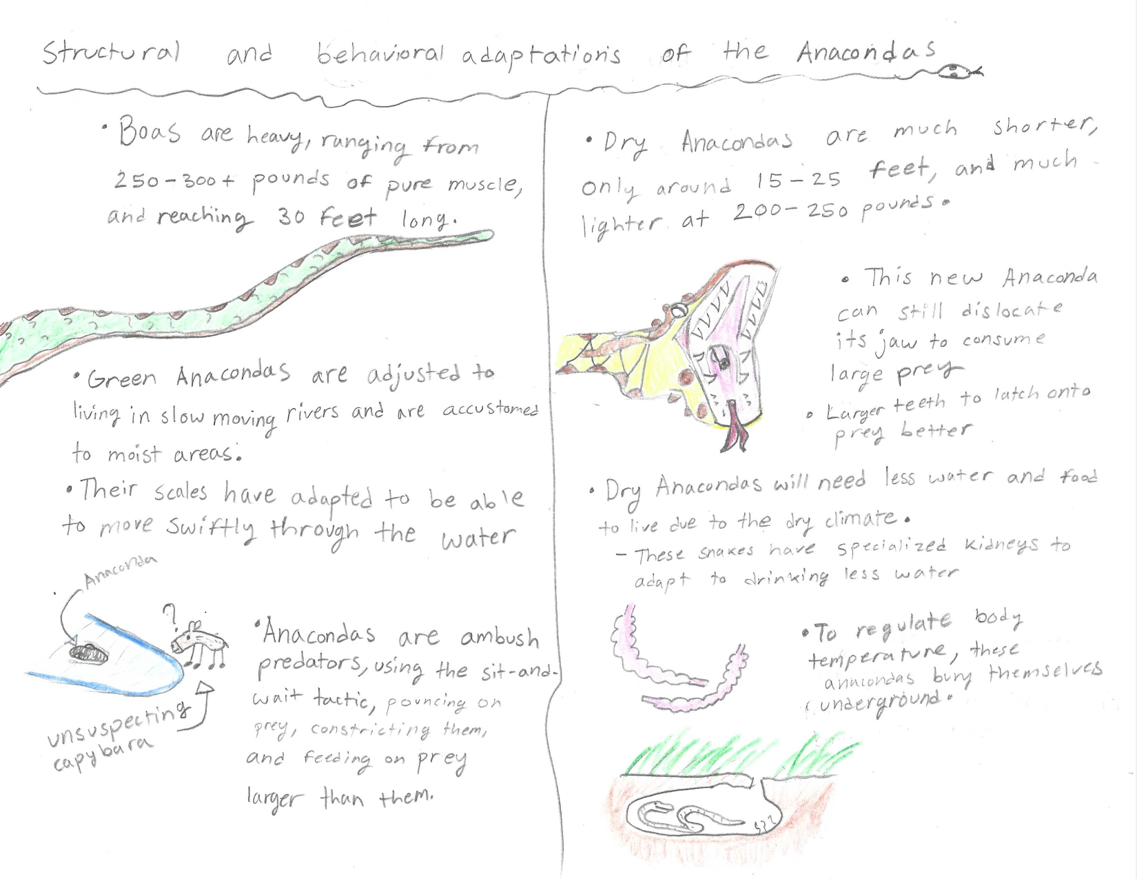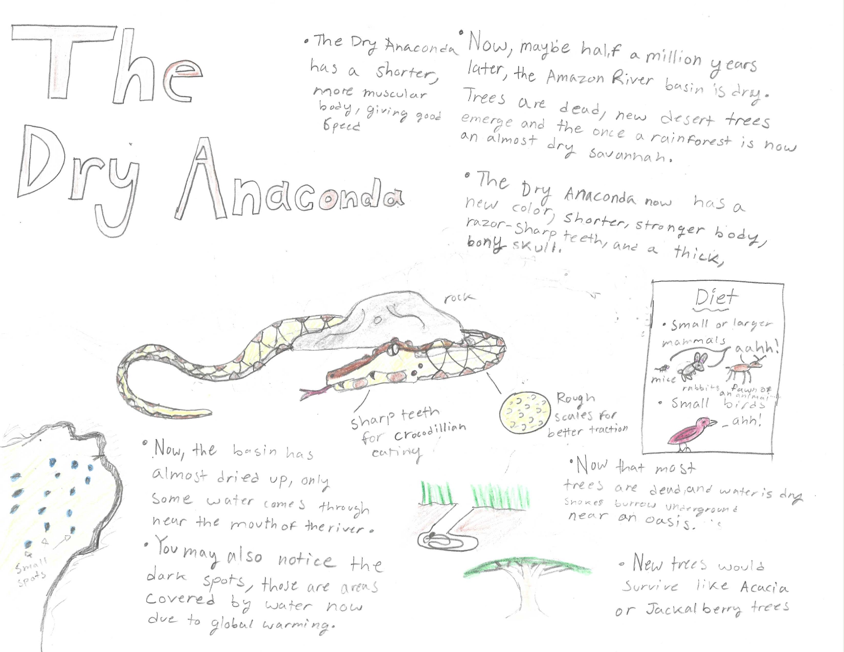 Due to climate change and deforestation, the rainforest we know today could become like an African Savannah, dry and scarce for water. The new Dry Anaconda, with sandy or light orange scales and a shorter body, but with the same body mass. A stronger body allows faster catching of prey and traversing through the savannah. This new Anaconda is still a constrictor, but also has a strong venom and crocodile-like teeth, feeding on the same, but also larger prey. This new version of the Anaconda also has a bony-like-skull. Now, after thousands of years of evolution, the Anaconda has better developed to harsh conditions than ever before.