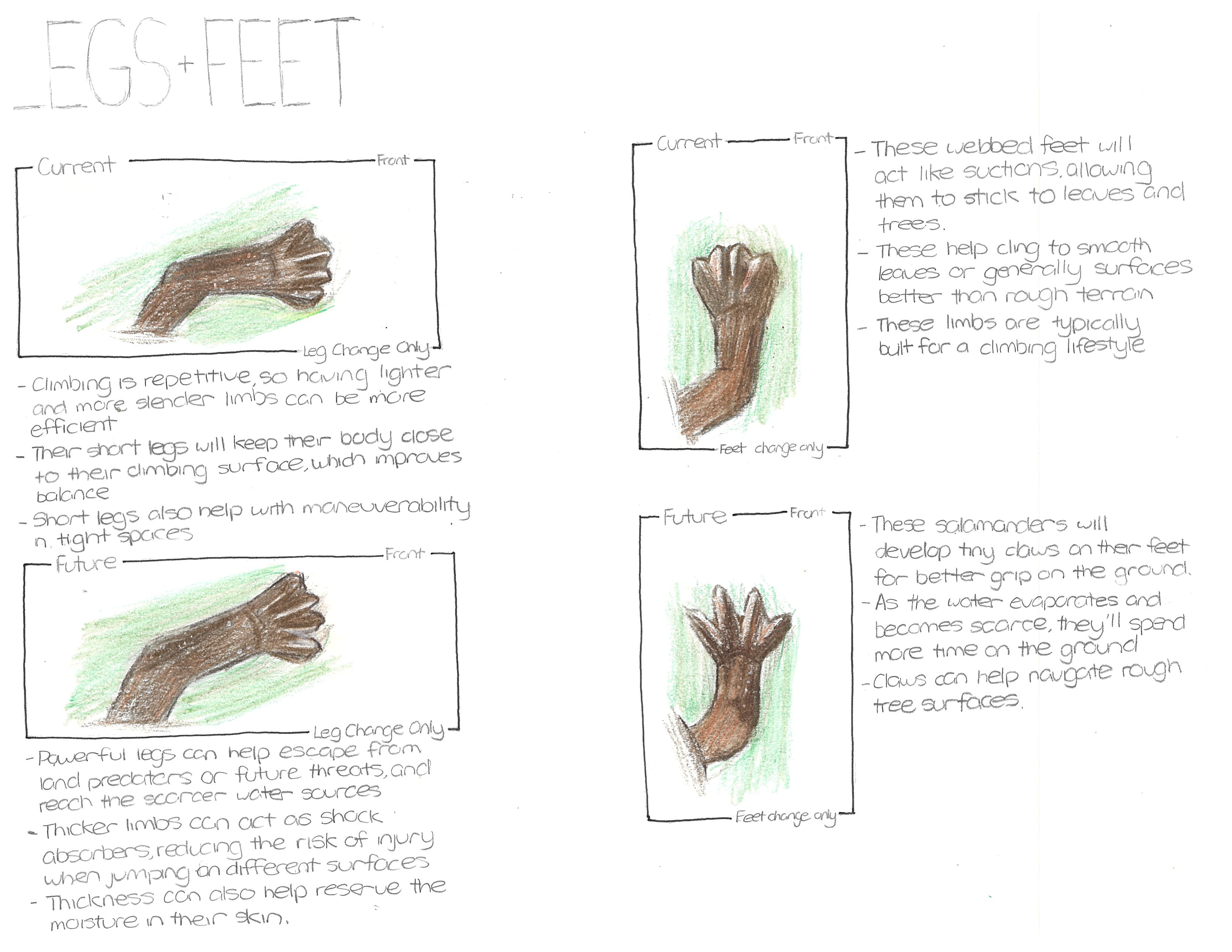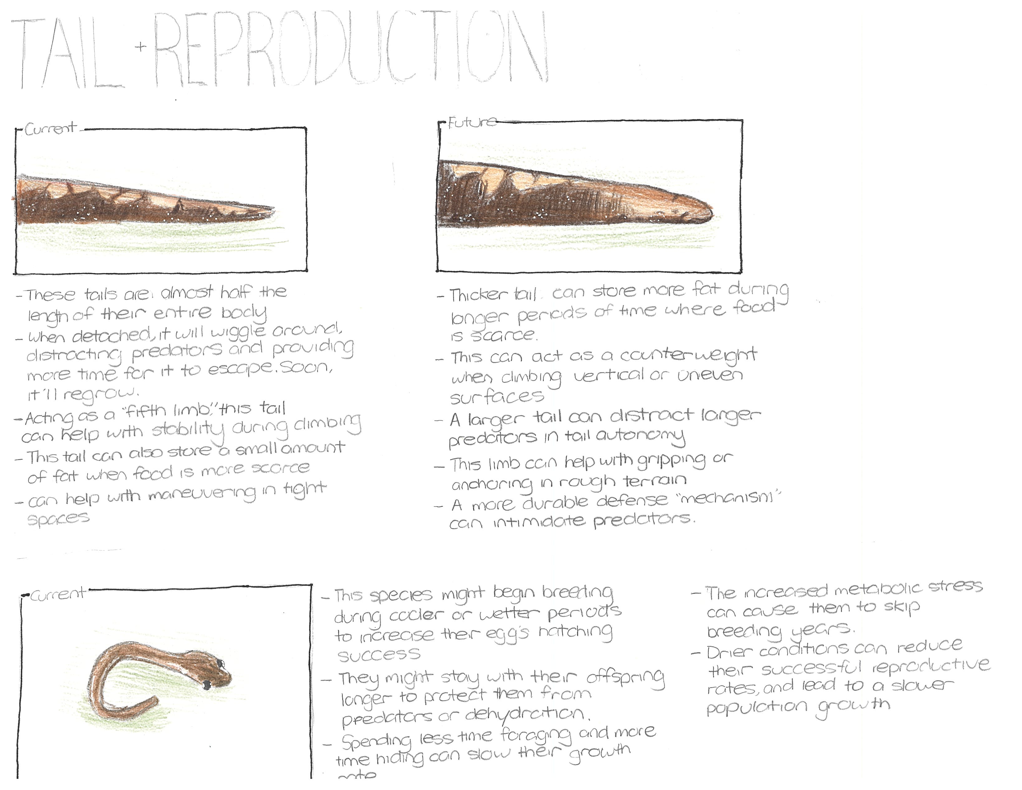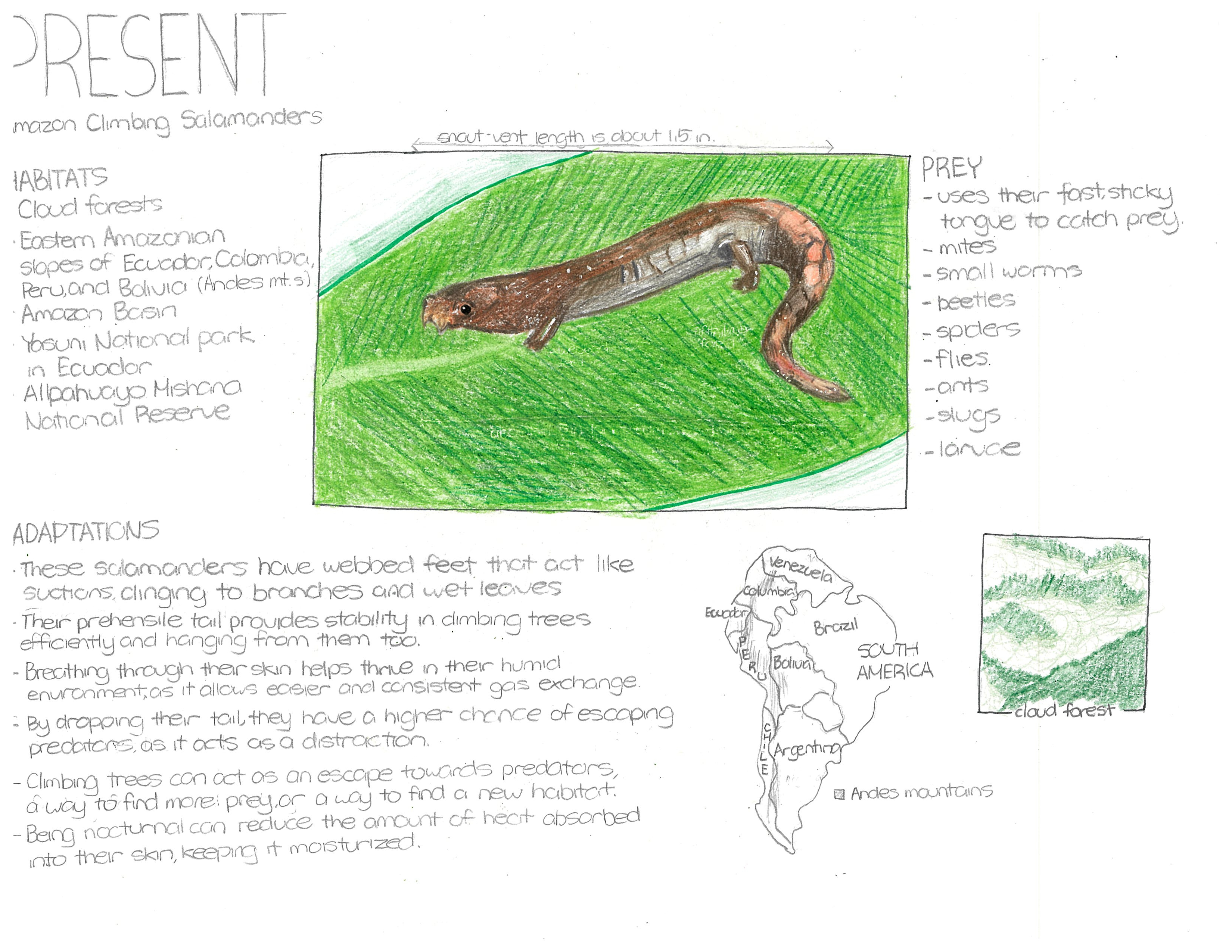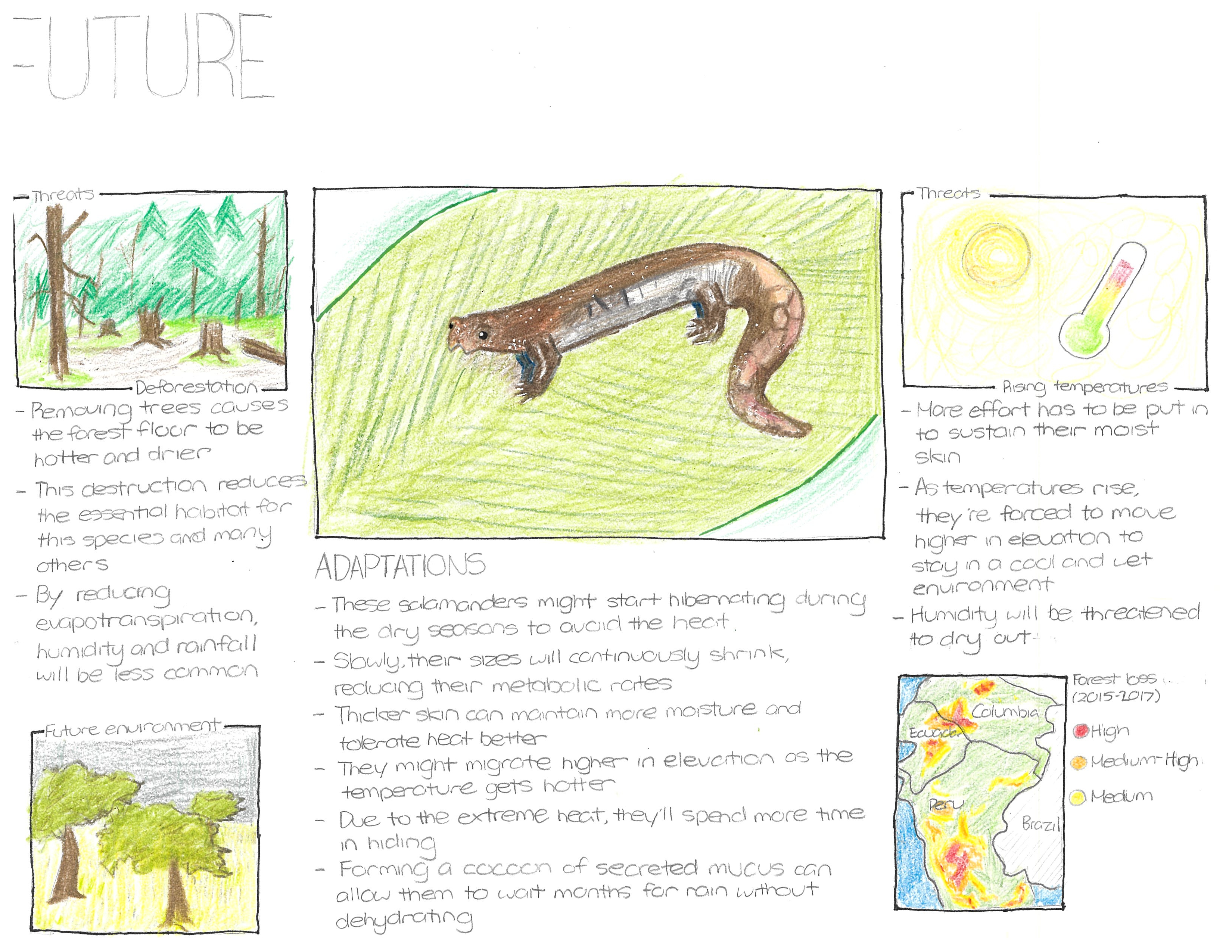 The Amazon Climbing Salamander lives in cloud forests. However, due to warming temperatures, this environment will be drier and be less foggy, significantly reducing the humidity these creatures need. To adapt, it will develop a thicker, more muscular tail to store fat during longer droughts and defense against predators. It can also be a counterweight in vertical surfaces. When detached, a larger tail can wiggle around more to distract larger predators, and also act as a more durable defense "mechanism" to intimidate predators. Furthermore, its legs will also be thicker and more muscular to reach the scarcer water sources and preserve more moisture in their skin. Their feet will develop tiny claws for better grip on the ground. This species might begin breeding during cooler or wetter periods, increasing their egg's hatching success in the heat. Spending less time foraging and more time hiding can slow their growth rate.