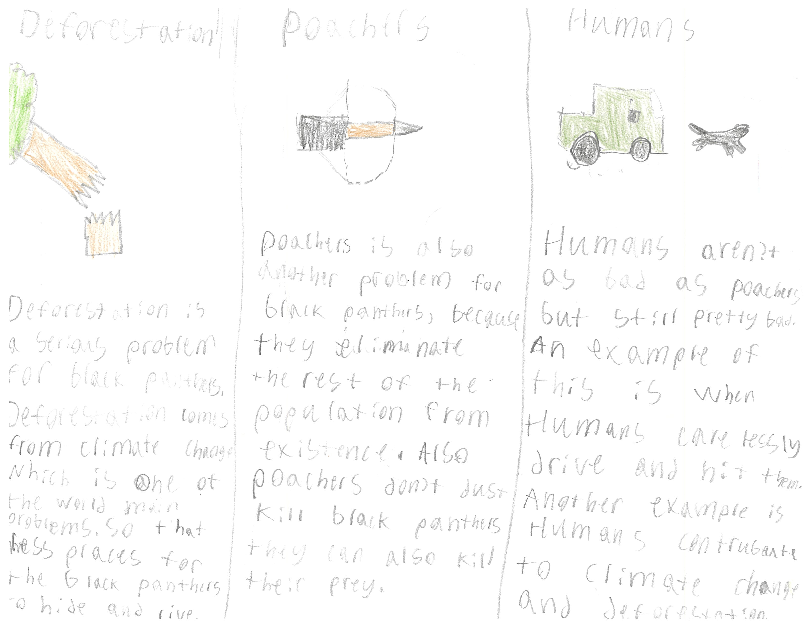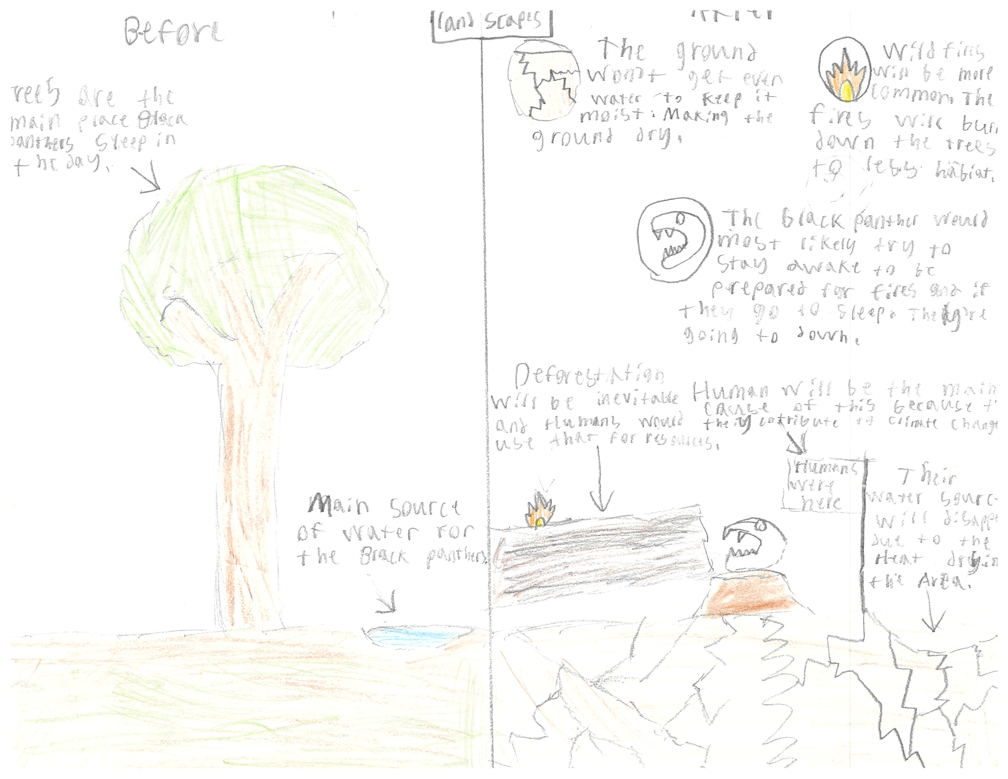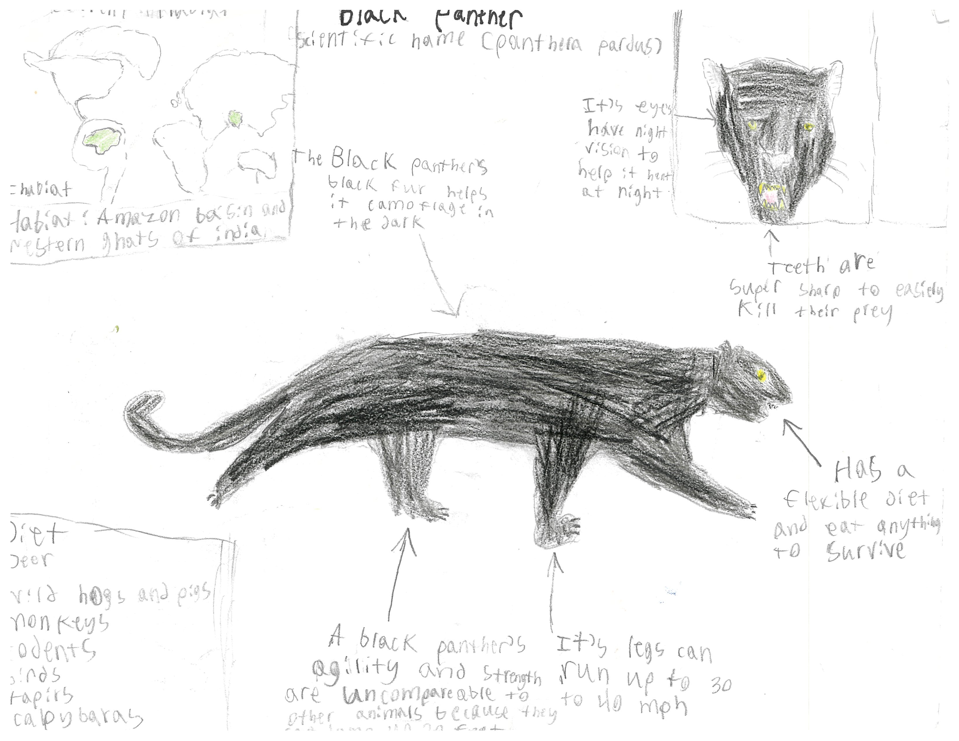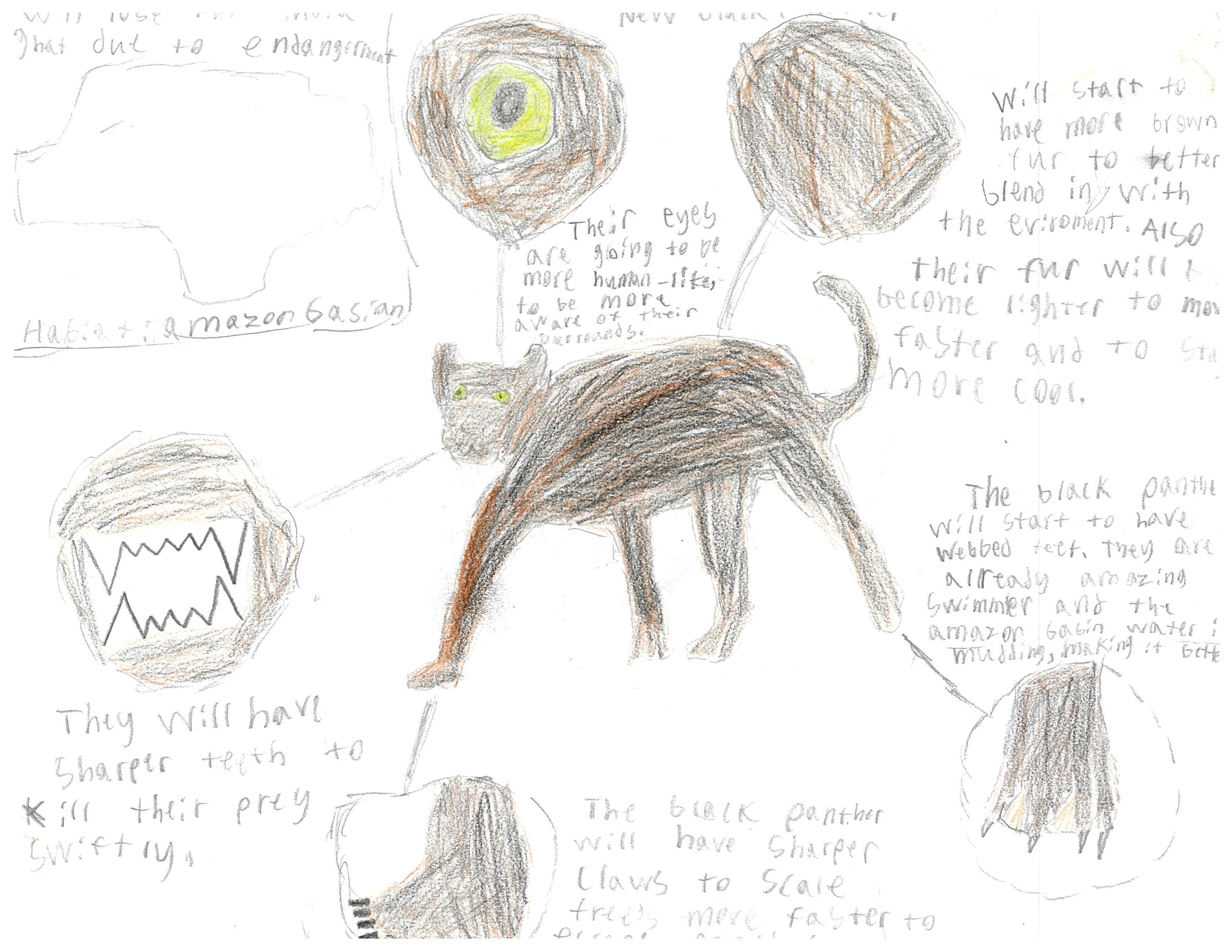 The Black Panther (Panthera Pardus) currently lives in the Amazon Basil and India Ghats, but its population is declining. The Black Panther hunts during the night, swiftly killing their prey in their sleep with a camouflaged body. Most likely, in the future there will be more and more wildfires because of the increase of heat at night, making it harder to hunt prey at night. So their fur will change pigments to a more Black and brown body. The heat will increase making the Panthers more hotter. Most likely, the fur will be lighter making it easier to move around faster and to stay cool. Another feature that would be the best thing for the Black panther is more sharper teeth, with sharper teeth they can kill the prey faster. This would go with the speed, cause if their prey was running, they could kill it instantly.