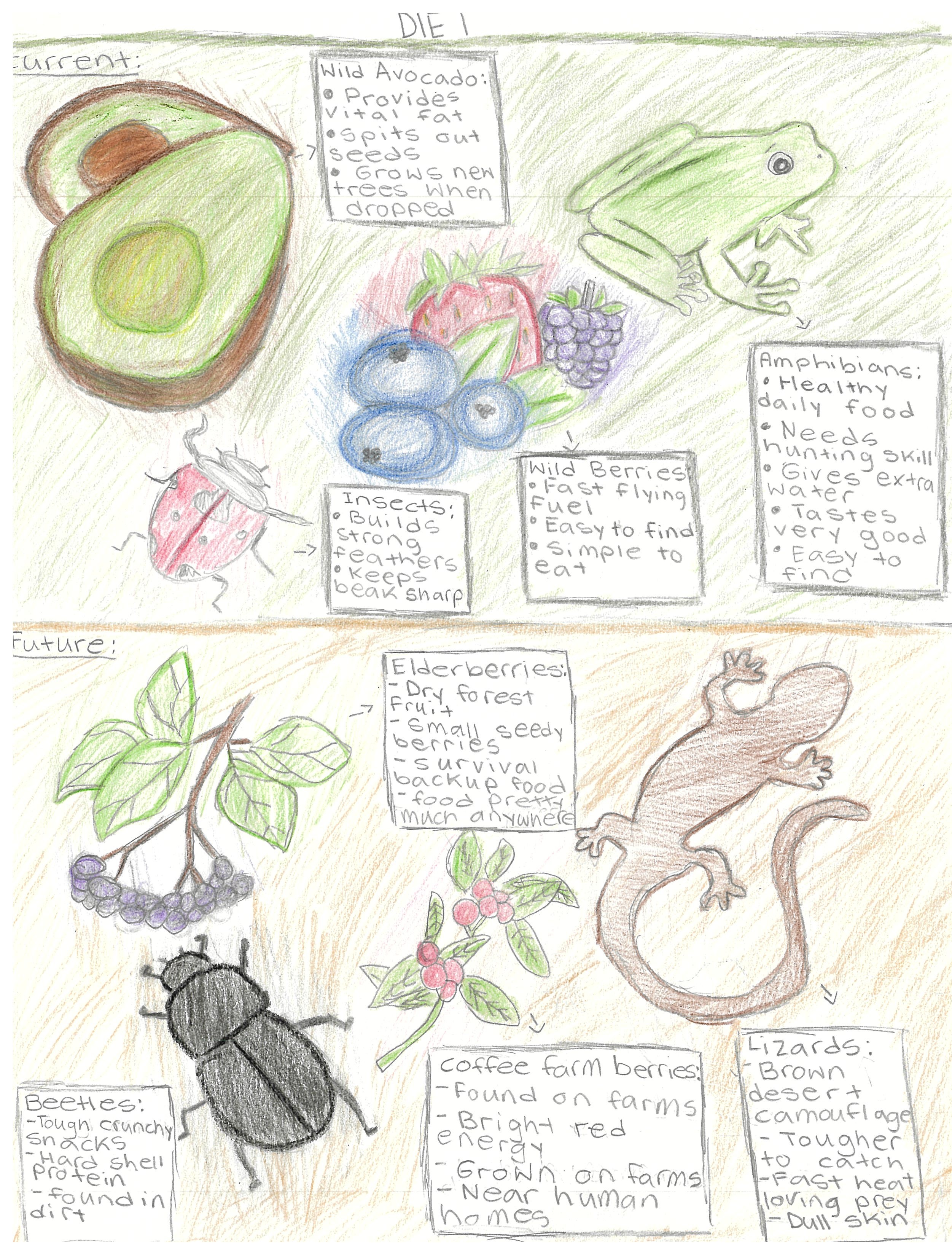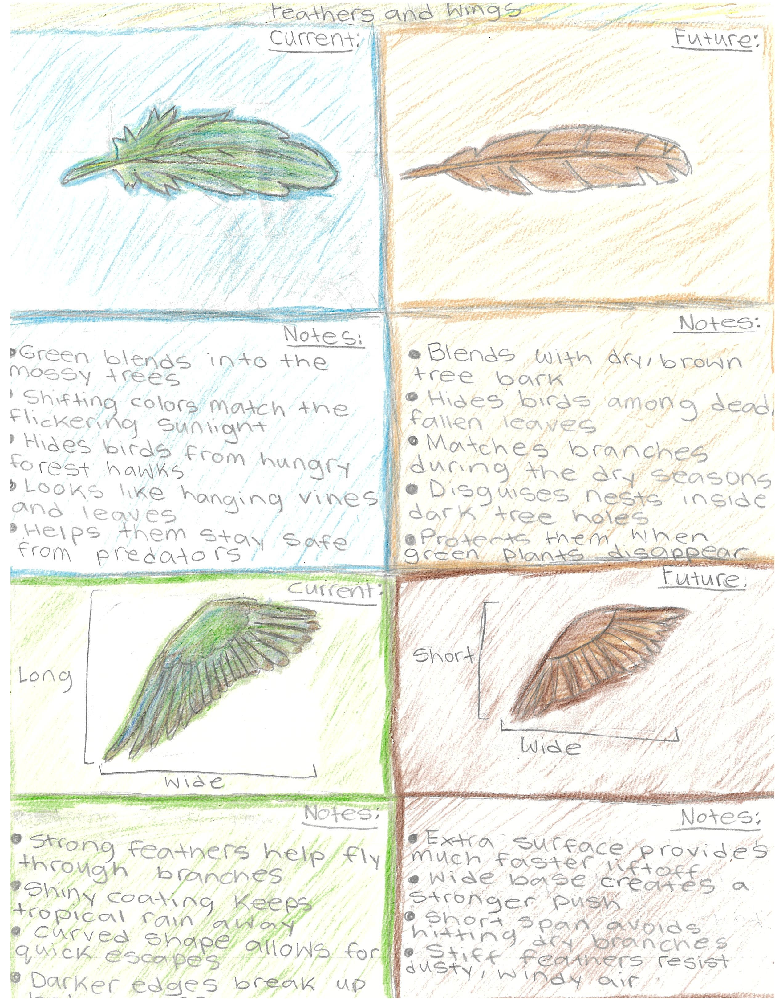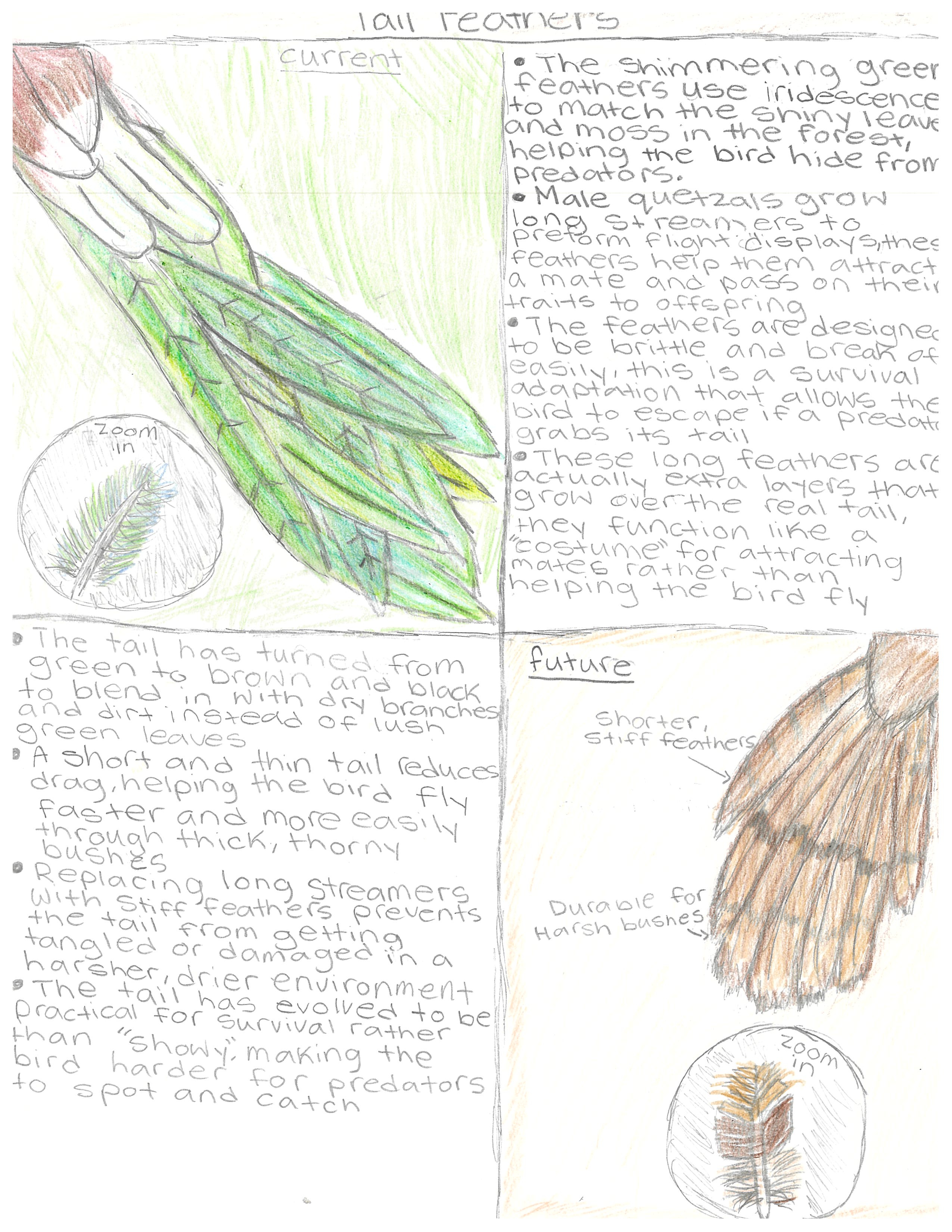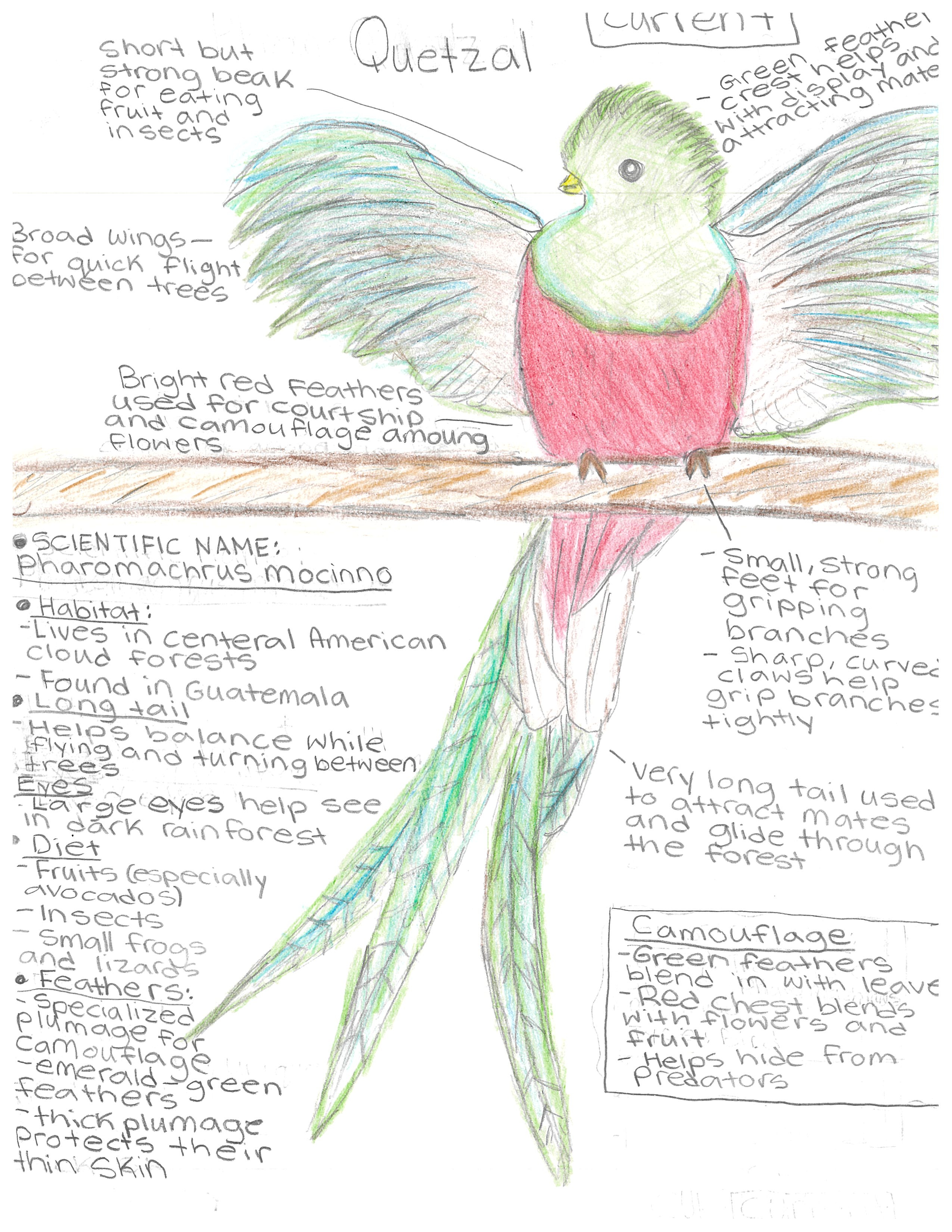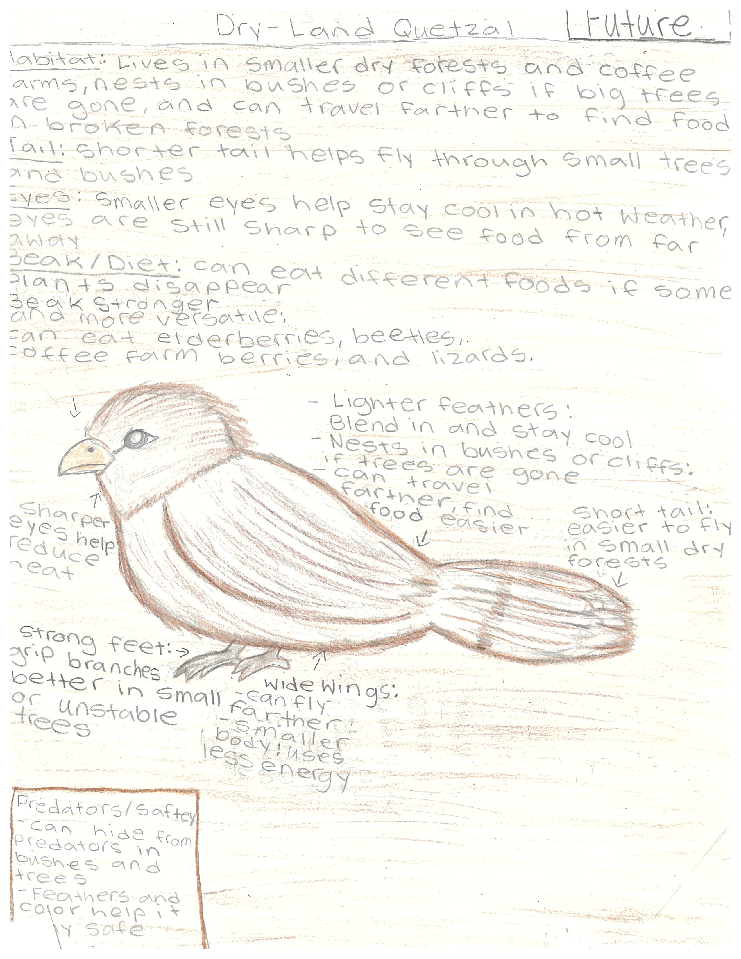 The Guatemalan Pharomachrus mocinno bird, also known as the quetzal, currently lives in cloud forests located in Guatemala. Climate change and deforestation may cause the quetzal to adapt naturally. If forests get drier than usual, quetzals could get short, wide wings to help them fly quickly between trees and open spaces. Its bright green wings might turn into a brown color in order for it to blend better in dry leaves and dirt. The quetzal's eyes could become sharper, so it can clearly see where its food is located. Its long tail might get shorter and stiffer, so it doesn’t get stuck in bushes. The quetzal will not only change features, but it may change its current diet into eating beetles, elderberries, coffee farm berries, and lizards. All of these important changes would help the beautiful quetzal survive hotter weather and forests with fewer trees in Guatemala.