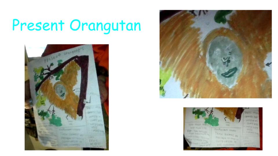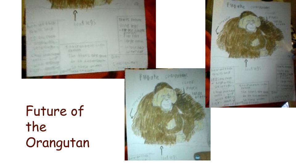 Orangutans have short legs, long arms, and curved toes. These help with climbing trees. Orangutans have bright orange hairy bodies. The orange color assists with blending in and the hairy coats help keep them dry from rain. In the wild orangutans are facing habitat loss due to deforestation. I predict there will be no trees in about 100 years. Orangutans rely on trees to survive. Longer legs and flat feet would help them walk more easily. A larger check pouch and large teeth would help with their new carnivore diet. Longer hair would also help them by keeping them dry since there are no trees. The future is unknown for the orangutan but, there are many ways they can adapt for the better. Like Charles Darwin said " It's not the strongest of species that survives, nor the most intelligent. It is the one that is most adaptable to change."