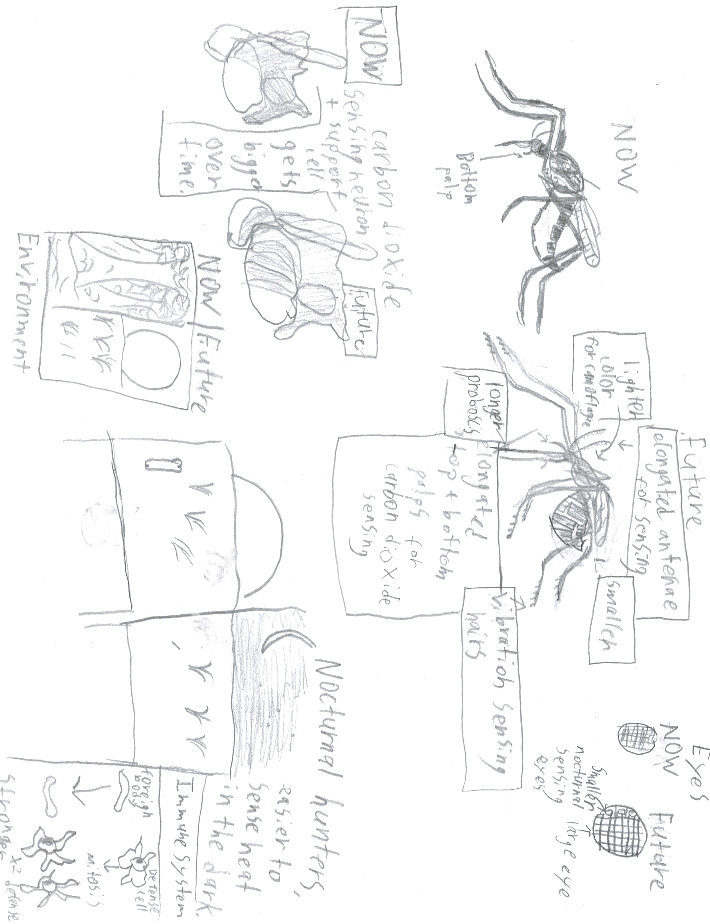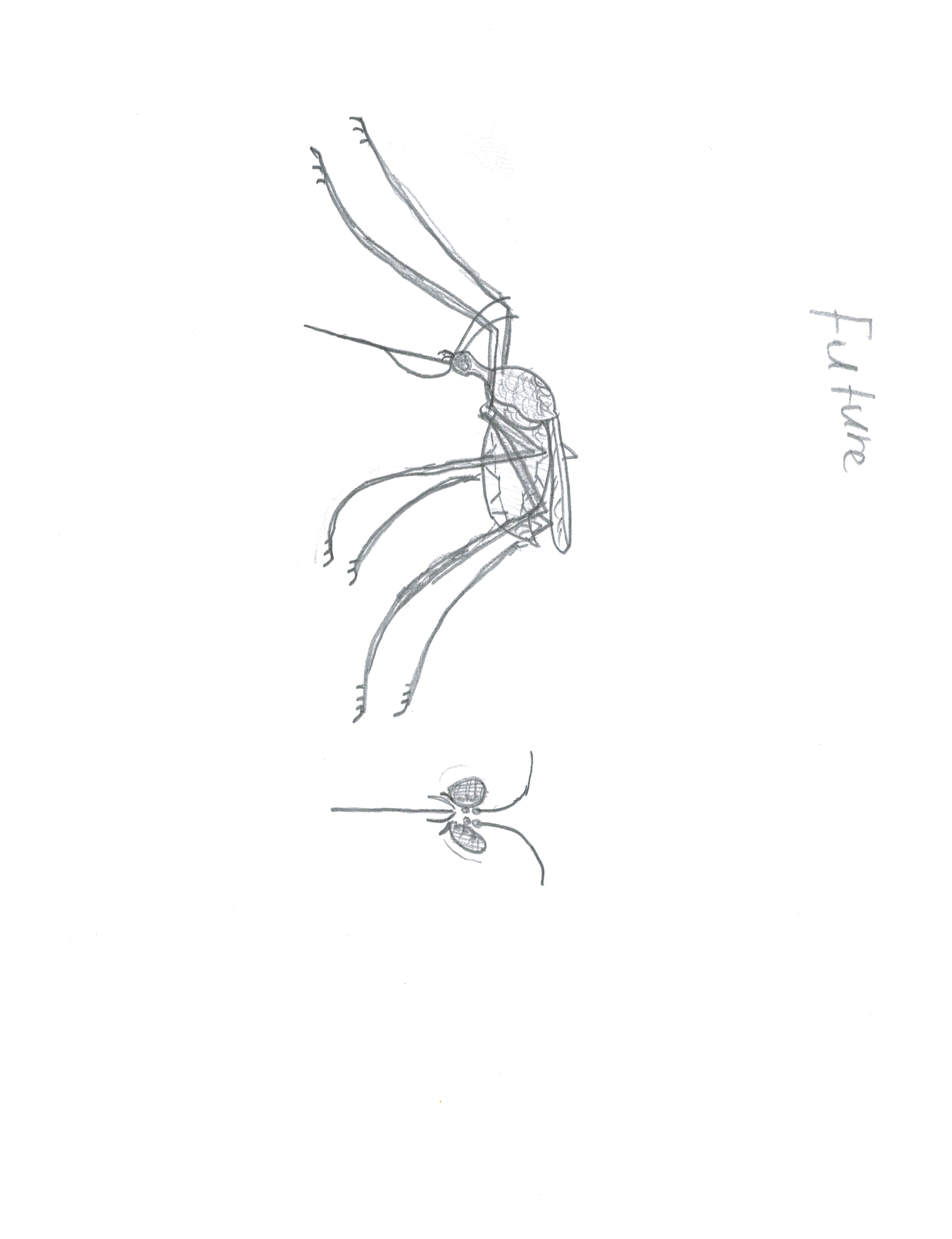 Aedes Aegypti or the Egyptian Mosquito lives across rainforests and other biomes. It’s a hardy insect, but climate change would force several adaptations to occur. The climate changes affecting it are increased heat and loss of habitat. These changes will cause the mosquito’s rainforests to become flat dry plains. My predicted adaptations of the mosquito are labeled in my drawing and include the inference that mosquitoes will grow smaller because they will be hatched in higher temperatures than their current environment. I also predict they will become fully nocturnal hunters to stay cool and better sense heat signatures. Another heat related adaptation for the mosquito would be a stronger immune system to counteract the effects of the increased heat. Due to the lightly colored plains of their new habitat, mosquitoes would grow lighter pigmentation to better camouflage. Finally, the mosquito would develop a more powerful carbon dioxide sensing neuron.