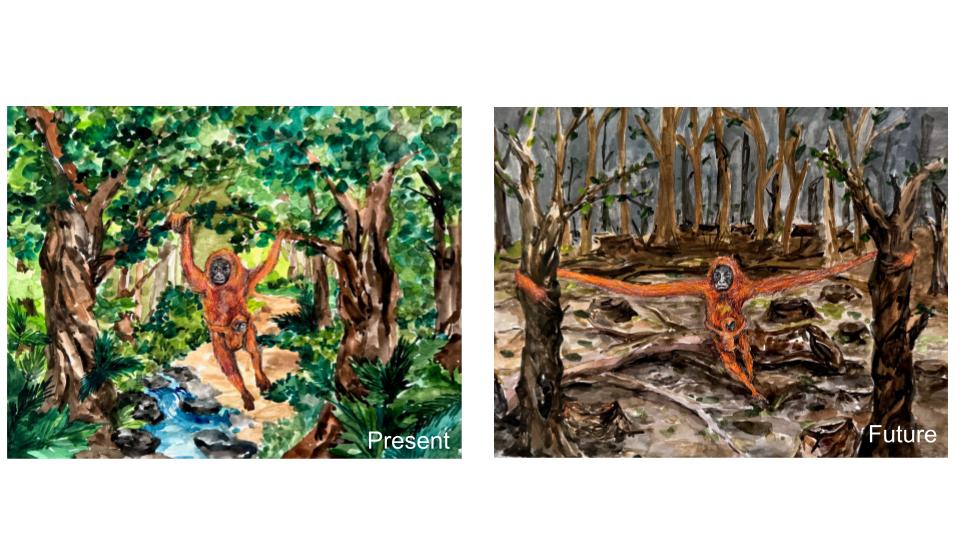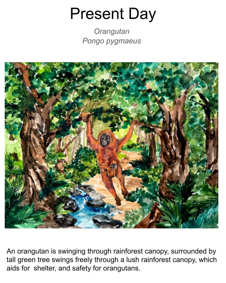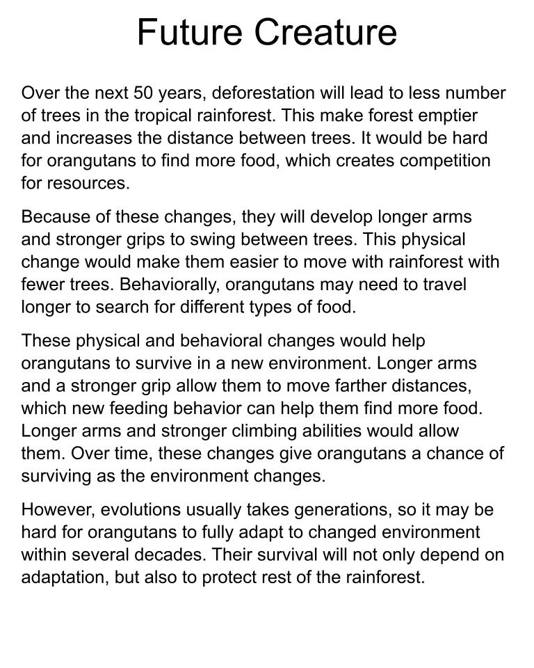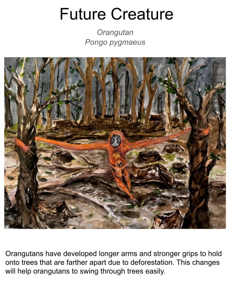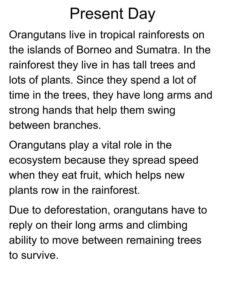 Deforestation affects animals like orangutans that live in tropical rainforests. In a tropical rainforest, tall trees provide food, shelter, and a safe path for orangutans. They have long arms and strong hands, which help them swing between branches. With their long arms and strong hands, orangutans can easily swing from tree to tree to find food and rest safely in trees. However, many trees in the tropical rainforests are removed by deforestation, leaving the land bare. This forces orangutans to swing farther distances between trees. Over time, as deforestation continues and the rainforest becomes emptier, they will develop longer arms to reach further branches. They will also develop stronger shoulders and hands to grip onto the branches securely. These adaptations can help orangutans to survive in a tropical rainforest with fewer trees.