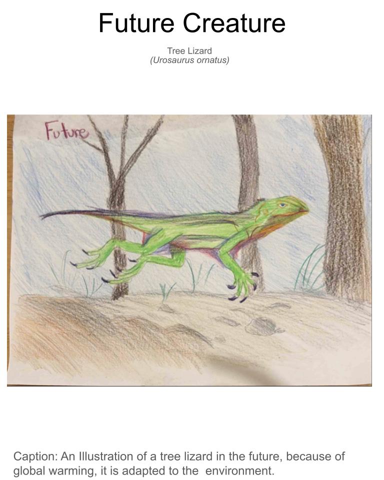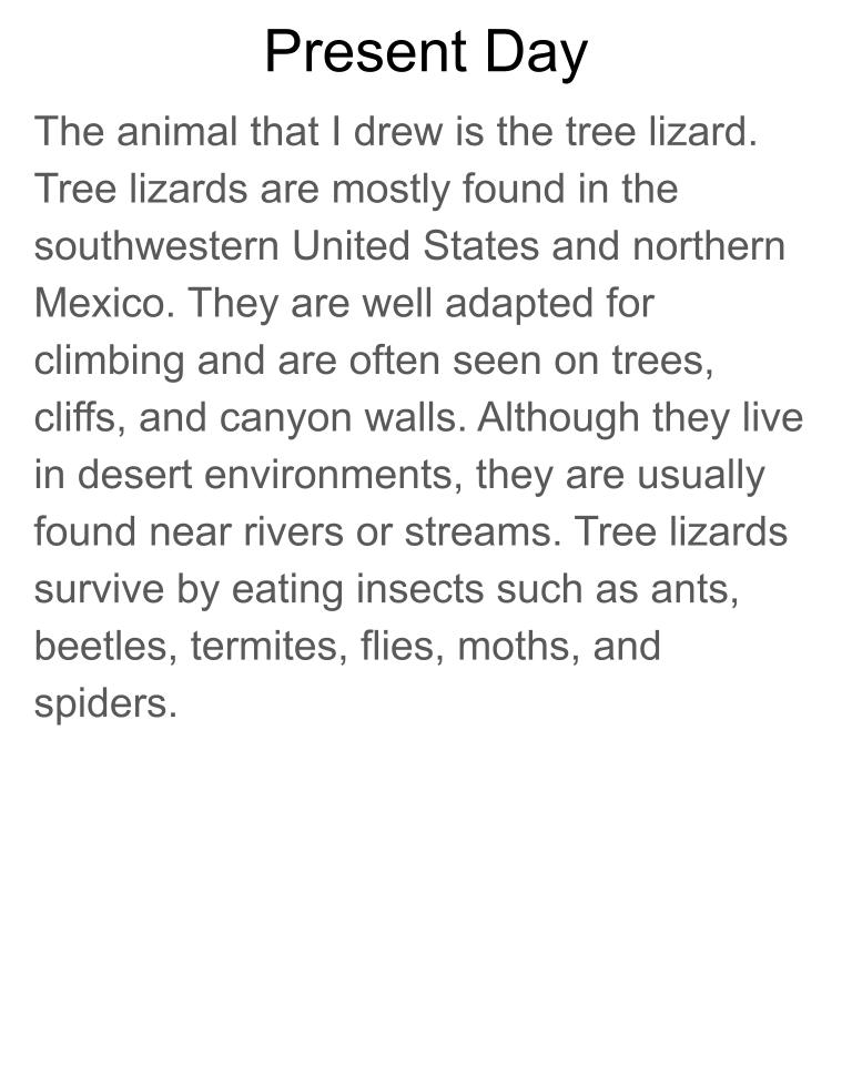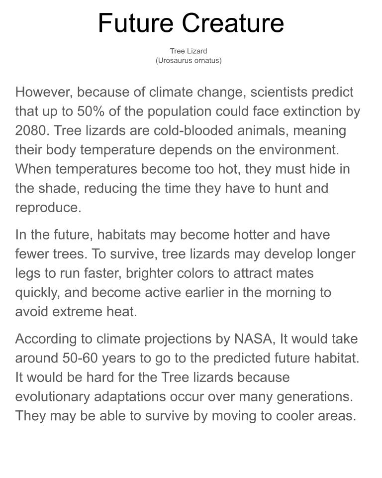 Tree lizards live in the southwestern United States and northern Mexico and are adapted for climbing on trees, cliffs, and canyon walls. Because they are cold-blooded, rising temperatures from climate change may force them to hide in shade more often, reducing time to hunt and reproduce. In the future, hotter habitats with fewer trees may cause some lizards to move to higher elevations. They may also adapt by developing longer legs to move faster, brighter colors to attract mates more quickly, and by becoming active earlier in the day to avoid extreme heat.