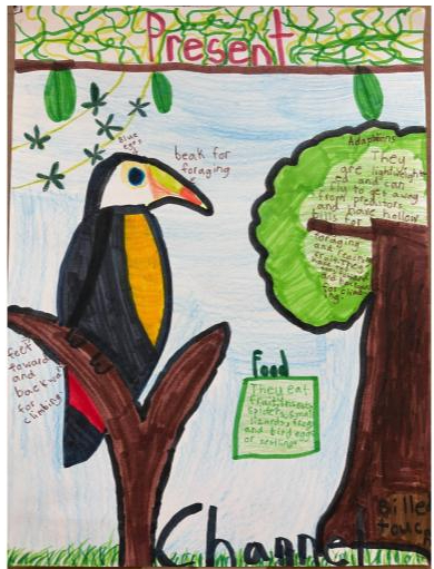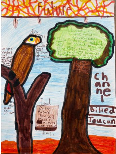 To adapt to the future the Channel Billed Toucan will get larger feet that will become webbed to cling to bare branches and for better grip. They will get larger stronger wings for increased flight. The environment will turn into a savannah. BYE RAINFOREST! They will get smaller, more curved bills for catching fish, insects, tearing meat apart and catching smaller prey. Their feathers will change colors (brown/yellow) for camouflage in their changed environment. They will lose their belly feathers for better egg incubation in warmer climates.