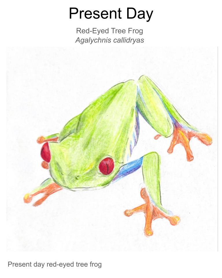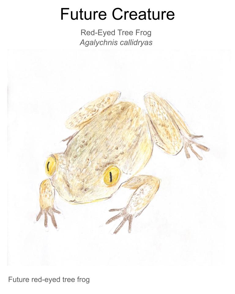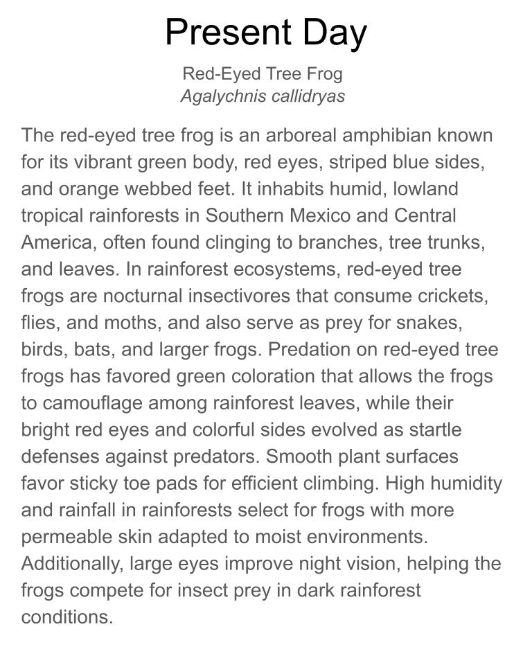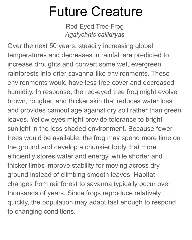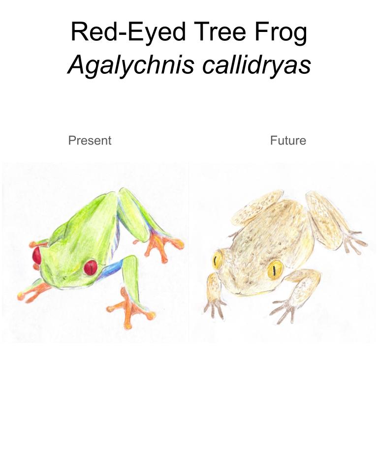 The red-eyed tree frog is an arboreal amphibian known for its vibrant green body, red eyes, striped blue sides, and orange webbed feet. It inhabits humid, lowland tropical rainforests in Southern Mexico and Central America, often found clinging to branches, tree trunks, and leaves. Over the next 50 years, steadily increasing global temperatures and decreases in rainfall are predicted to increase droughts and convert some wet, evergreen rainforests into drier savanna-like environments. In response, the red-eyed tree frog might evolve brown, rougher, and thicker skin that reduces water loss and provides camouflage against dry soil rather than green leaves. Yellow eyes might provide tolerance to bright sunlight in the less shaded environment. The frog may spend more time on the ground and develop a chunkier body that more efficiently stores water and energy, while shorter and thicker limbs improve stability for moving across dry ground instead of climbing smooth leaves.