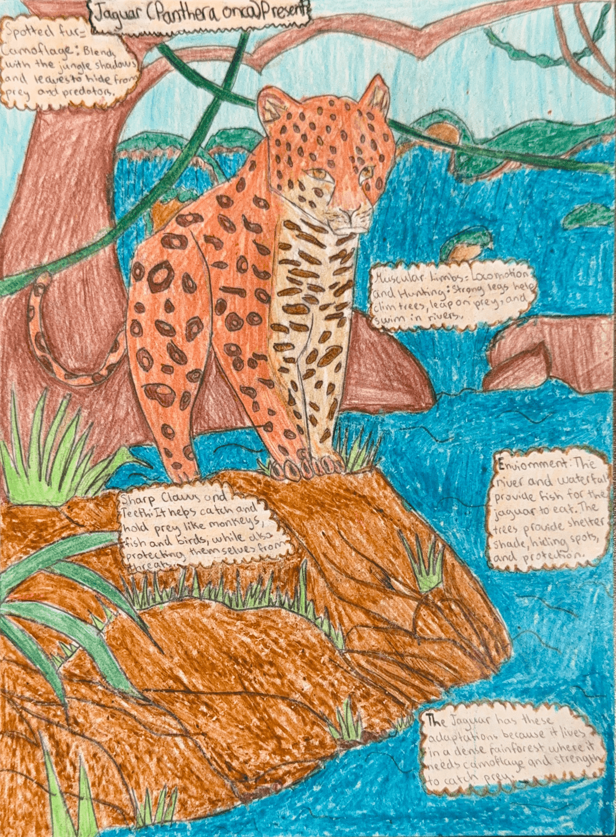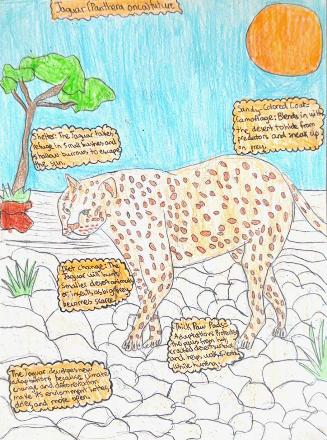 The jaguar is a large animal that lives in the rainforests of the Amazon in South America and parts of Central America near and wetlands. In its jungle habitat, its golden coat with black rosettes provides camouflage among dense trees and shadows. It has a muscular body, strong legs, sharp claws that help it climb, swim, and catch prey. Its powerful jaws can crush hard bones and fish. As climate change makes the Amazon hotter and drier, parts of its habitat may become desert-like. Over time, the jaguar may develop lighter, sand-colored fur to blend into dry land. Longer legs could help it travel for water, and thicker paw pads would protect it from hot ground and allow quiet movement. It may become more nocturnal to avoid extreme heat and hunt smaller desert animals as bigger prey becomes scarce. These adaptations would increase its chances of survival.