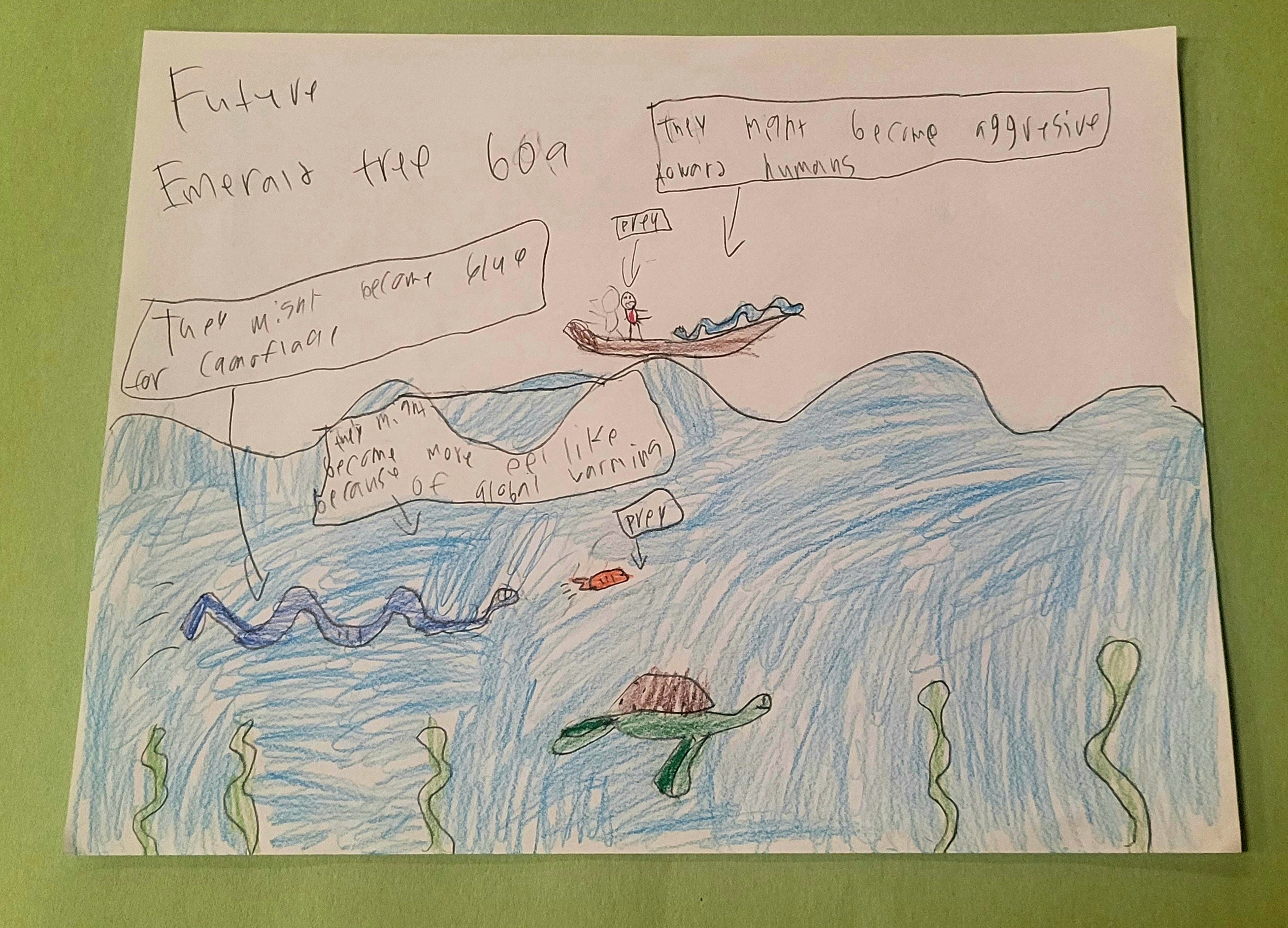 For my future creatures animal, I picked the emerald tree boa. The reason I chose this animal is because they could possibly have many new evolutions in the next 1000 or more years.