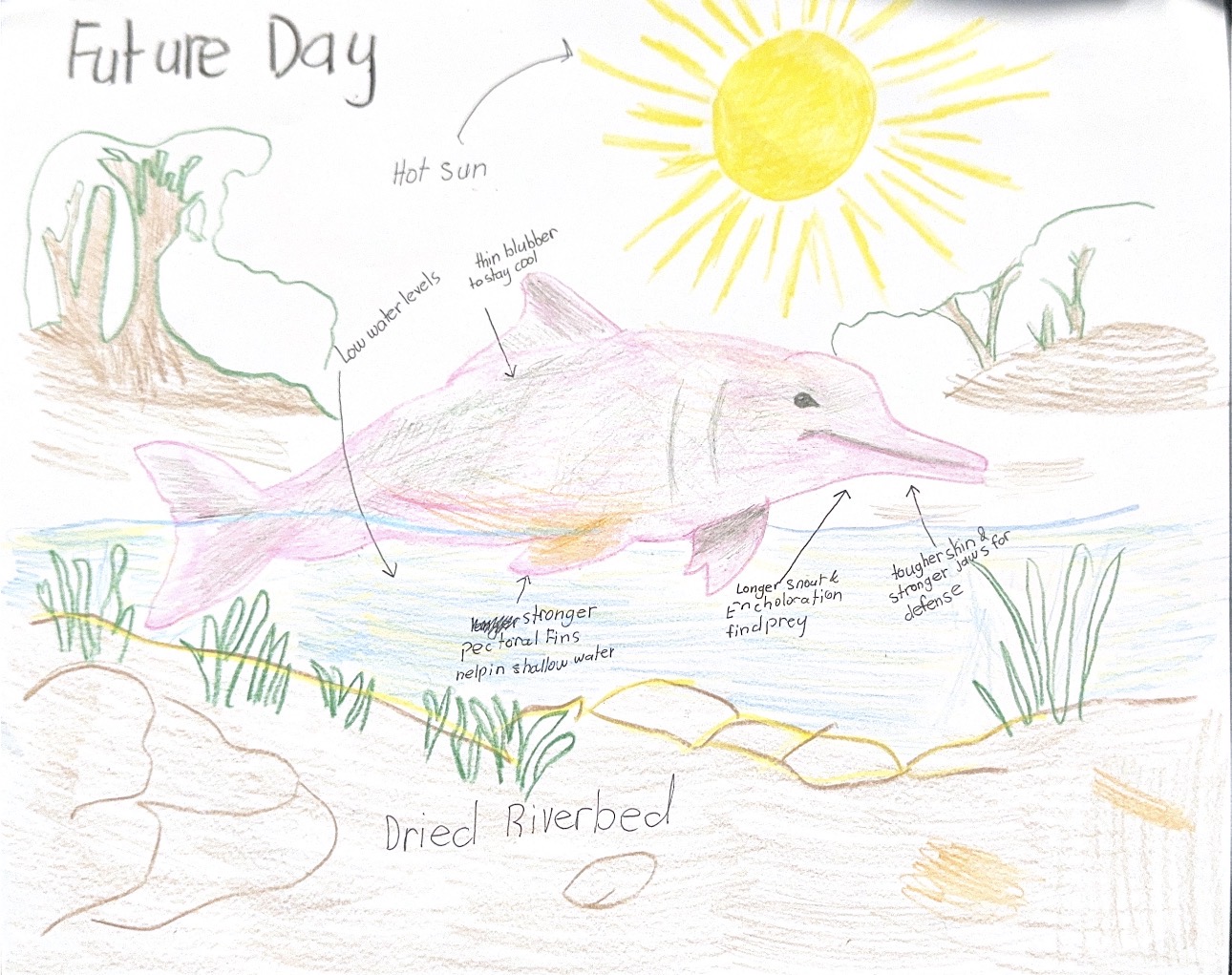 The Amazon pink dolphin lives in the freshwater rivers of the Amazon rainforest, mostly in northern Brazil. They swim through rivers, flooded forests, and small channels connected to the Amazon River. The dolphins have a long snout that helps them catch fish in muddy water and flexible fins that allow them to move easily through narrow rivers and around trees. In the future, climate change could warm the rainforest and lower water levels in some rivers. These changes can lead to the dolphins developing darker, thicker skin to protect themselves from stronger sunlight and polluted water. The dolphins may also grow larger fins to help them swim in shallow rivers. These adaptations could help the Amazon pink dolphin survive and evolve as the rainforest environment continues to change.