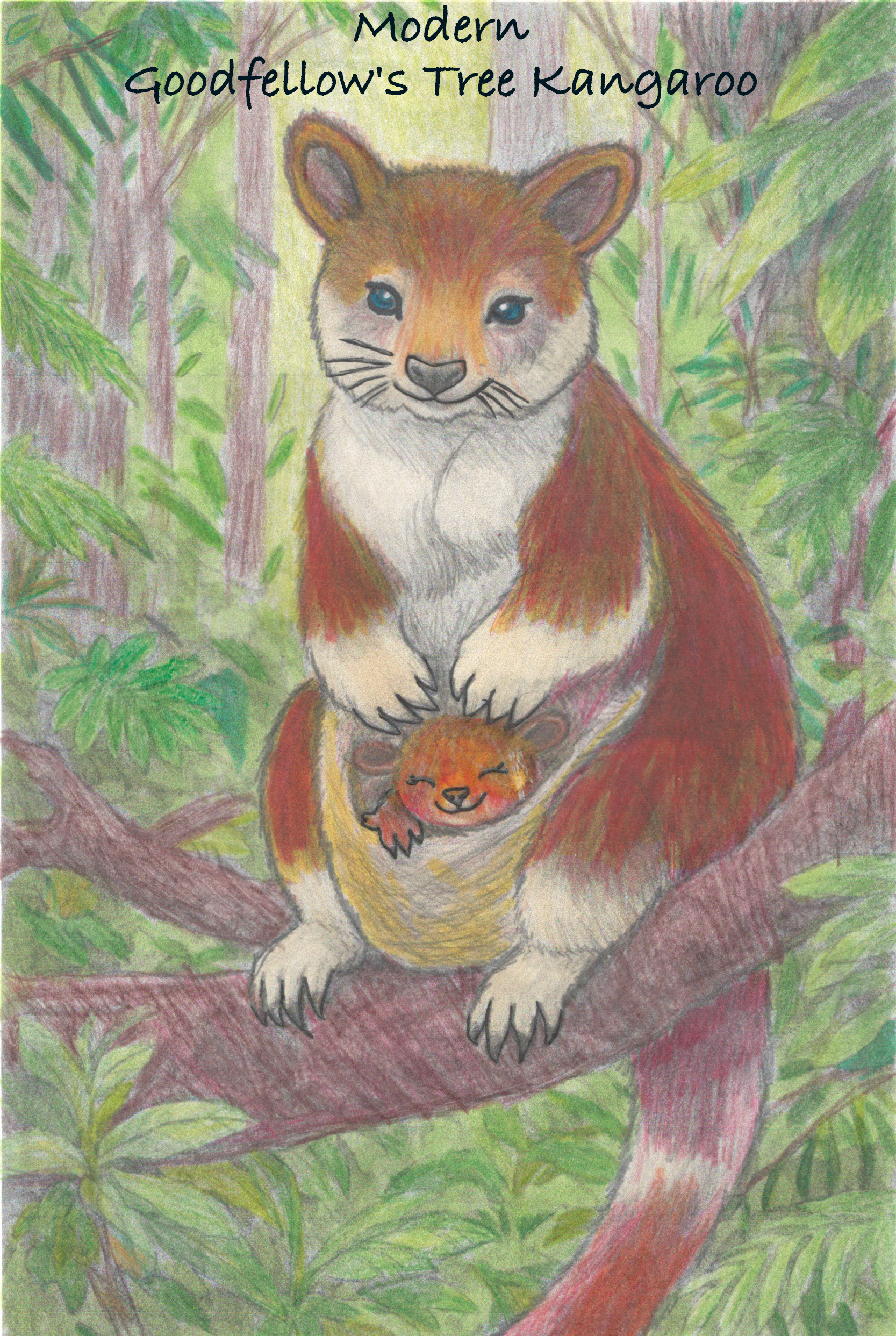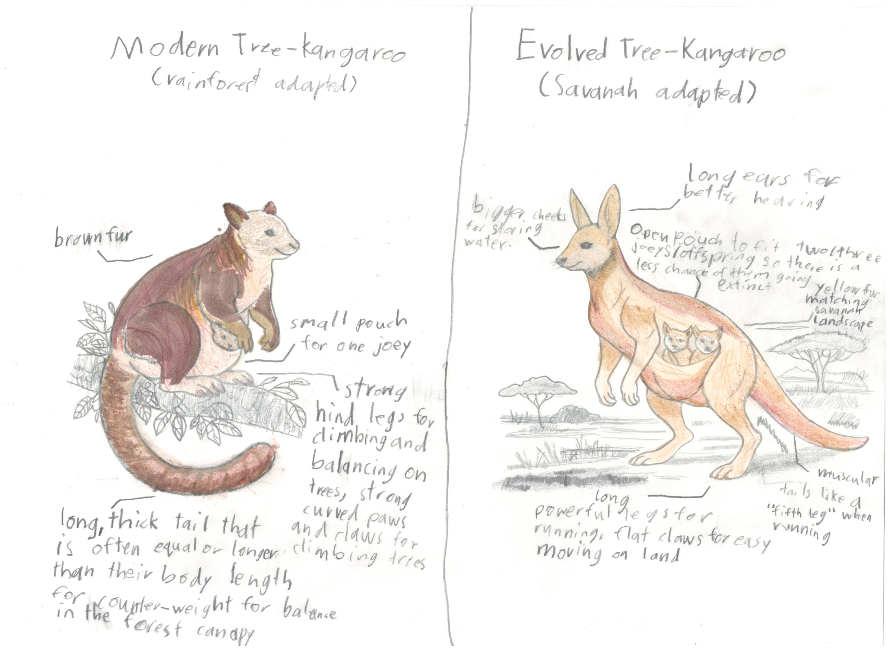 The Papua New Guinea Goodfellows Tree Kangaroo is known for its striking reddish-brown fur. Unlike ground-dwelling kangaroos in Australia, they are expert tree climbers with strong hind legs and curved paws for climbing trees, and long balancing tails. They are herbivores, which means their diet contains leaves (mostly from the Silkwood tree) and fruits. In a warming future, the Rainforest Tree Kangaroo will evolve to have yellow fur and live in the Savannah because there will be more severe droughts and a hotter climate. They will have long, powerful legs and a muscular tail that will act like a “fifth leg” when running. They will have an open pouch for two or three joeys, and flat claws for easy moving on land with the extra weight. The evolved Tree Kangaroo will now store water in their cheeks because there will be more droughts, so it will need bigger cheeks.