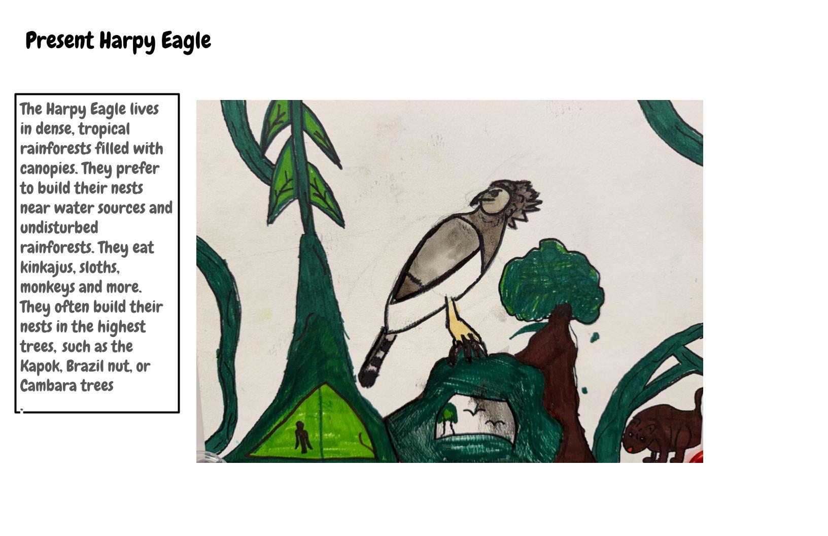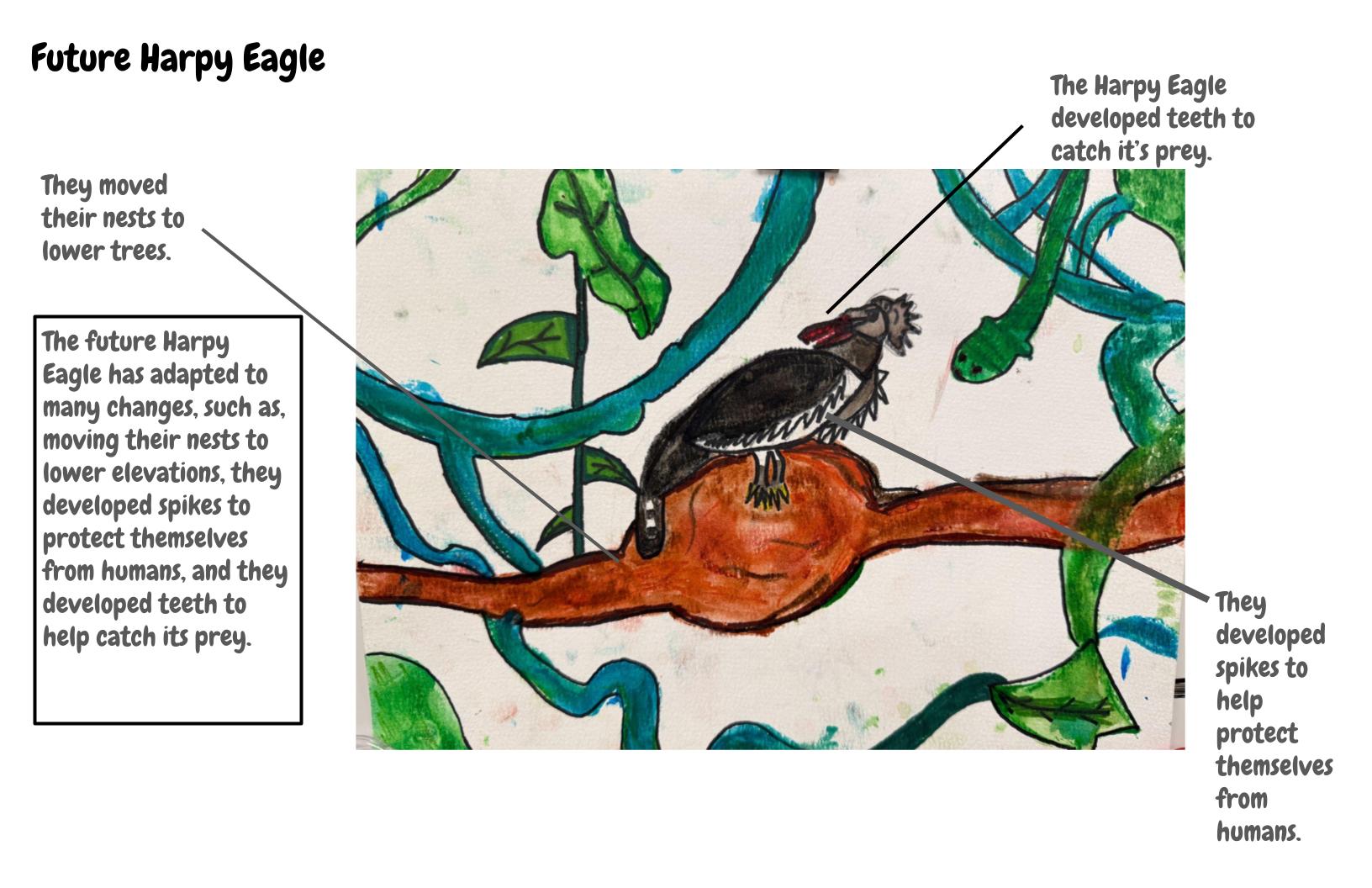 My animal is a Harpy Eagle. The Harpy Eagle lives in dense, tropical rain forests covered with canopies. Its habitat becomes fragmented. Humans are chopping down all the trees its nests are in. I created 3 adaptations to this problem.
