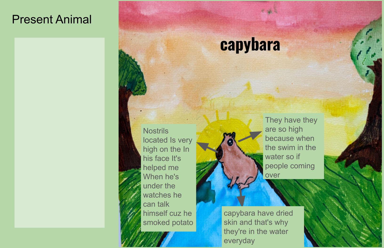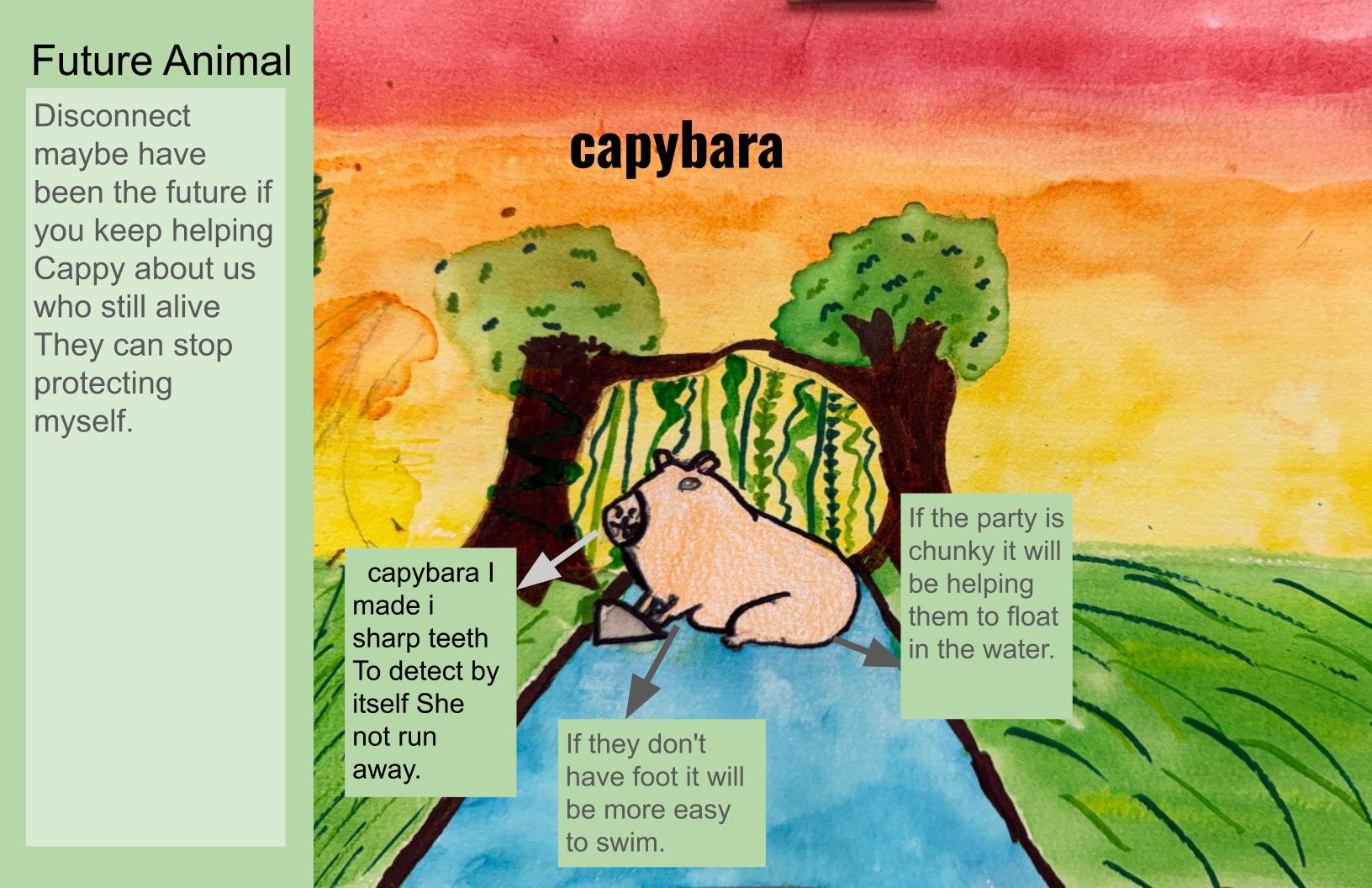 capybara have a big nose to when they go under the water they can smell of people okay that comes to and that's what the ice is on the top most of the time where they live at it's like water like lakes because this skin is so dry but with the species it can protect by yourself the skin is not going to get past dry and what feat it will help them to swim.