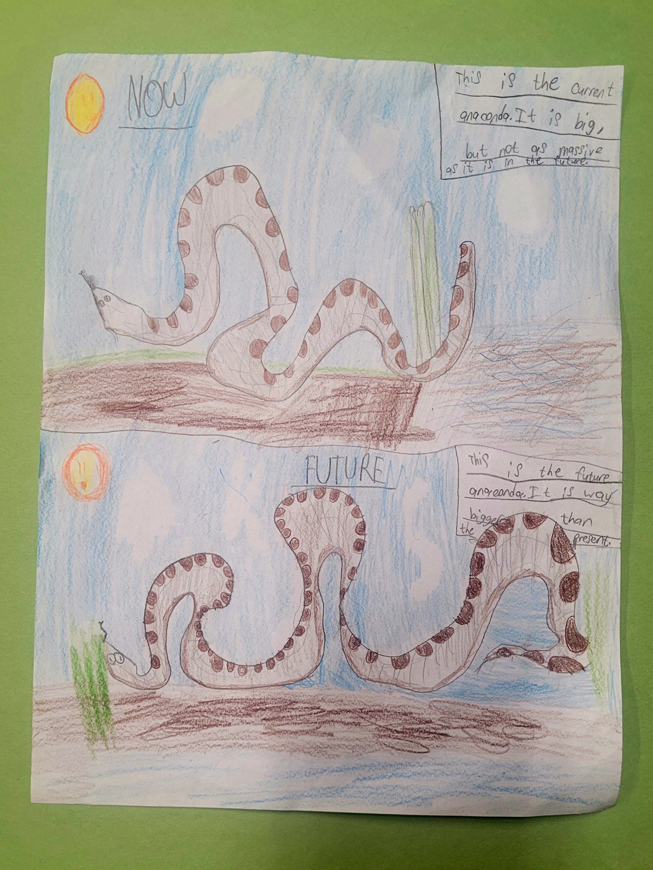 Soon, I estimate the anaconda will look like an even bigger snake because it eats a lot of food. It will look giant, like the normal one, but even bigger than it was before. They might grow too big to become endangered reptiles.