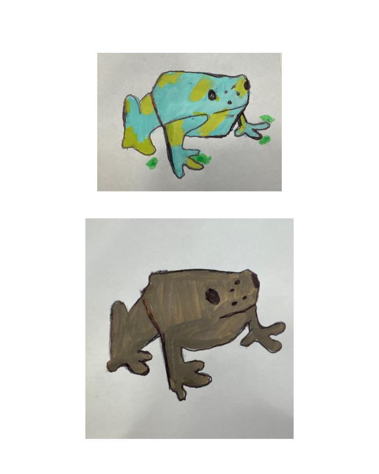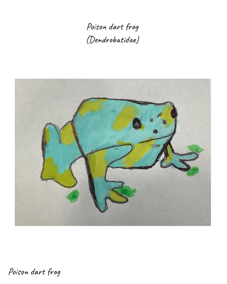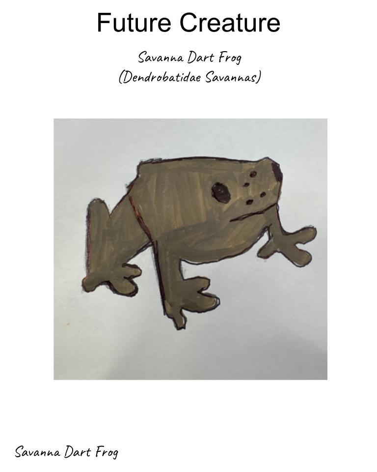 Poison dart frogs live in lowland tropical rainforests. They are aposematic, using their bright colors to warn predators that they are toxic. These toxins come from their diet of arthropods like ants and evolved from predation pressure from animals like the fire-bellied snake. Their niche is that of a small insect-eating predator within the rainforest food web, shaping their feeding behavior. They are also highly territorial, using vocal calls to display their strength. However, over the next 50 years, rainforests may become drier savannas due to climate change. The Savanna dart frog will evolve within that time to have a dull coloration for camouflage among grass and shrubs, as dietary changes would reduce the toxins that create their vibrant colors, aiding their survival and evolution. They would develop less permeable skin to prevent water loss in the drier conditions and become less territorial and more mobile to look for food.