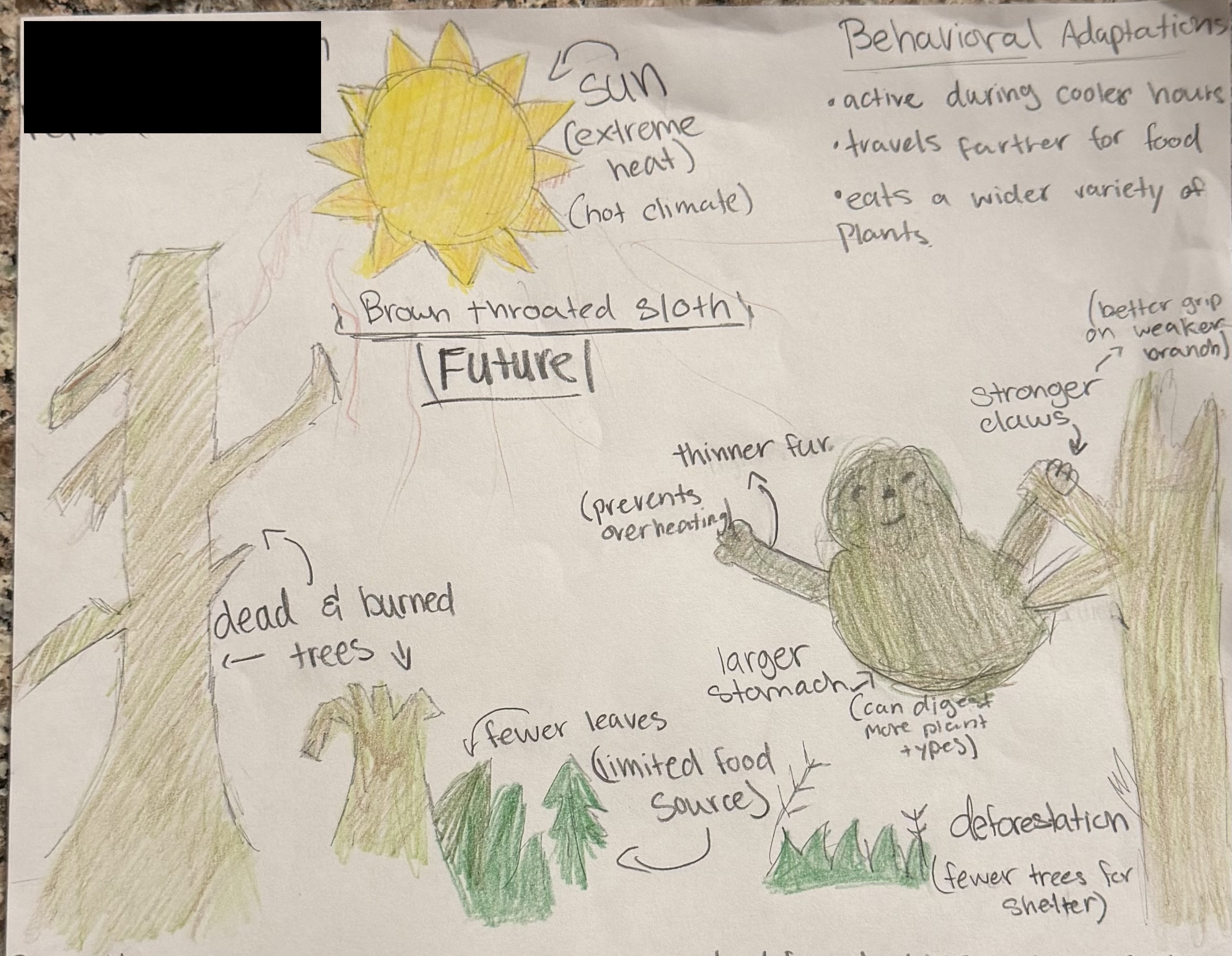 In the future, climate change and deforestation may make rainforests hotter, drier, and less dense. With fewer trees, sloths may need to travel farther for food and shelter. They could develop stronger limbs and claws to move between trees more easily. Their fur may become lighter and thinner to prevent overheating. If leaves become scarce, the sloth may adapt to eat different types of plants to survive.