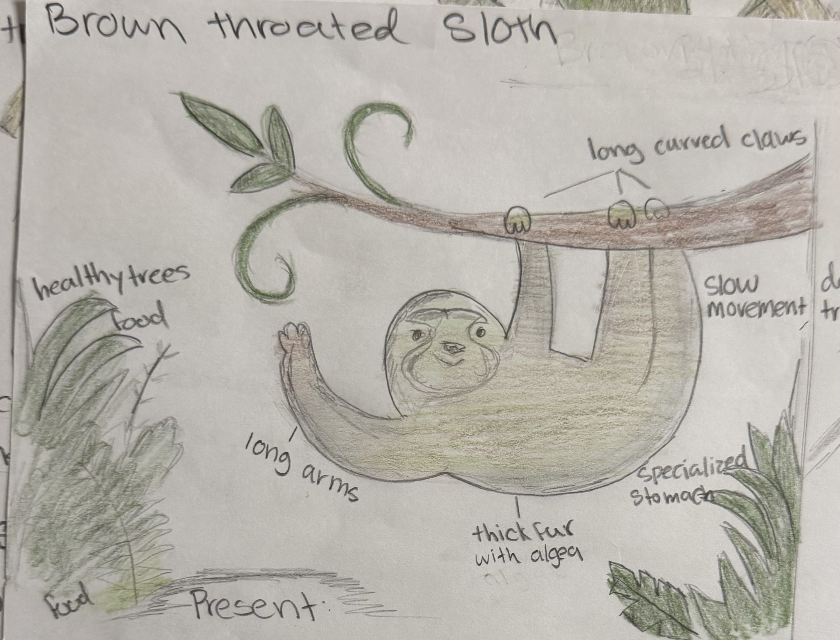 The Brown throated sloth lives in warm tropical rainforests in Central and South America. It spends most of its life high in tall trees, hanging from branches with its long, curved claws. Sloths move slowly to conserve energy and avoid predators. Their thick, brownish-gray fur sometimes grows algae, helping them blend into the forest. They mostly eat leaves and digest them slowly in their specialized stomachs.