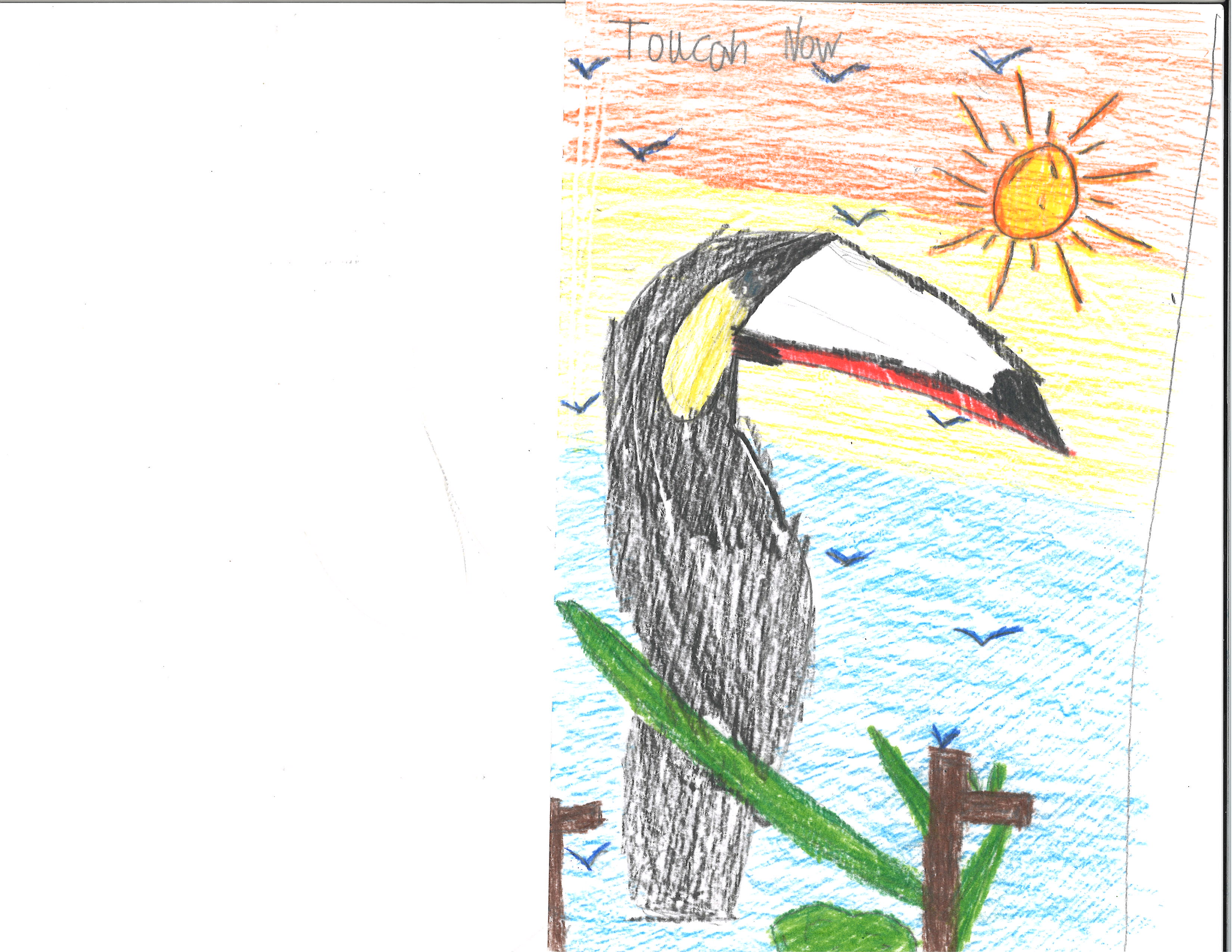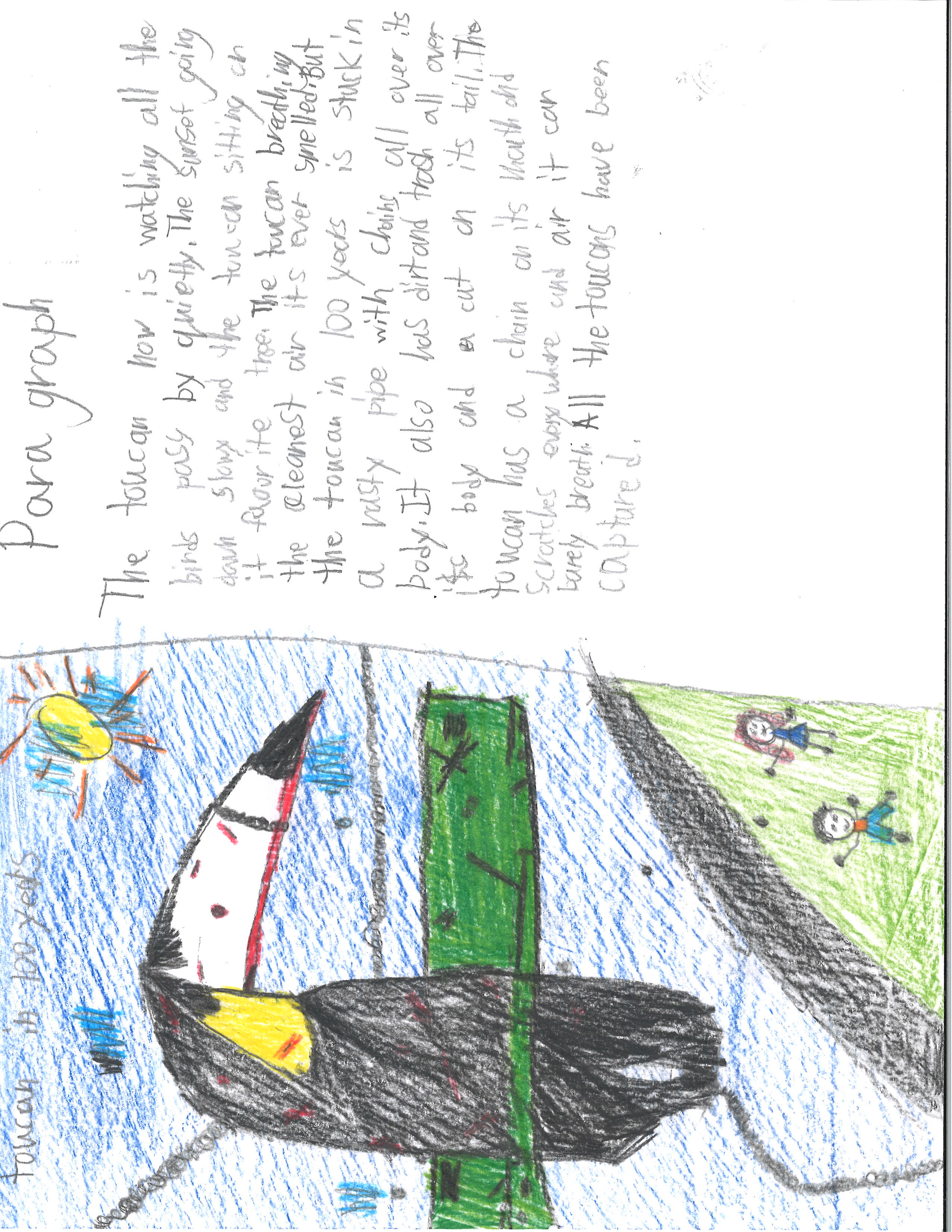 The toucan now is watching all the birds pass by quietly. The sunset going down slowly and the toucan sitting on its favorite tree. The toucan breathing the cleanest air its ever smelled. But the toucan in 1000 years is stuck in a rusty pipe with chains all over its body. It also has dirt and trash all over its body and a cut on its tail. The toucan has a chain on its mouth and scratches everywhere and air it can barely breathe. All the toucans have been captured.