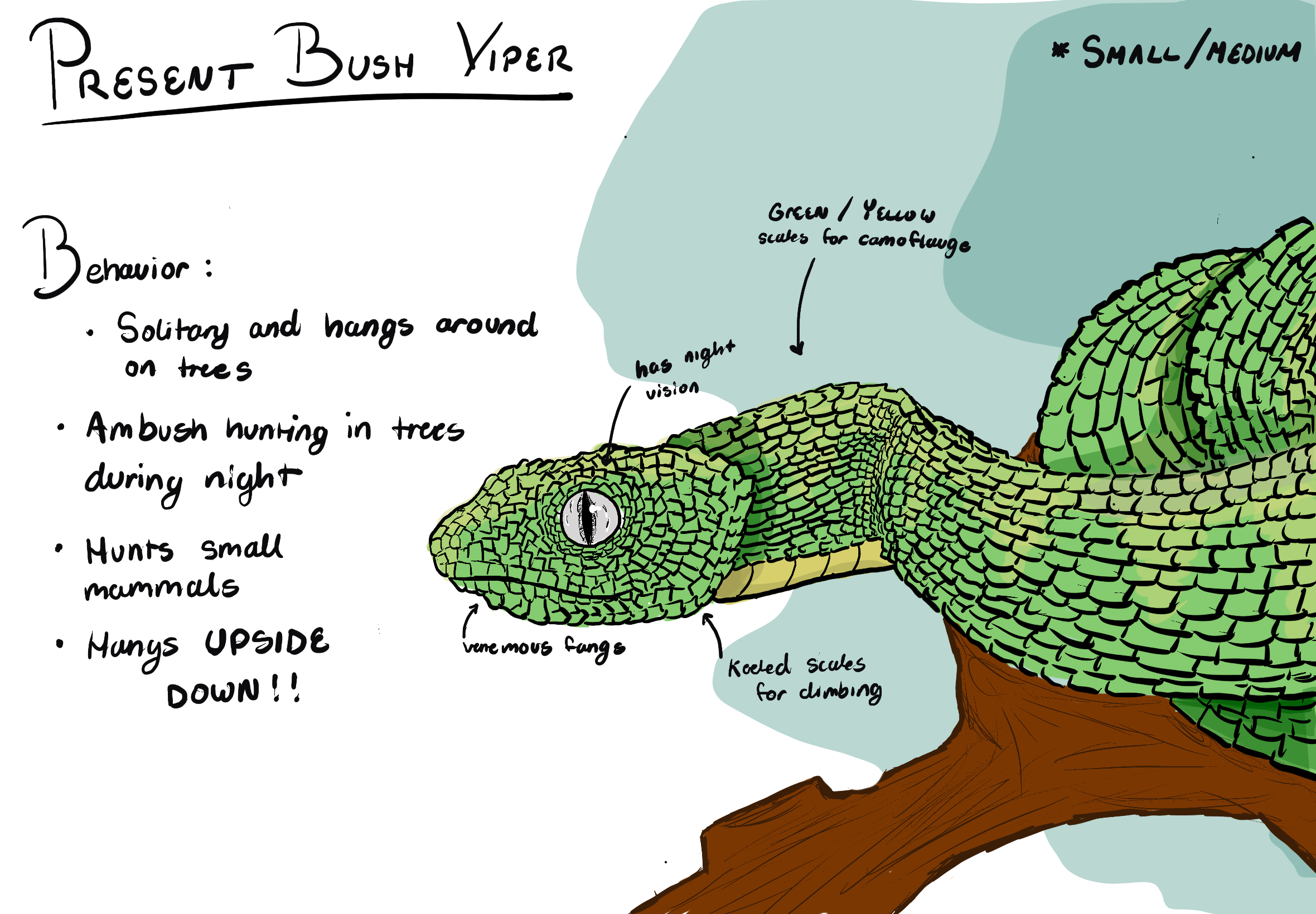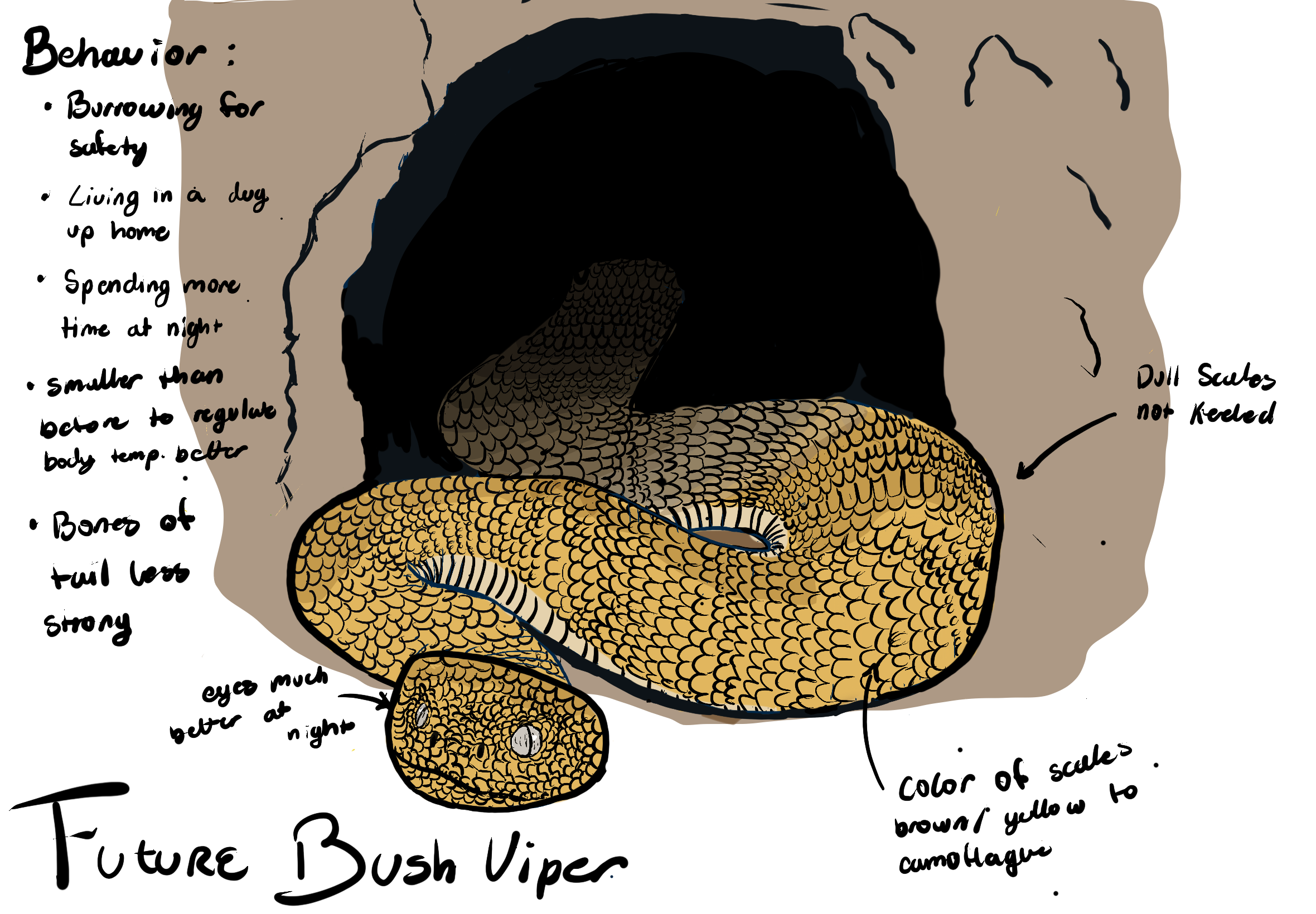 The Green Bush Viper (Atheris squamigera) is a venomous snake native to rainforests. Recognizable by its heavily keeled scales and broad head, it is an arboreal species with a prehensile tail. A nocturnal ambush predator, it delivers hemotoxic venom to small mammals, birds, and lizards. It gives birth to live young through viviparity. As deforestation and climate change alter its habitat, the Green Bush Viper may undergo dramatic transformations. Its heavily keeled scales could gradually smooth out, and its prehensile tail would likely weaken as it shifts from an arboreal to a ground-dwelling lifestyle. Its vibrant green coloration would probably give way to earthy browns and blacks, providing better camouflage on the dry forest floor. Driven by rising temperatures, it would burrow underground to escape heat, develop sharper night vision, migrate toward cooler elevations, and slowly trend smaller in body size over generations.