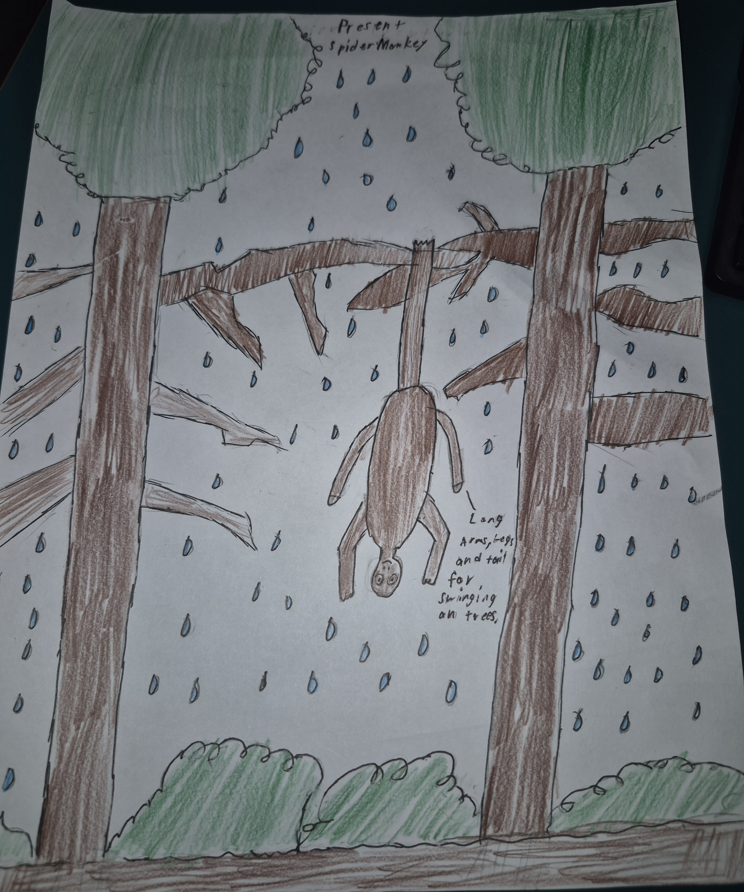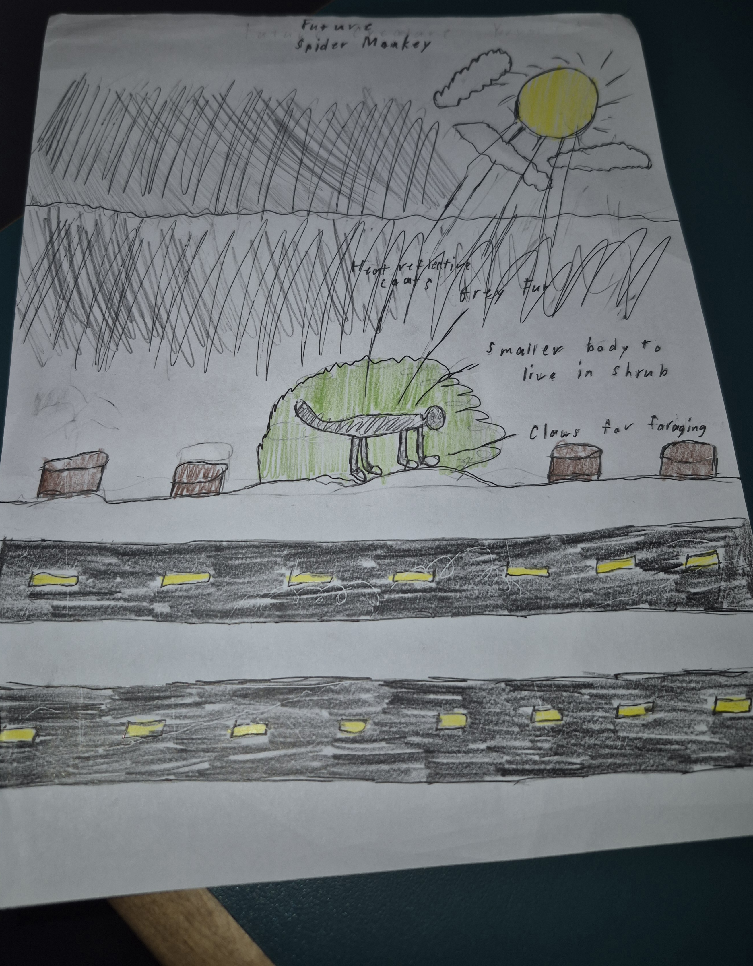 The creature I chose was the spider monkey. Right now Spider Monkeys have long limbs that they use for transporting through trees. They usually come in shades of beige. They use their tail like an extra limb. They are dealing with many problems coming in the future like deforestation, and climate change. So the adaptations I gave my spider monkey were smaller bodies, gray fur for camouflage, growing claws for ground foraging, adapting to a terrestrial, muscular lifestyle, and well as lighter, heat-reflective coats. I chose the fur since they won't be living in trees anymore. They are going to need camouflage to make hunting easier and hiding from preys. The heat reflectng coats will also help since trees are not protecting them from the sun. The claws will make it easier for them to hunt for food.