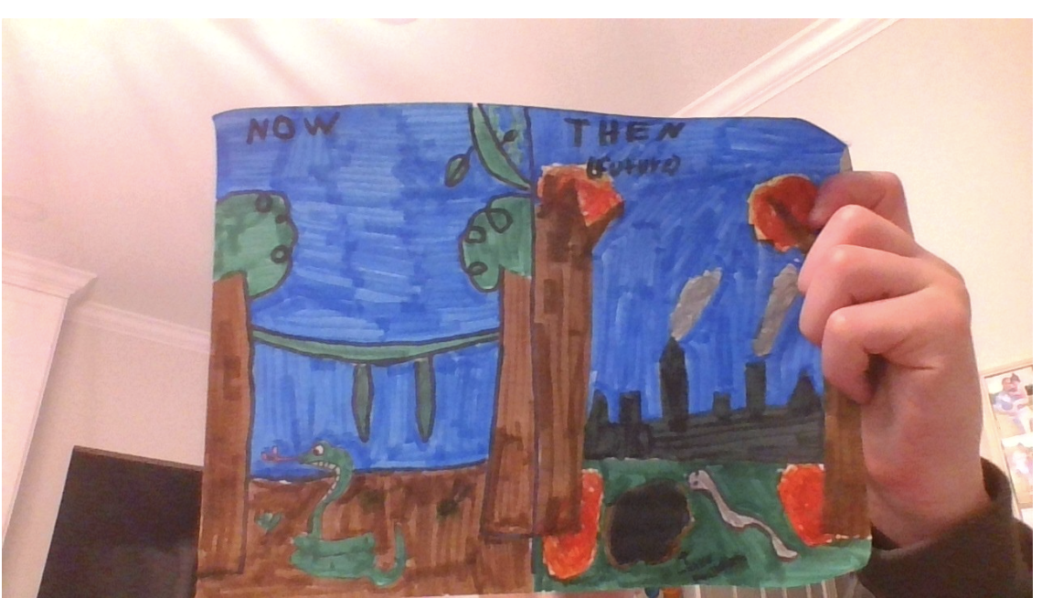 In my current image (the snake's current habitat) it shows a very healthy environment with a lot of healthy trees and leaves and the snake is thriving. I have small rodents next to my snakes which is a sign of food. In my then or future drawing, it shows that the snake is now resting and weak because of all the air pollution and smog. Next to the snake is a little pond of water that is polluted causing it to change color and making it so it’s not safe for the snake to drink. There have also been fires created by human activity. The color of the snake blends in with its surroundings so it is hard to see the snake, this means the snake adapted to its surroundings to protect itself from other animals and humans. Humans which invaded the snake's environment and set boundaries for the snake.