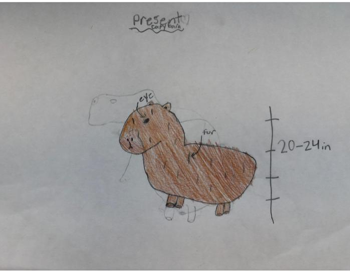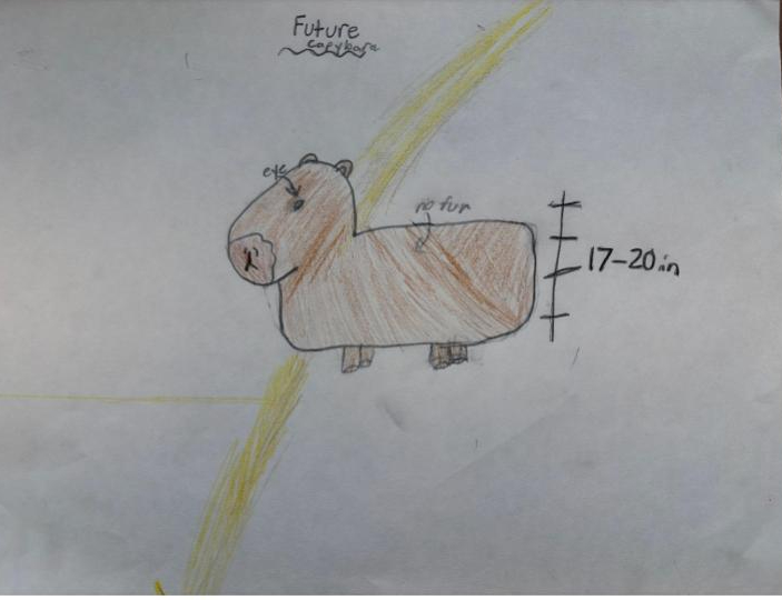 The capybara has a diet of grasses,sedges,reeds,and water hyacinths.Capybaras have the ability to submerge for up to 5 minutes to escape from predators.The capybara has webbed feet for swimming it also has eyes and ears.They use their semi-aquatic nature relying on water as a quick escape route.The weather is hot and wet.They share Jaguars,Caimans,and anacondas in their habitat.The plants are zizaniopsis,bonariensis,and other grasses. In the future the rainforest will probably become a savanna and the capybara will be the color of sand to blend in and hide from predators and will eat termites and ants.The capybara will have hard skin to protect itself from predators and it will have no fur. It will become shorter so it can dig and hide in sand better.