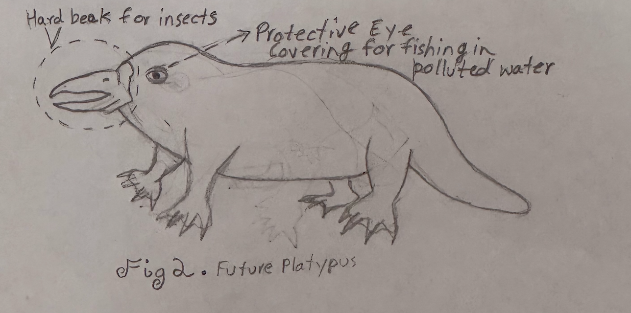 The platypus is a semi-aquatic egg laying mammal. It lives in the eastern part of Australia, in wetlands, freshwater rivers and ponds. They eat small fish, aquatic invertebrates and sometimes amphibians, using their bill. In approximately 100,000 - 5,000,000 years from now, they will switch to land hunting because of the pollution in the rivers and deforestation in the wetlands, their bills will evolve into a beak for a wider variety of foods. The beak will still allow them to eat invertebrates, but it will also allow them to eat insects, small animals and carrion. The platypus bill of today is a soft leathery compound with thousands of electroreceptors and mechanoreceptors to help the platypus fish underwater without seeing. The platypus might get a secondary layer of protection over their eyes to be able to look underwater and the beak will turn tough, to circumvent pollution.