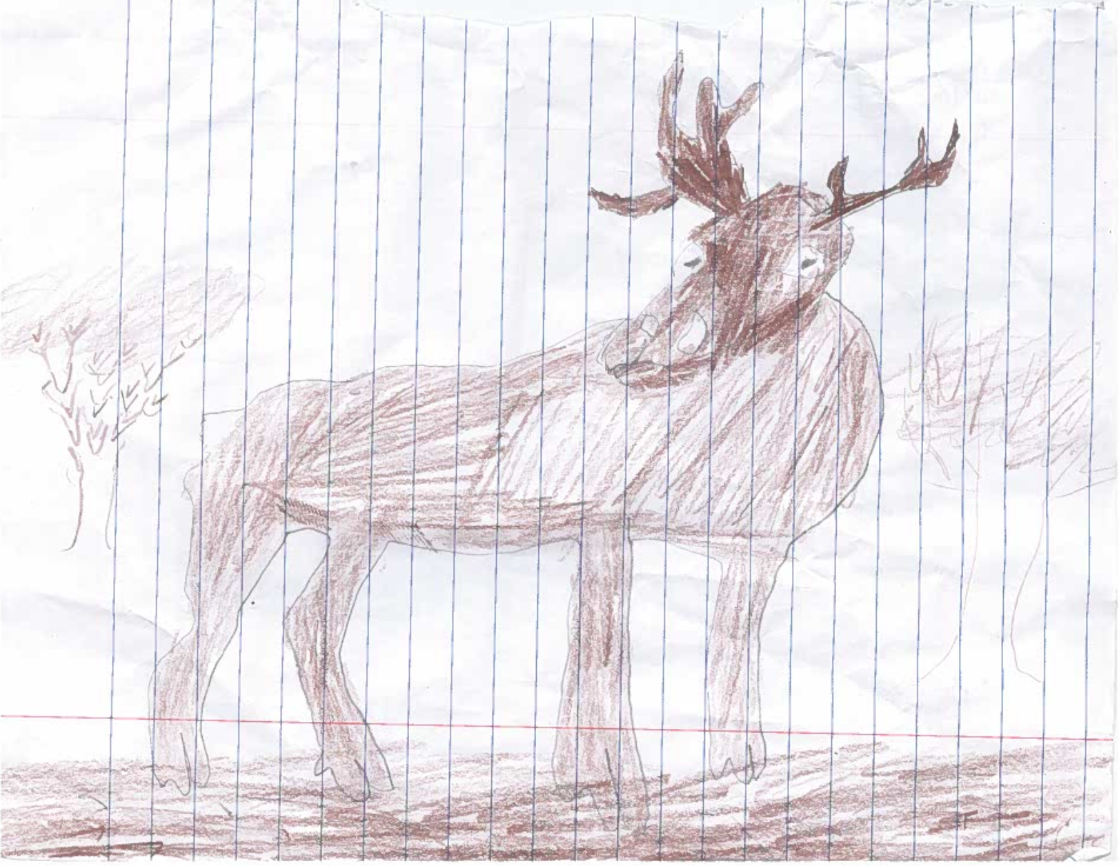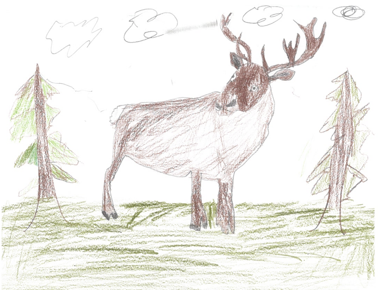 The animal I have chosen to illustrate in the present day, and in the future predicted habitat is the Mountain Caribou. My present day illustration shows a mountain caribou in a dense, snowy evergreen forest, which is its current habitat. The dark brown coat and the shape of the hooves are adaptations for moving through the deep snow and foraging in the underbrush. These traits also provide camouflage. My illustration of the mountain caribou in the future shows a caribou adapted to a savanna, with a lighter coat for camouflage in the grasslands. The caribou is longer, and has more slender legs. The caribou is smaller, so it can move faster, and be more agile to escape predators.