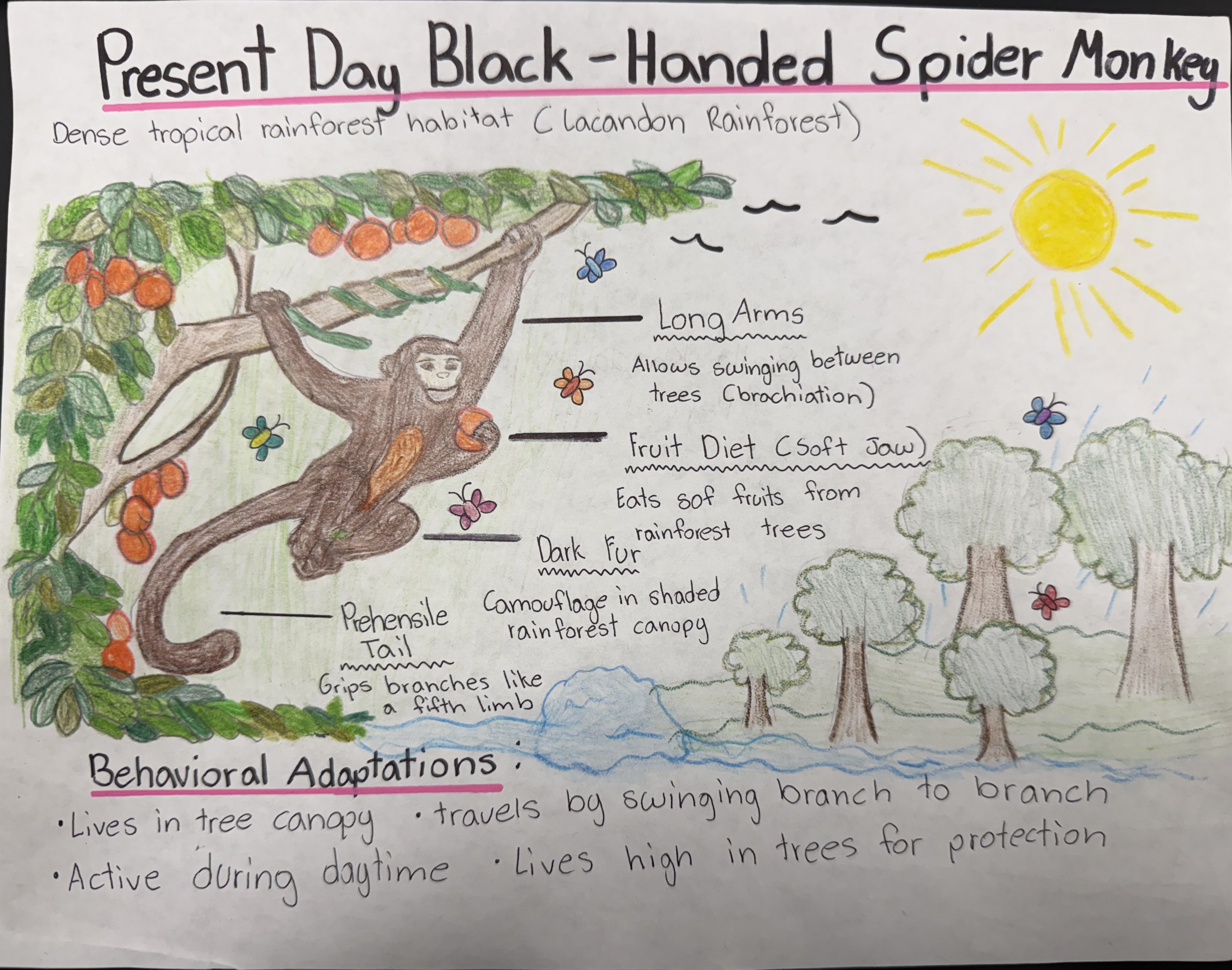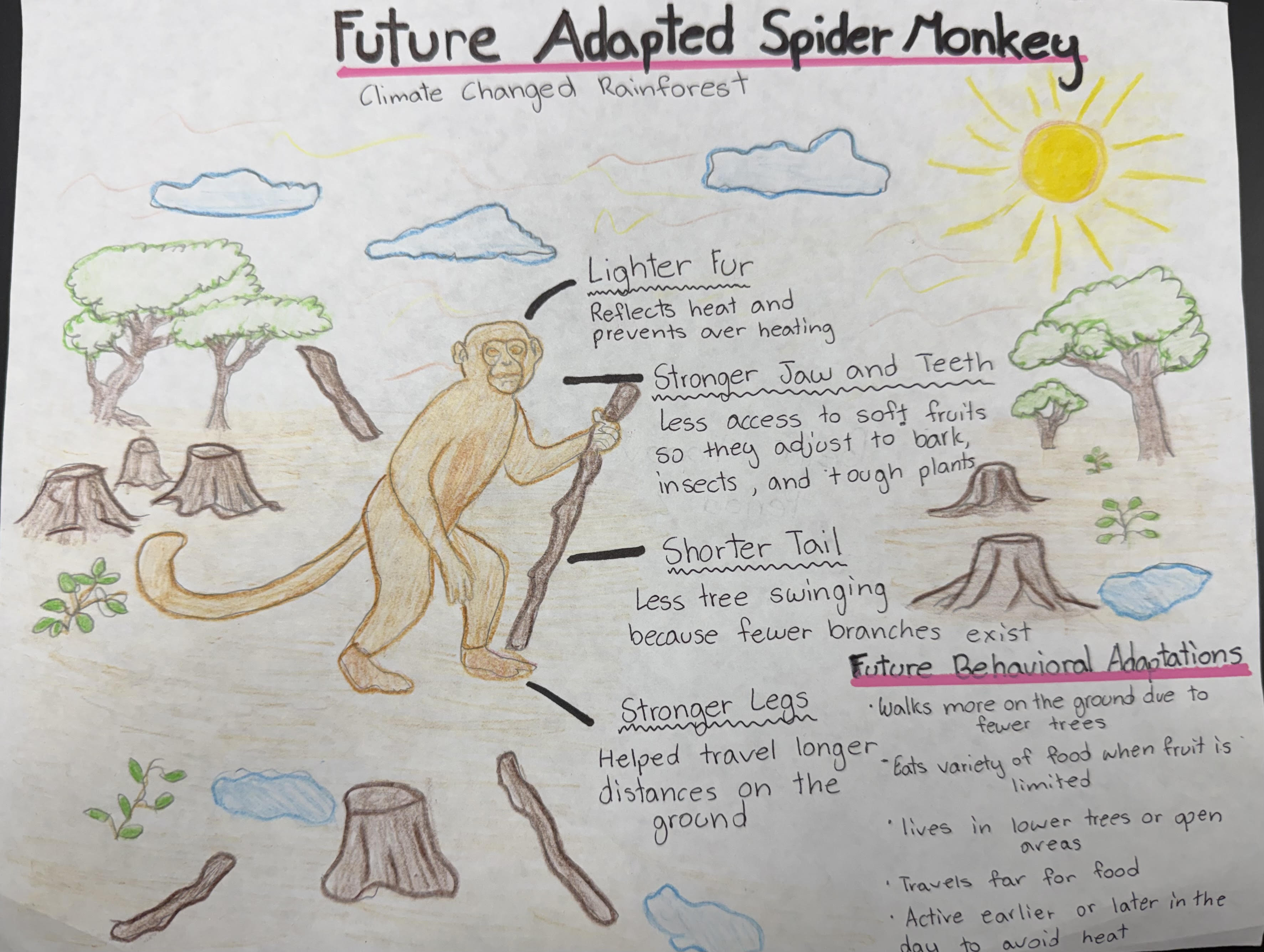 In my future illustration, the spider monkey has lighter fur to reflect heat and prevent overheating in warmer environments. Its legs are stronger to allow longer travel across the ground when trees become farther apart. Because fruit may become less available, the monkey develops a stronger jaw and teeth to be able to eat tougher foods such as bark, insects, and hard plants. The tail becomes shorter because swinging between branches becomes less common. These adaptations help the spider monkey survive in a hotter, more open rainforest environment.