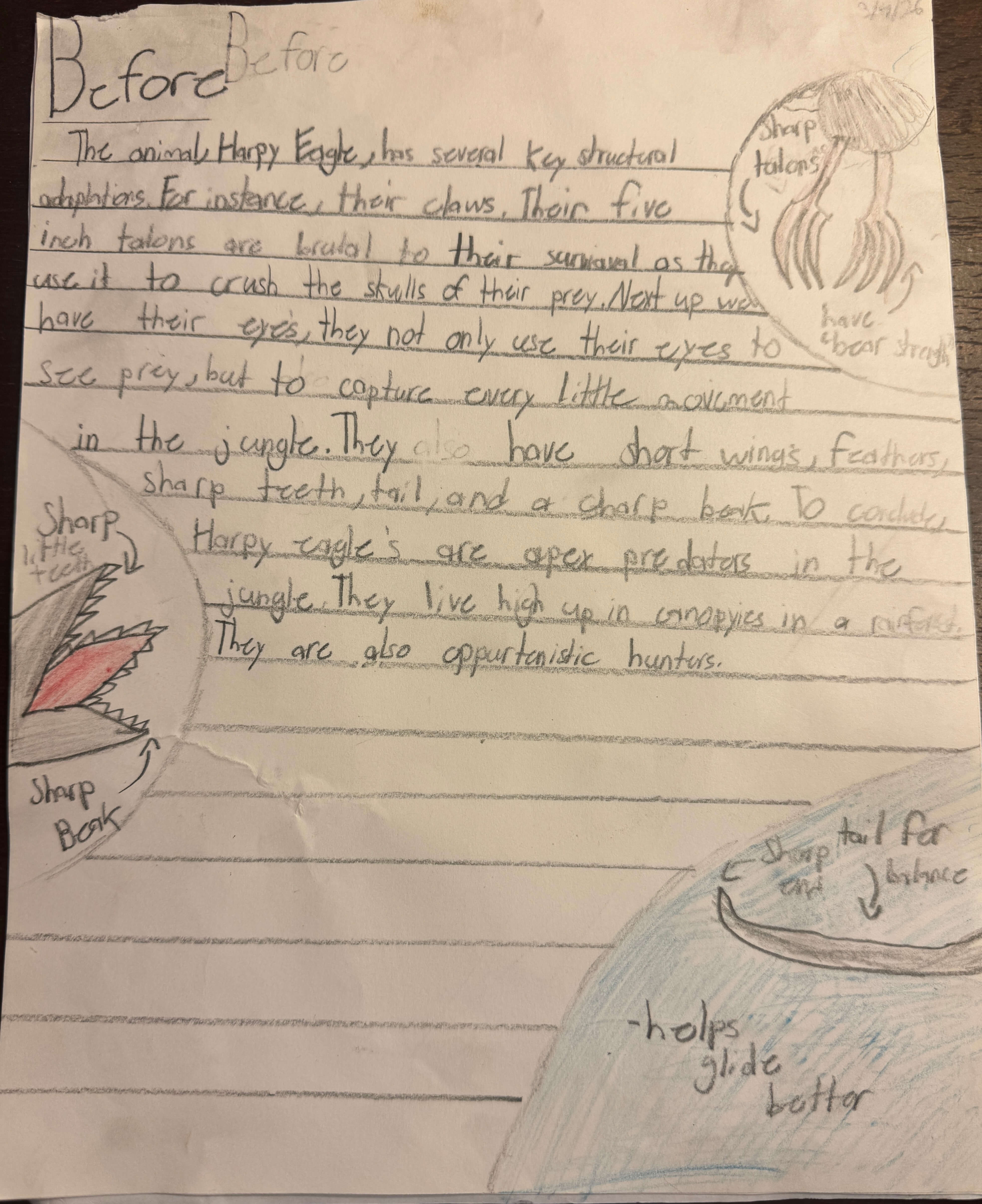 The animal, Harpy Eagle, has several key structural adaptations. For instance, their claws. Their five inch talons are brutal to their survival as they use it to crush the skulls of their prey. Next up, we have their eyes. They not only use their eyes to see prey, but to capture every little movement in the jungle. They have short wings, feathers, sharp teeth, tail, and a sharp bark. To conclude, Harpy Eagles's are the apex predators in the jungle. They live high up in canopies in a rainforest. They are also opportunistic hunters.