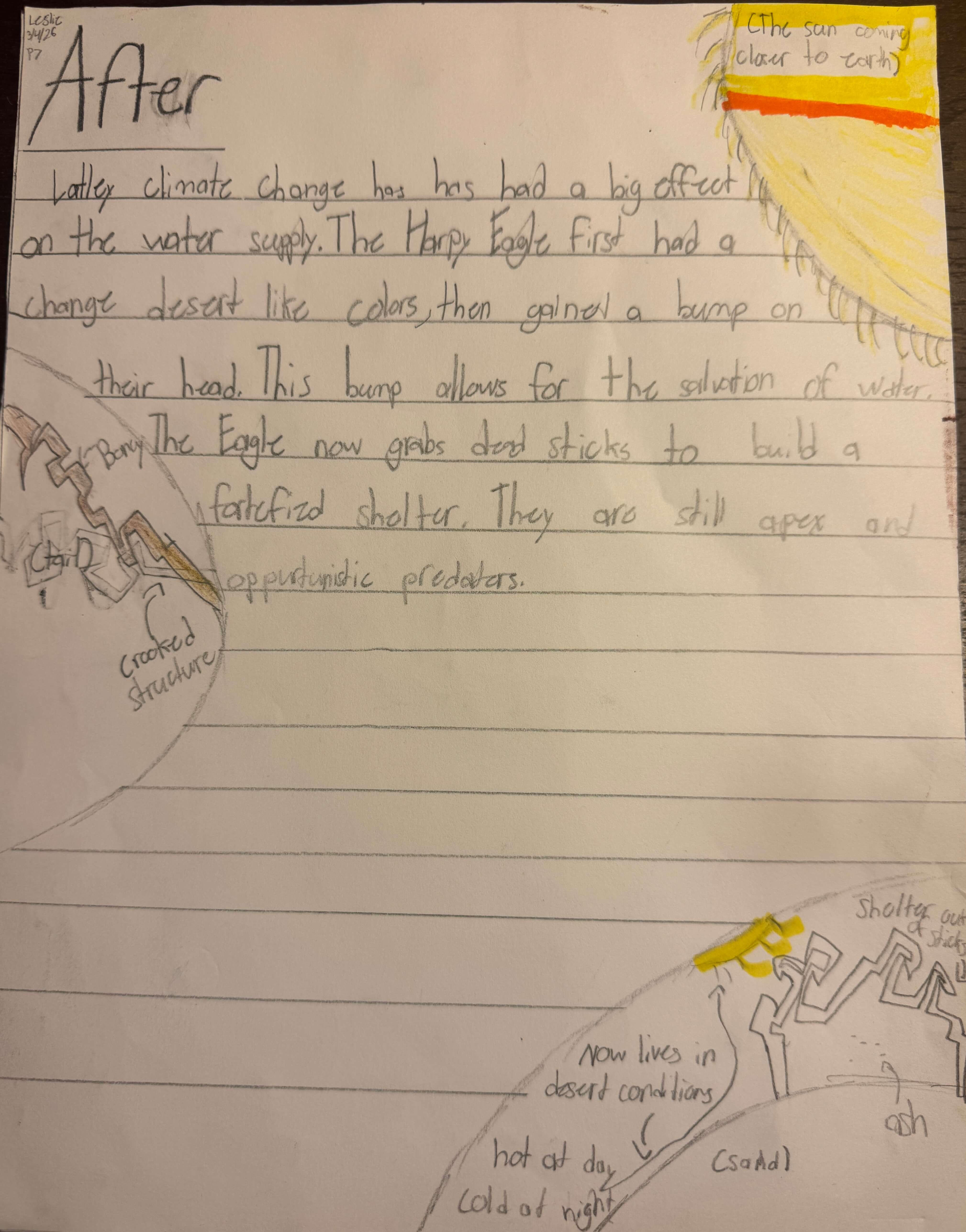 Lately climate change has had a big effect on the water supply. The Harpy Eagle first had a change of desert like colors, then gained a bump on their head. This bump allows of the salvation of water. The eagle now grabs dead sticks to build a fortified shelter. They are still apex and opportunistic predators.