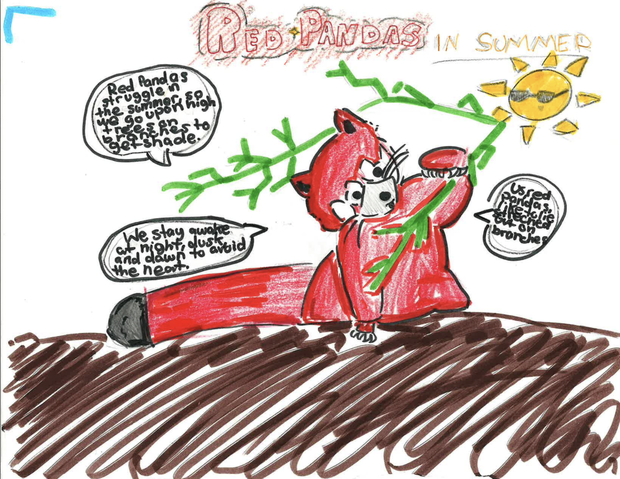 In summer: Red pandas go on branches to get shade. Red pandas usually eat bamboos and bamboos are still their main food, they eat fruits, flowers, and acorns in the hot heat.