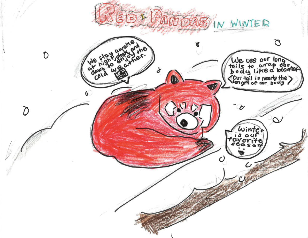 In winter: Red pandas like the nice and cold weather. Red pandas use their tail to wrap themselves like a blanket. Red pandas do NOT hibernate. They still eat bamboo in winter.