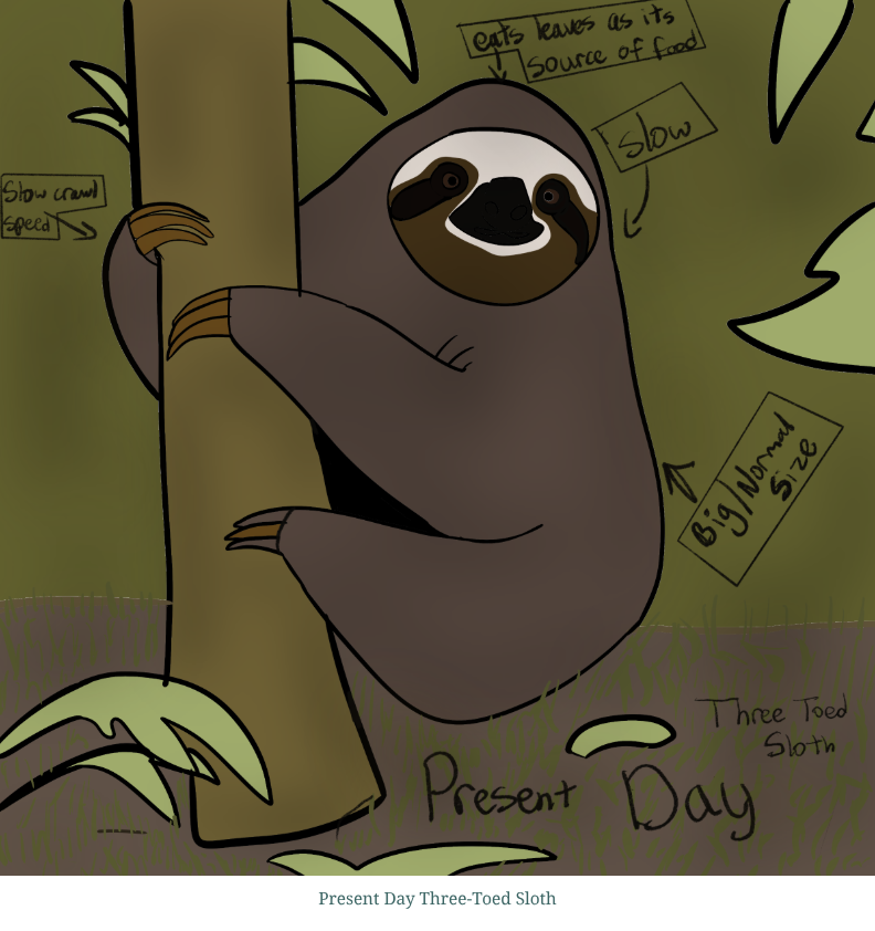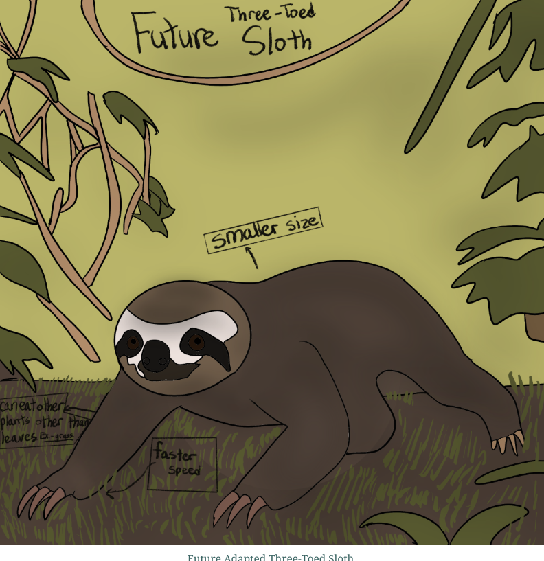 The Three-Toed Sloth is an animal that lives in Central and South America. The future sloth is smaller than normal, it's faster, and its diet expanded to more types of greens other than leaves. The sloth having a smaller body and an expanded diet helps it need less food and energy, which is important if food becomes scarce because of droughts and global warming. They’ll also have stronger and faster legs since there may be fewer trees closer together due to deforestation and the sloth would need the speed to travel faster on the ground to not get eaten by predators.