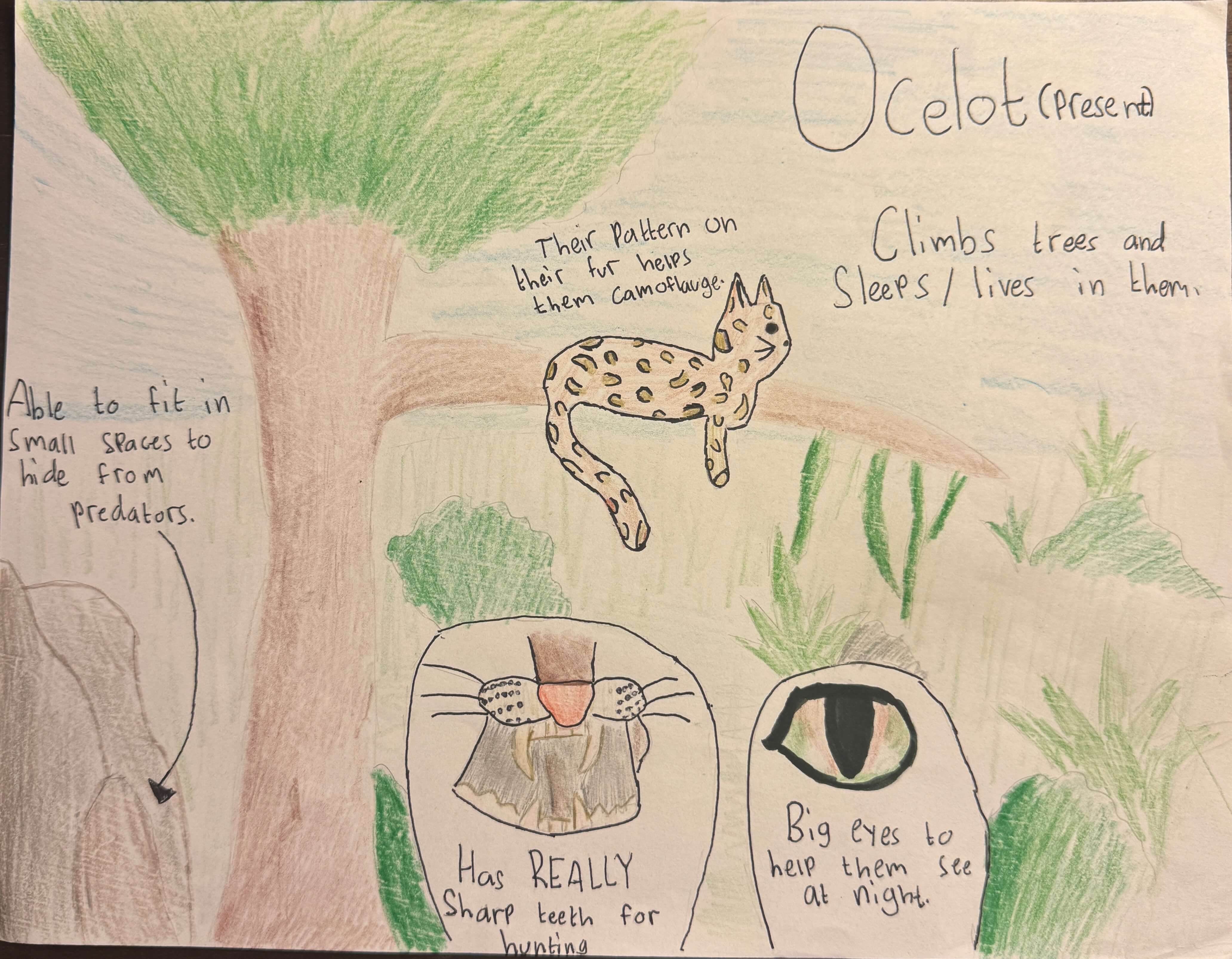 Ocelots in present time are nocturnal. They love in rainforests of central and South America. They're excellent swimmers. To hunt at night, they have really big eyes. They're able to hide in tiny spaces. You usually see them in trees. They sleep, climb and live in trees. They're a medium sized cat and carnivore. They prey on spider monkeys. To avoid competition, they defend their territory.