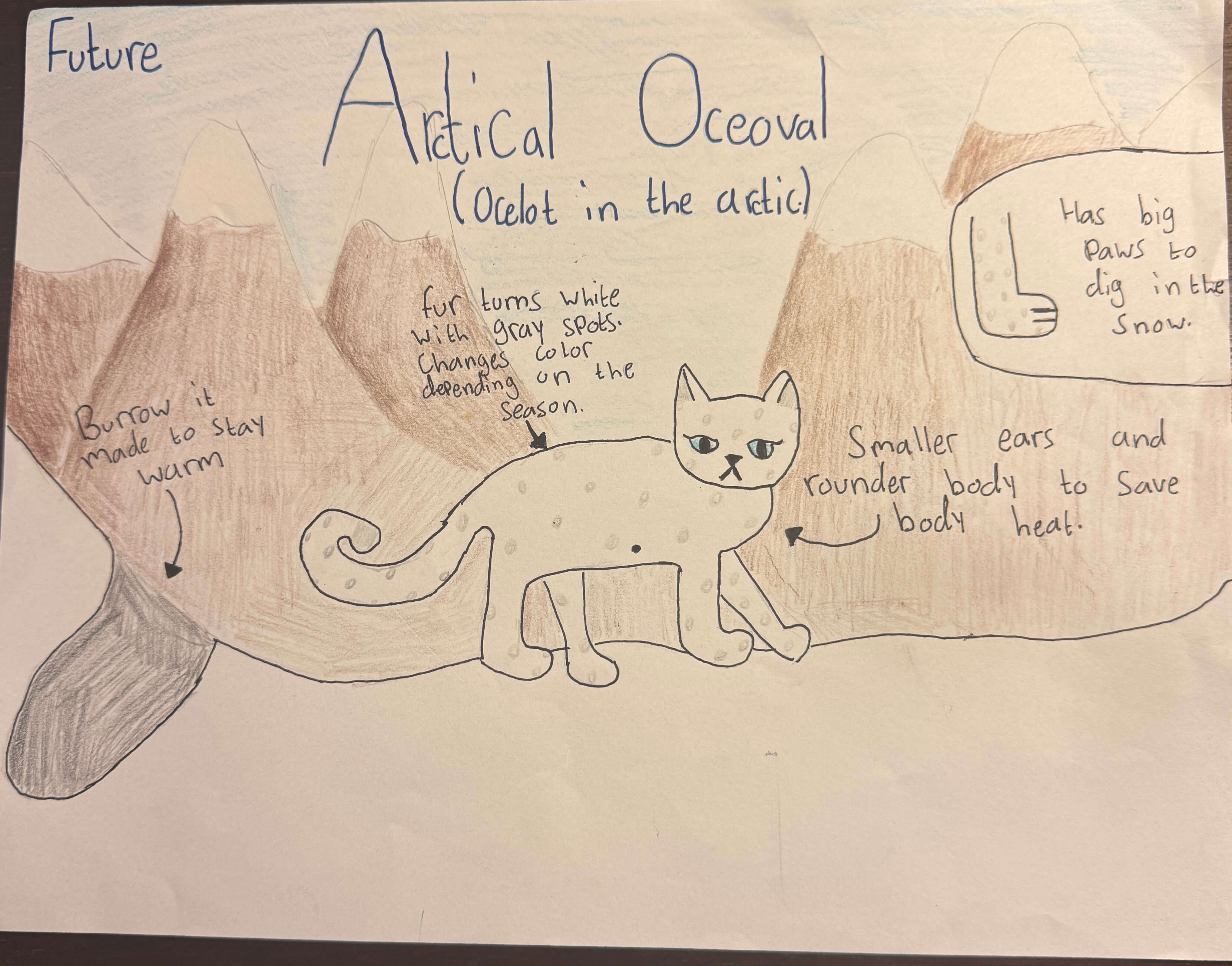 Ocelots in the arctic would be called Artical Oceoval. They would have white fur with grey spots camouflage with the snow. Their fur will change colors depending on the season. Their fur is very thick, especially on their paws to stay warm. When they're sleeping, their tail wraps around them and starts to heat up like a heat warmer. They're diurnal and a scavenger who eats fish. Since it's harder to find food, they can fast for long periods of time.