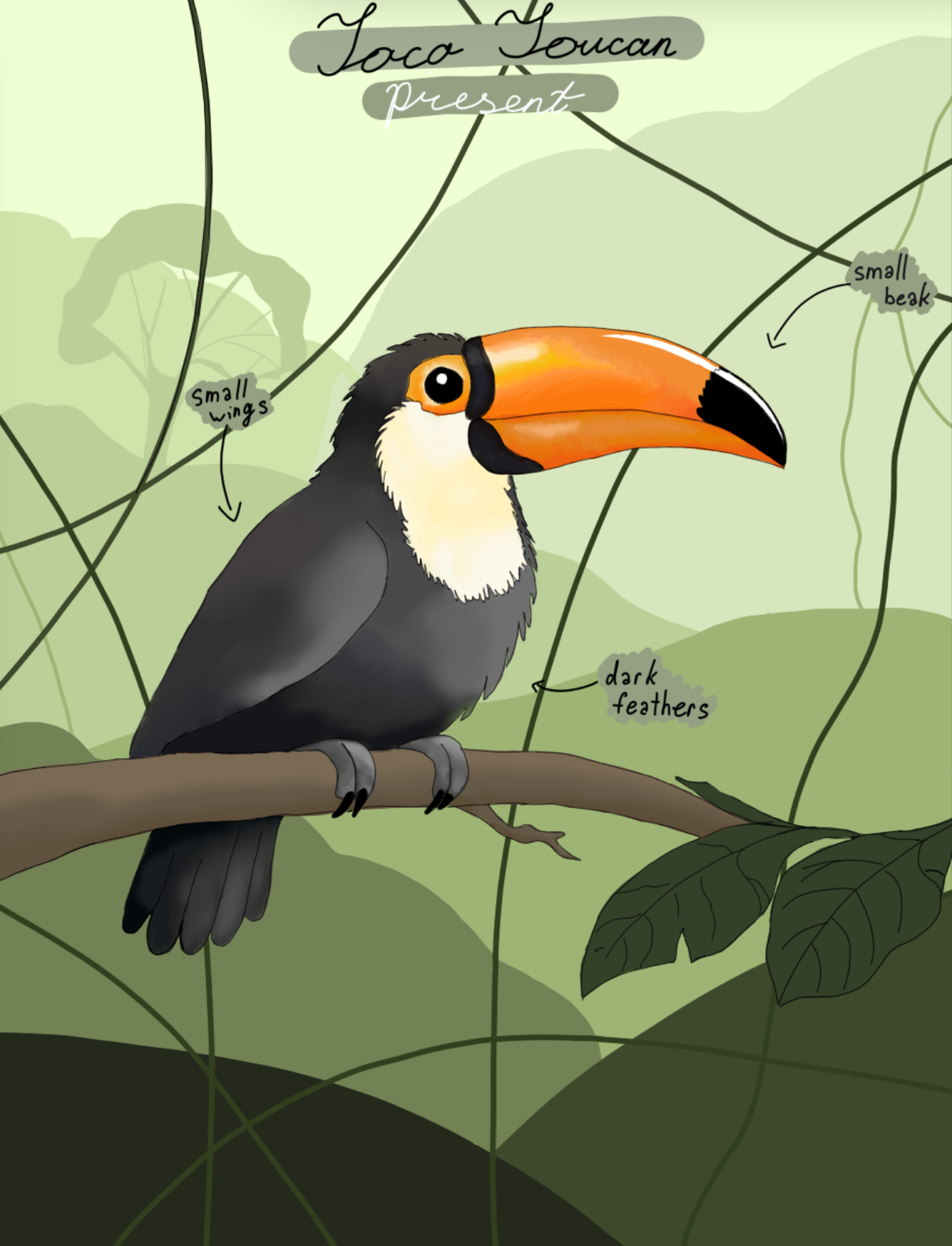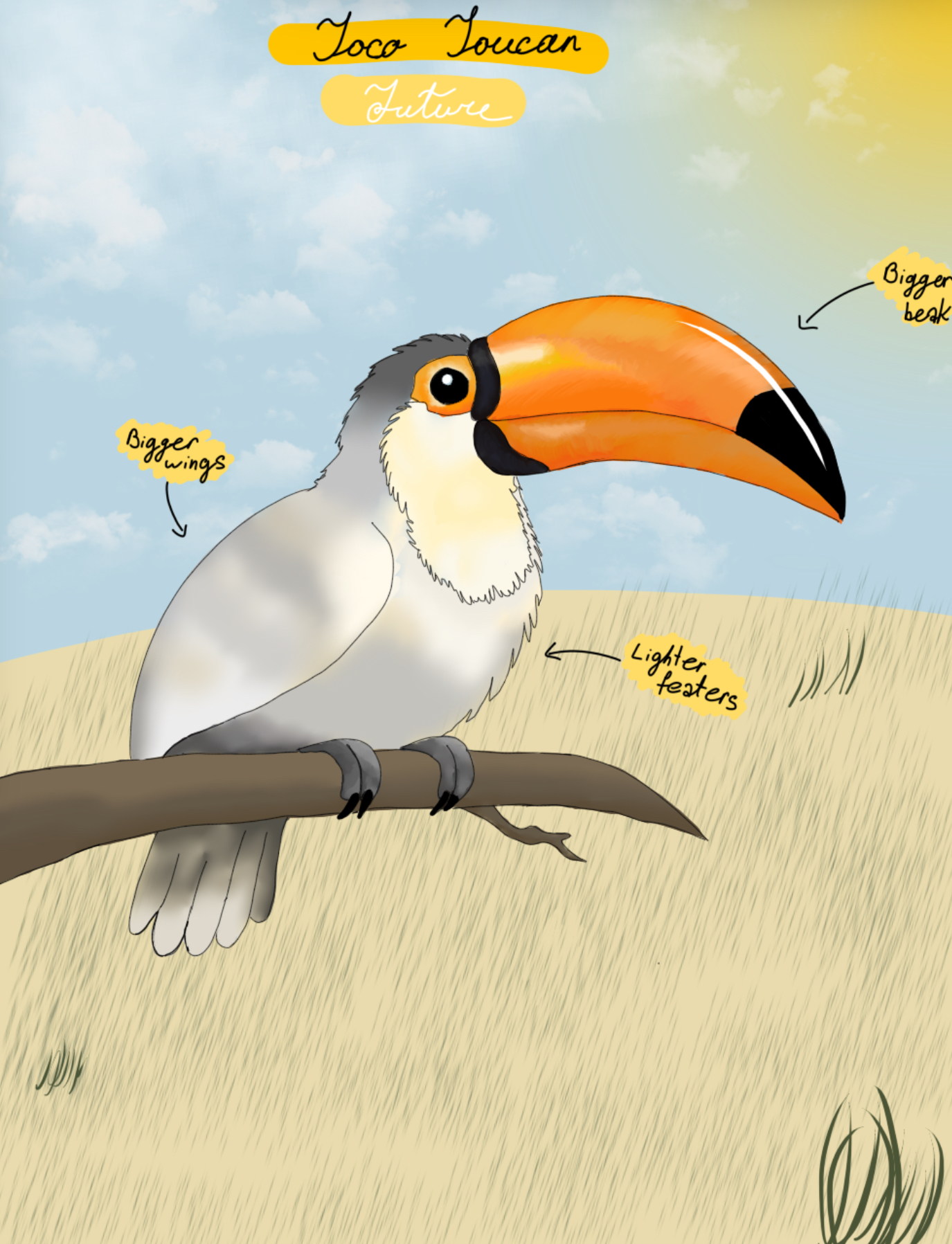 In my opinion, over some time the climate in the Amazon rainforest will become hotter. The toucans might get much bigger beaks, which will help them to stay cool during those hot days by releasing cool air . Another thing that might change is the color of their feathers. They might become lighter, mostly white to reflect the sunlight. After those changes they might also develop stronger wings so they can travel longer distances.