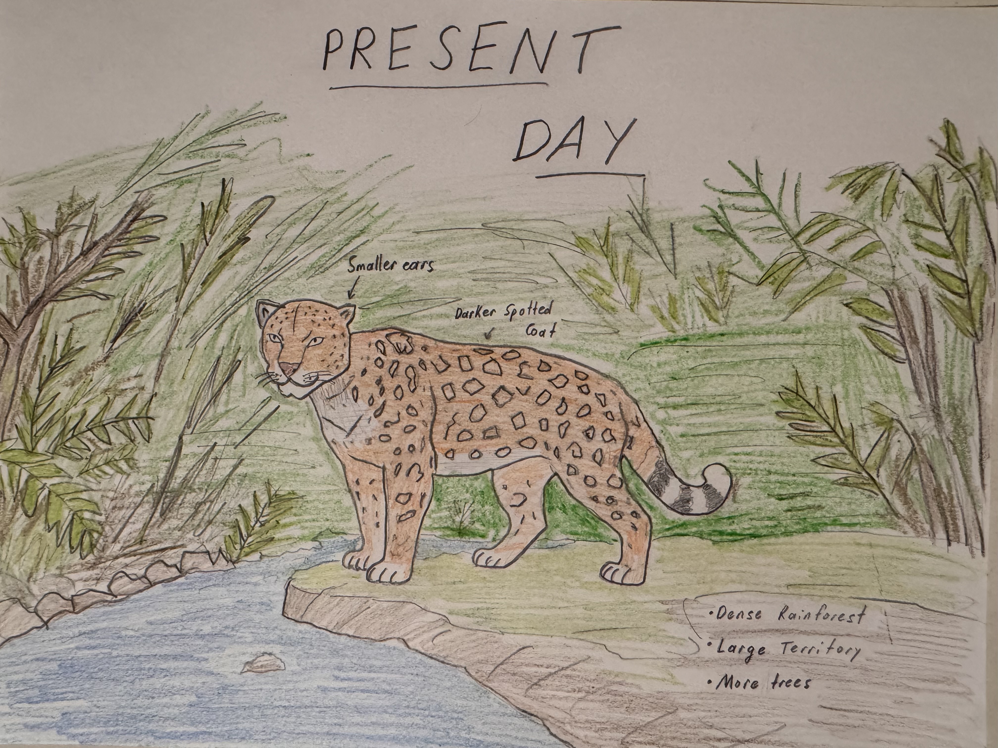 The jaguar(Panthera onca) adapted to environmental changes caused by climate change in it's rainforest habitat. As temperatures increased and parts of the rainforest became drier and more open, the Jaguar developed lighter, thinner fur that helps it stay cool and blend into dry glass and woodland. It's ears became larger, which helps release body heat and prevents overheating in the hotter climate. The jaguar also evolved longer legs and a leaner body, allowing it to travel greater distances to find food and water as resources became more spread out. In addition, it adapted it's behavior by hunting more at night to avoiddaytime heat. Its diet became more varied, allowing it to survive even when its usual prey became scarce. These adaptations helped the Jaguar survive and continue living in a changing environmental.