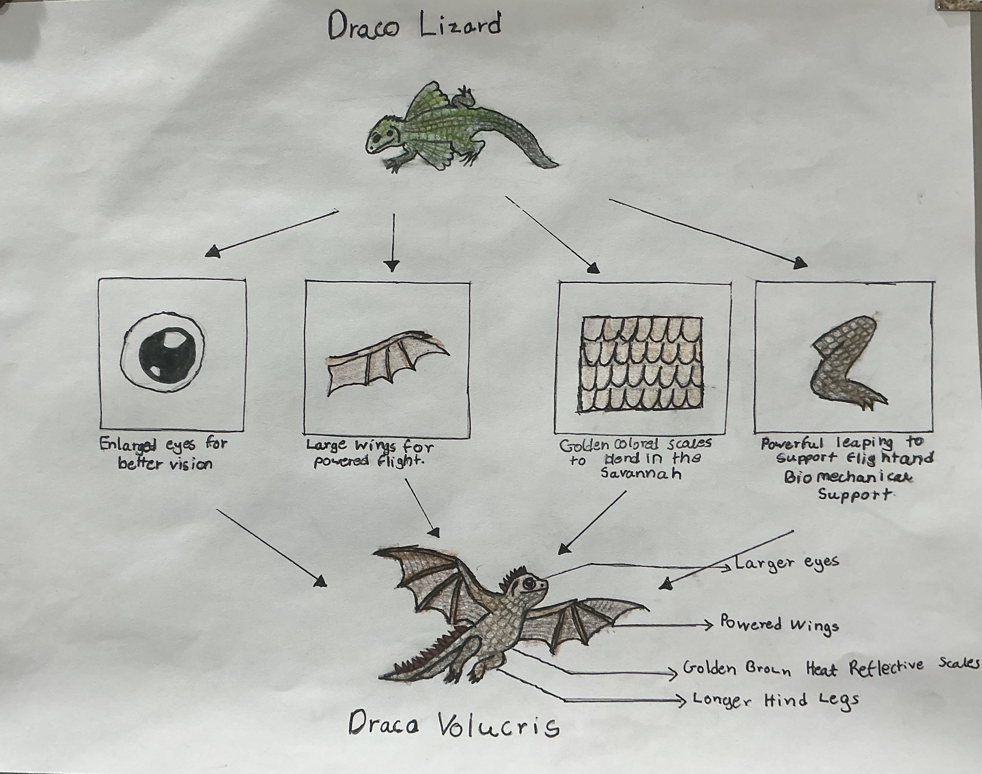 The Draco Lizard, which is native to the rainforests and tropical lands of Southeast Asia.In the rainforest there are tall trees, humid weather, and plenty of insects to eat. Its small size, green/brown camouflage, and gliding membranes that are between its ribs allow it to move easily from tree to tree,avoid predators and suited for its environment. After thousands of years, environmental changes like rising temperatures, sea level rise, pollution due to human activity, and habitat fragmentation transform the habitat of rainforests into a savanna with reduced rainfall. The trees become scarcer and the lands become less humid like a savannah. The Adapted version of the Draco lizard, evolves into Draco Volucris,a winged reptile capable of of powered flight, heat reflective golden golden scales for camouflage, longer hind legs for launching into flight and larger eyes to thrive in a hotter, drier and more open world.
