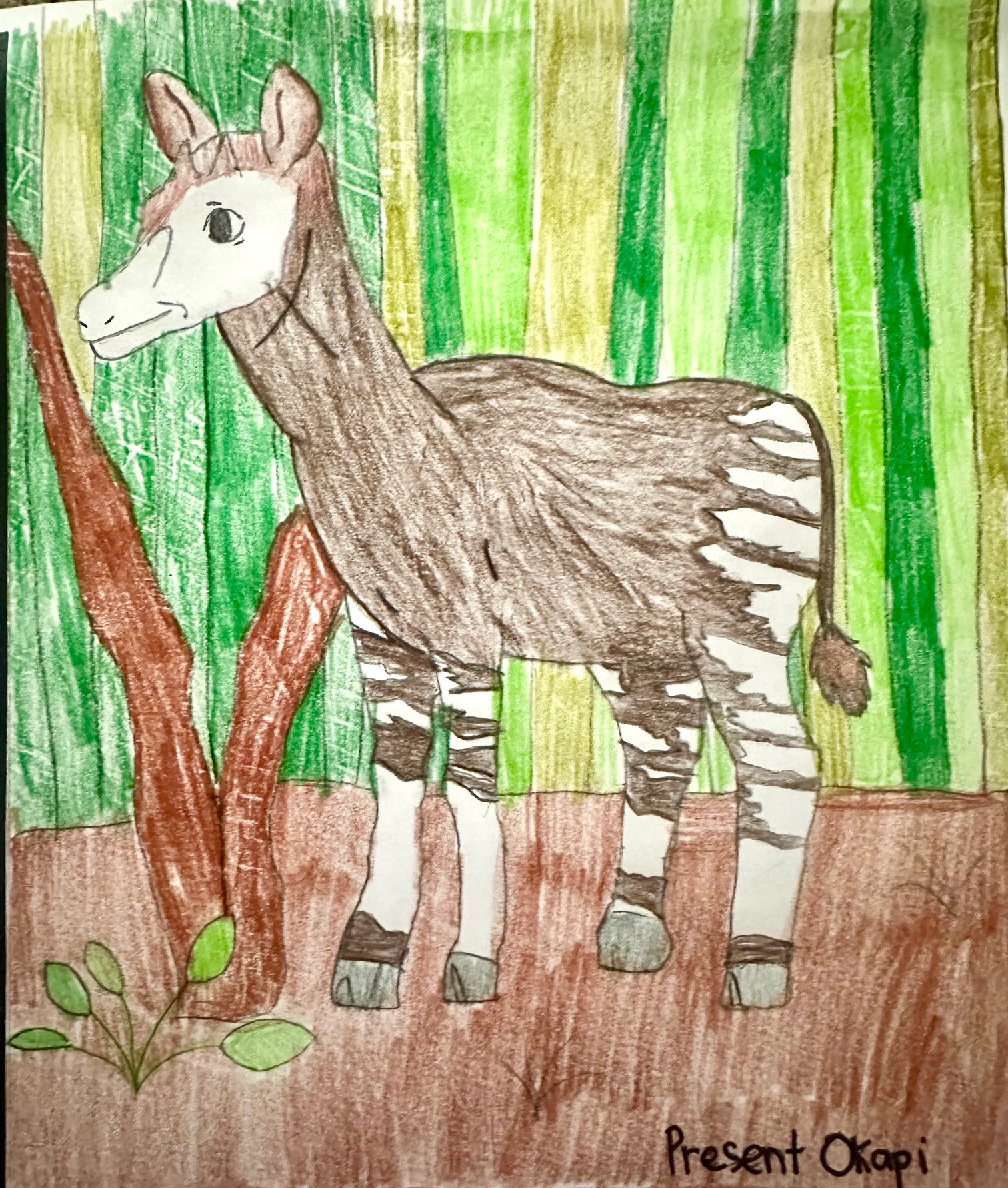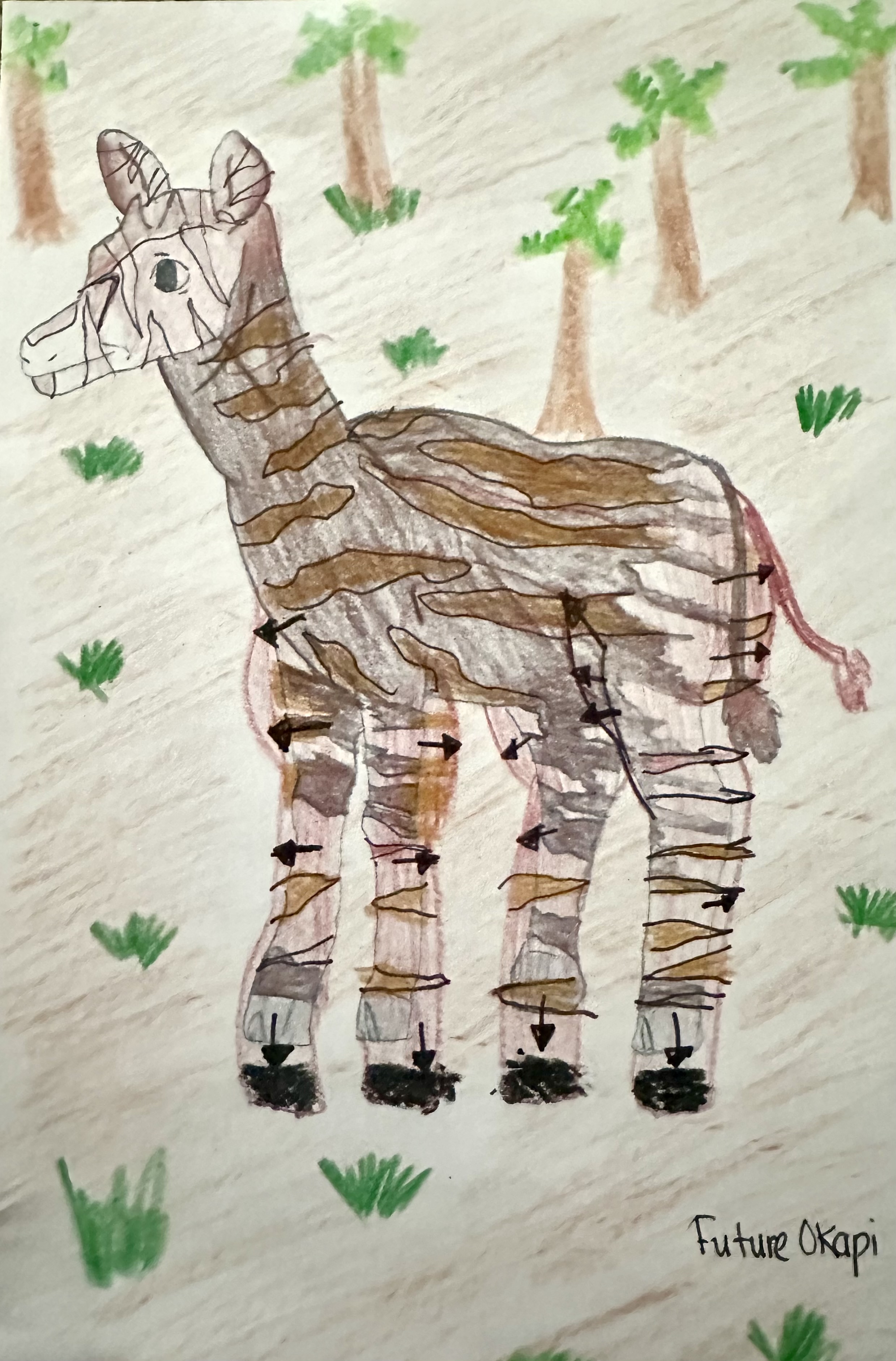 The Okapi’s habitat, the Ituri rainforest in the Democratic Republic of the Congo (Central Africa), is going to change a lot in 1,000 years. It will go from thick, wet forest to patches of forest, and dry and savannah-like in between. It doesn’t help that the rainforest is also shrinking because of locals using land for farming and from mining companies too. With the change in smaller patches of forest and dryer warmer temperatures Okapi will go from having a plain dark coat with some stripes (sometimes called follow-me stripes which help its babies see its mom) to a lighter brown coat to blend in with the savannah, and it will adapt more stripes. Like the zebra, this will help the Okapi in the savannah. They will grow stronger legs to outrun predators since they will have less protection and coverage from their shrinking forest habitat.