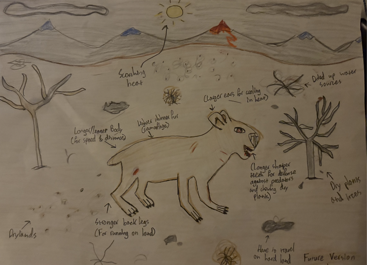 As of now, the Capybara is found in the Amazon rainforest where it lives in the wetlands and rivers and swims to stay cool and avoid predators. However, because of global climate change, the Amazon Rainforest might become even hotter, and the wetlands may become dry grasslands. The Capybara will adapt to survive and evolve to have longer legs and a slimmer body, allowing it to travel further to reach water and run faster over land. Its fur might become lighter and thinner to blend in with dry grass and also stay cool. Its ears may also become bigger to release body heat and its back legs may become stronger with its teeth becoming sharper to adjust to the dry plants and having less water for protection. The capybara's new name will become the Sunrunner Capybara.