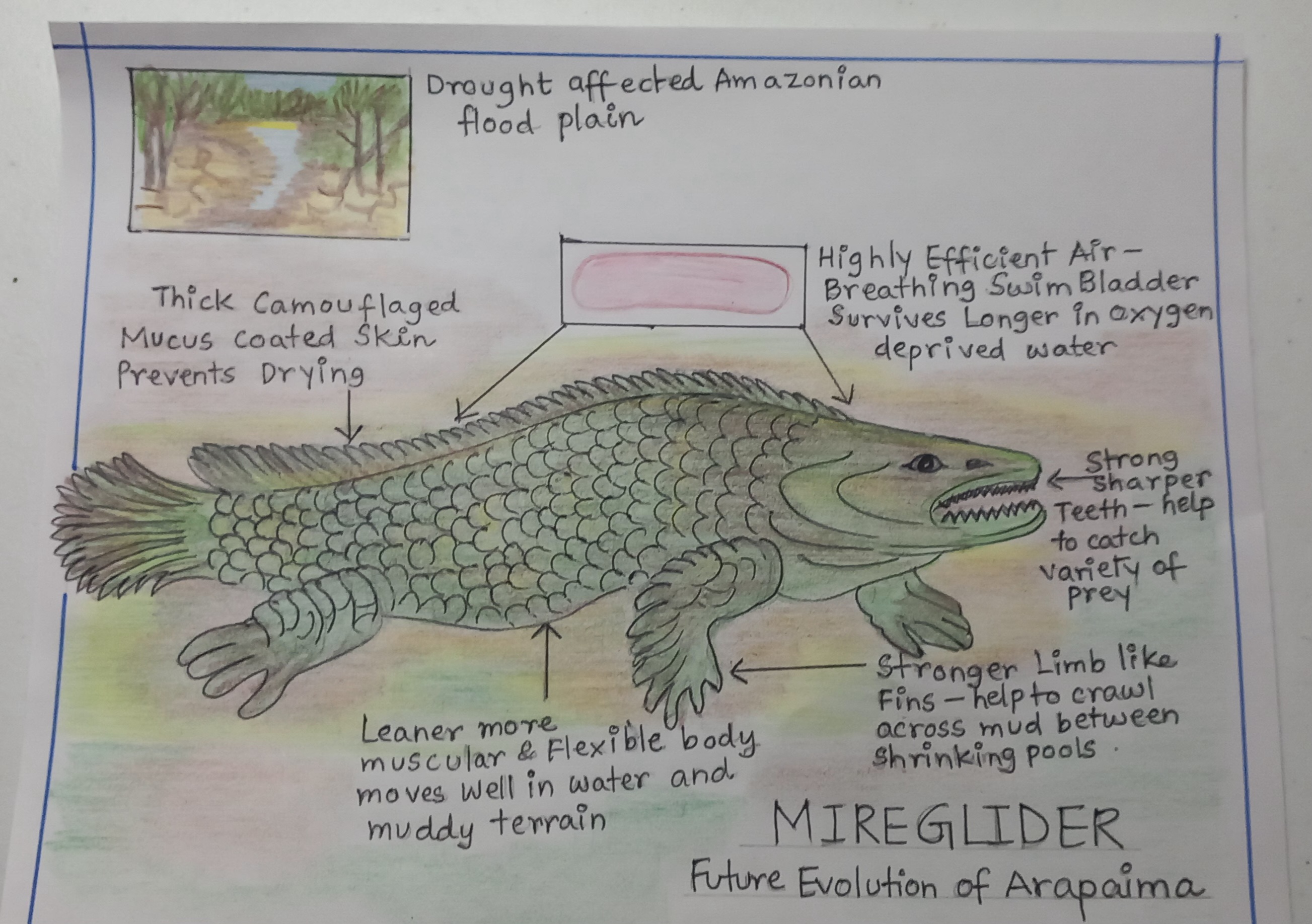 In the future, arapaima (Mireglider) could evolve new adaptations as their environment changes. Their fins may become stronger and more flexible, helping them move across muddy riverbanks during droughts and dry seasons. Their air-breathing ability might become even more efficient, allowing survival in extreme conditions. They may also develop thicker skin, better camouflage, and stronger jaws to hunt a wider range of prey, becoming a swamp-adapted predator.
