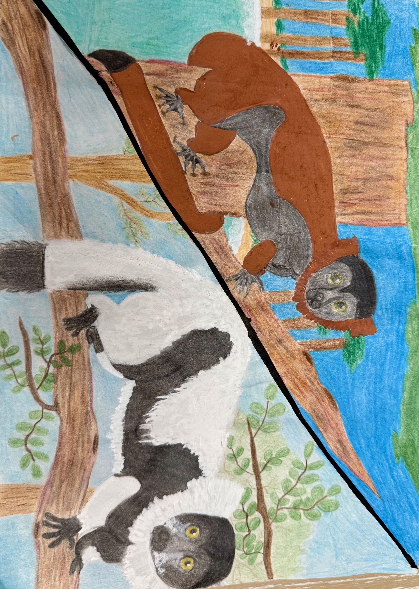 The Ruffed Lemur is an endangered species of Lemur that lives in the high canopy rainforests of Madagascar. In the bottom right corner you will see the original drawing of the black and white Ruffed lemur. In the top left corner you will see the transition to the brown and black Ruffed lemur which lives its life swimming on the coasts. My recreation features webbed feet for swimming, shorter fur for higher temperatures due to climate change, a longer tail for climbing easier, longer legs for running quicker from predators, a more agile and lean build, a shorter snout for keeping water out when swimming, longer fingers and sharp claws for grasping branches and fending off predators, and larger pupils for seeing better by night and by day.