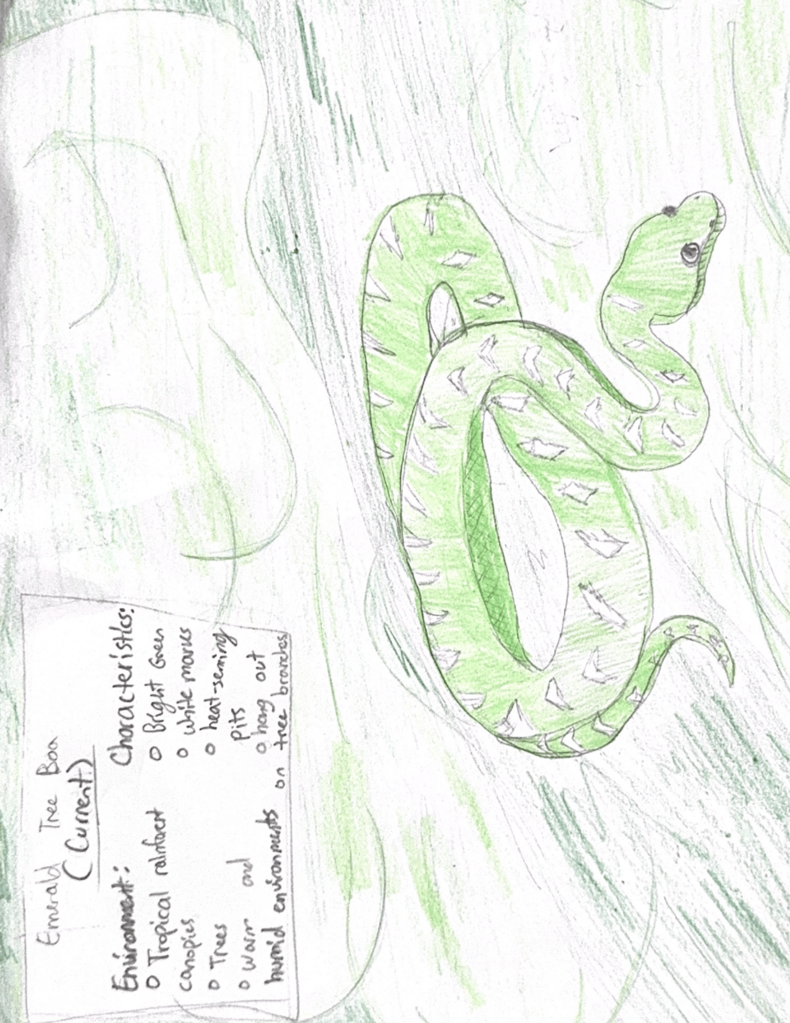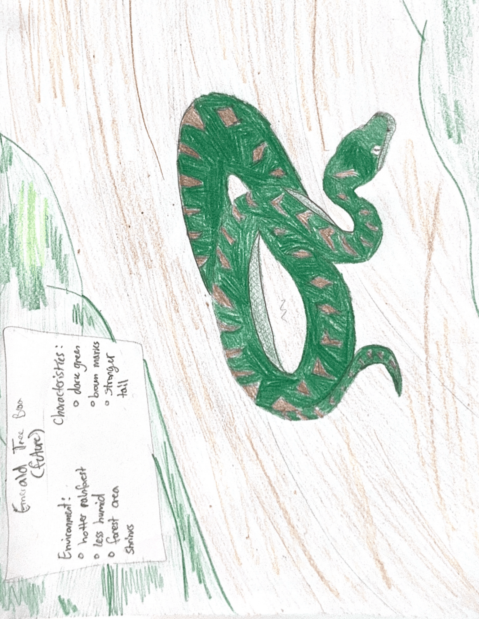 The emerald tree boa is a non-venomous snake native to the Brazilian Amazon rainforest. It is bright emerald green with white zigzag markings that help it blend into the forest. It has a triangular head with heat-sensing pits to detect warm-blooded prey and long front teeth for gripping birds and small mammals. Behaviorally, it’s nocturnal and spends most of its life coiled on branches, waiting to ambush prey. If its environment became hotter, drier, and less humid, it would gradually adapt. It might broaden its diet to include more reptiles as bird populations shift, spend more time in shaded canopy areas, and be active during cooler hours. Greater heat sensitivity could improve hunting. Physically, natural selection might grant it slightly longer bodies for reaching prey, stronger tails for gripping thin branches, darker green and brown coloration for camouflage in drying leaves, and better tolerance to heat and low humidity.