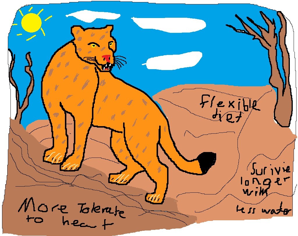 Jaguars live in the tropical rainforests of the Amazon Rainforest, where the environment is dense, humid, and full of trees and rivers. Their fur helps them blend into forest, which makes it easier for them to sneak up on prey. Jaguars also have extremely strong jaws and teeth that allow them to crush bones and hard shells when hunting animals. They are powerful swimmers, which helps them cross rivers and catch fish or other animals near the water. These adaptations help jaguars survive and hunt successfully in their rainforest habitat. In the future I think Jaguars may develop better ways to regulate body temperature in hotter climates. They may also adapt to eat different types of prey, including animals found near farms or human areas. If droughts increase, jaguars may adapt to survive longer with less water.