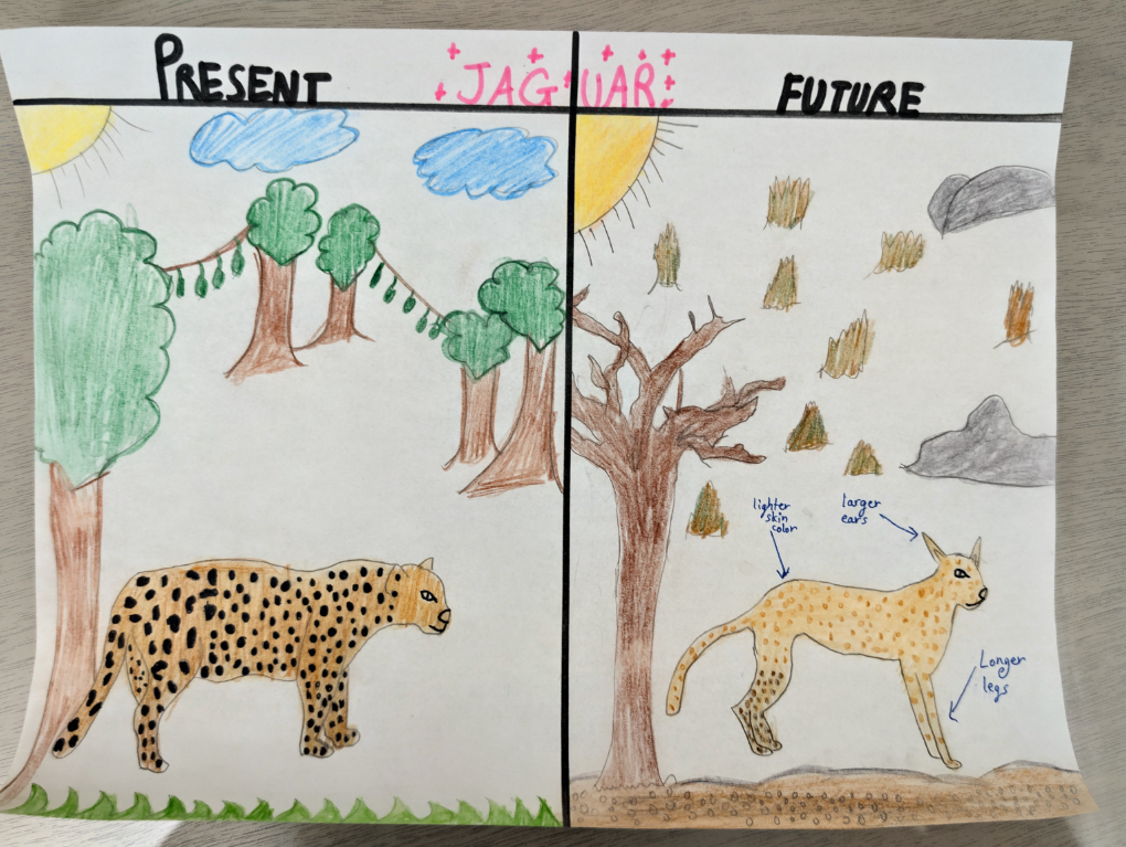 Currently, the Jaguar lives in rainforests and wetlands but over thousands of years, the climate has gotten much hotter, and the rainforests have turned into dry, open savannas. Because there are no more trees to hide in, the jaguar had to change to survive. Instead of being a stocky cat that sneaks up on prey in the shadows, the "Savanna Stalker" is now leaner with longer legs, built for running fast across open grass. Its fur has changed from dark spots to a lighter, sandy color to help it blend into the dry plants. Also, its ears are much bigger now, which helps its body stay cool in the hot sun. These big changes show how the jaguar adapted to its new, sunny home. It is no longer a jungle cat, but a hunter that learned to survive in a tough, changing environment.