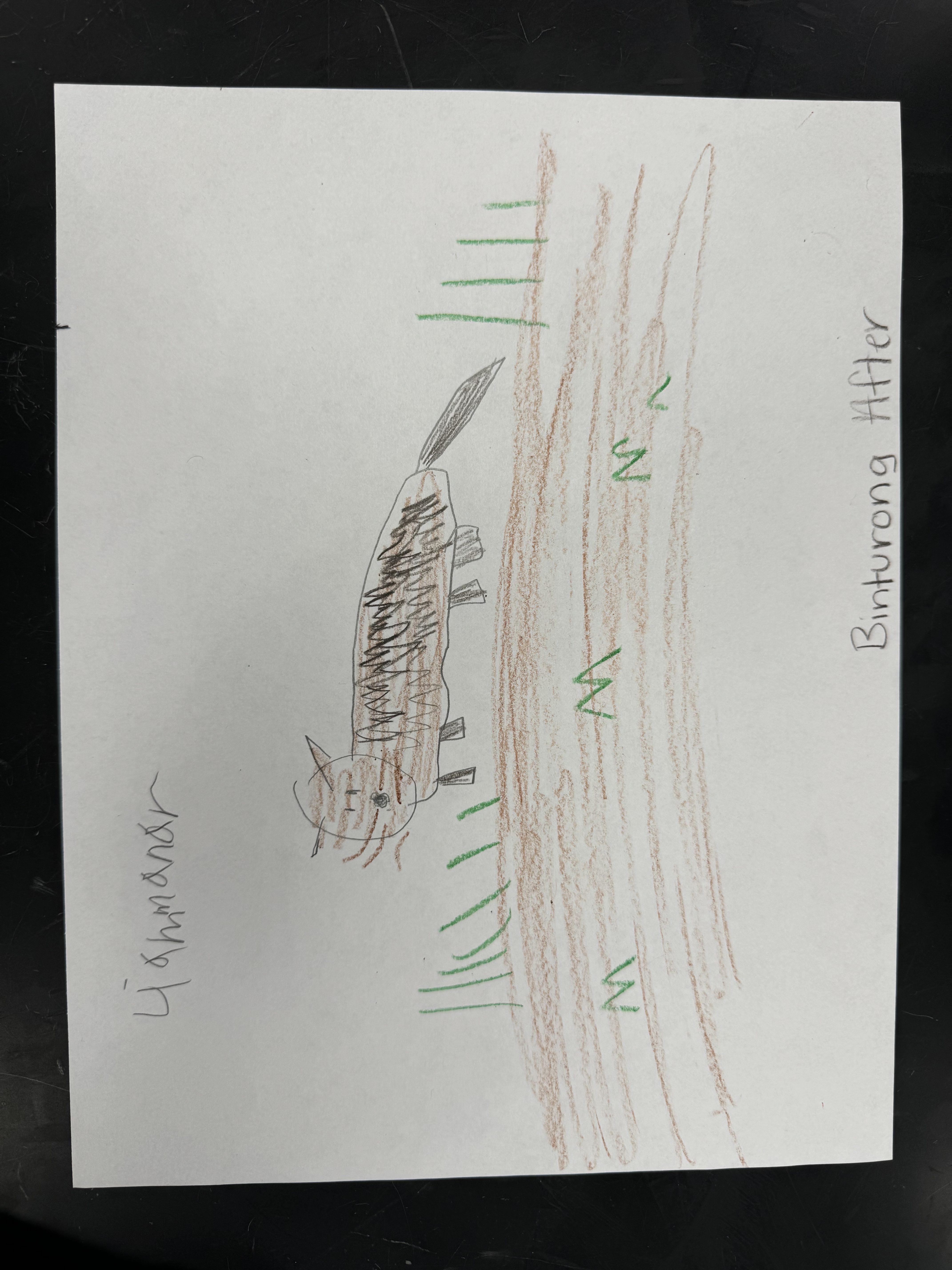 Future: The binturong is a heavier animal with short limbs and strong claws. The coat is short to keep cool and it is tan in color to help camouflage. The nose is short and pointed with short and brown whiskers. They have reddish brown eyes. It travels on the ground and moves slowly. They can climb easily . My animal likes to sleep by trees and grassy areas.They can eat other things other than fruit. They can have grass and small animals.