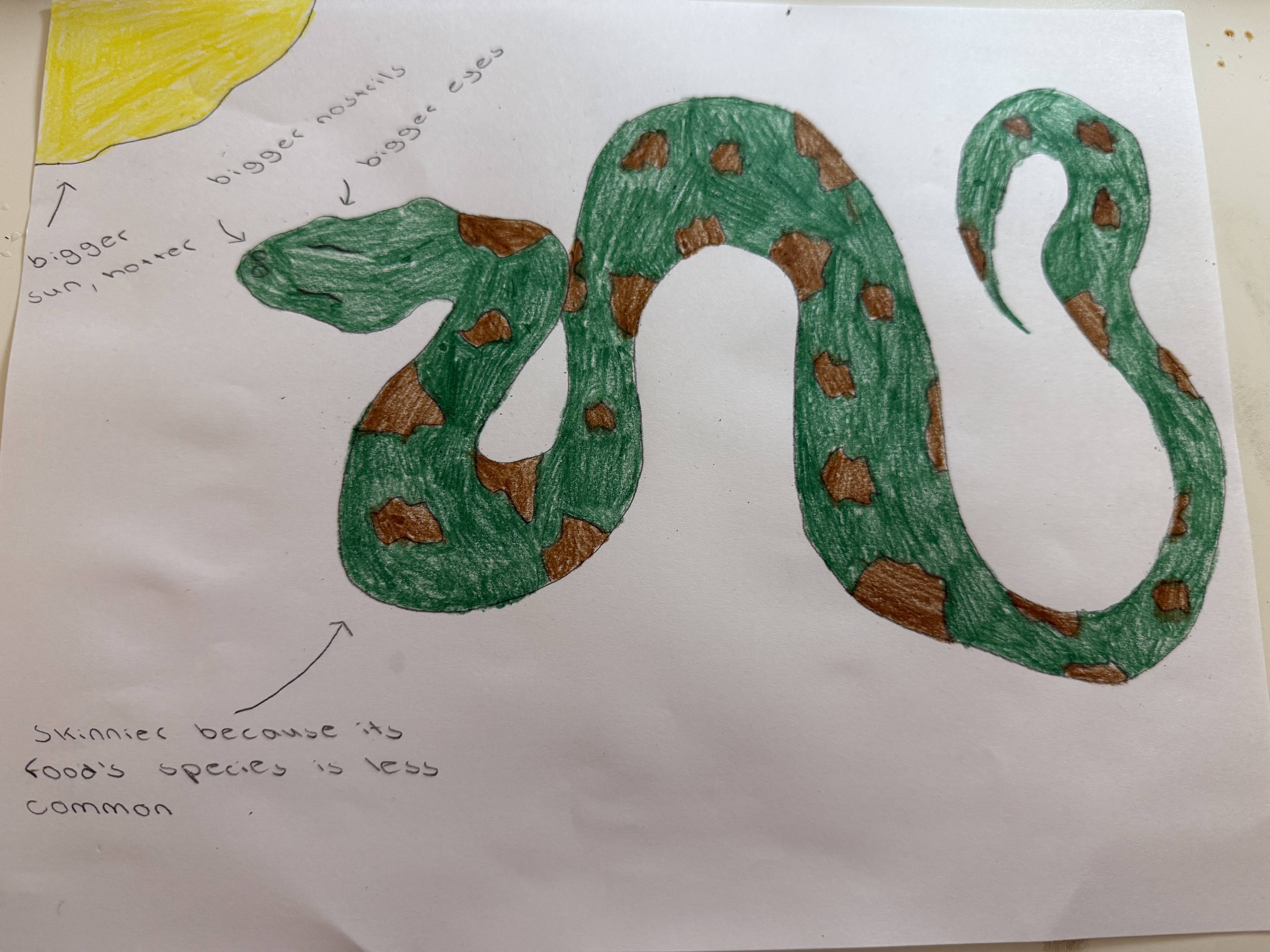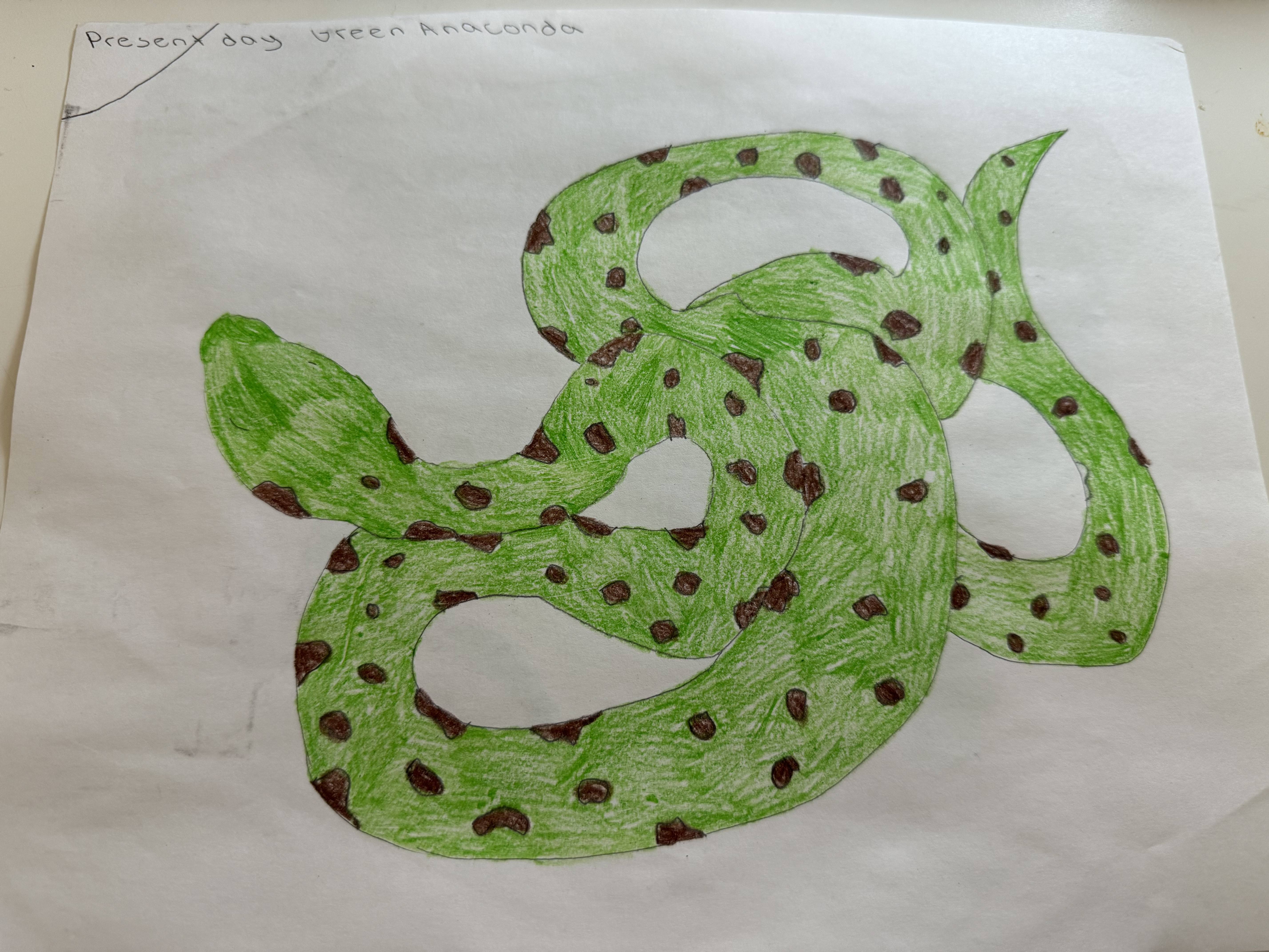 The green anaconda is one of the largest snakes in the world because of its weight and muscular figure. It lives in the Amazon Rainforest, in the rivers, swamps, and wet forests, and most of the time, it's underwater. It has a powerful body that helps it swim through water and catch animals for food. It mostly eats fish, capybaras, and birds. It has green skin and dark spots which helps it hide in muddy water and plants so prey cannot see it. It has eyes and nostrils on top of its head which makes it easier to see and breathe when underwater. In the future, climate change may make the rainforest hotter and cause rivers to dry up, meaning it won't live in the same conditions. Its skin may also become lighter to match the drier land and eat different prey to survive.