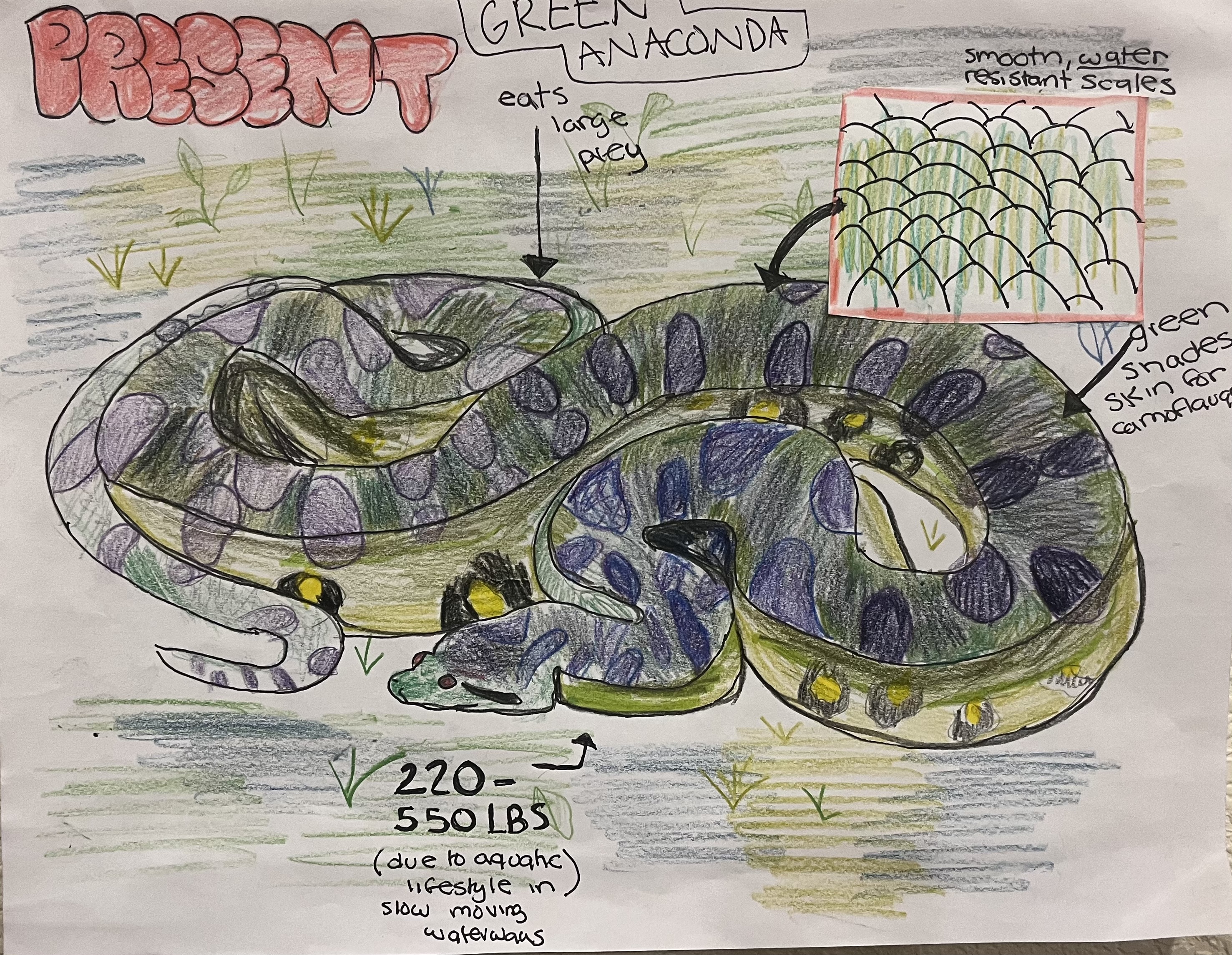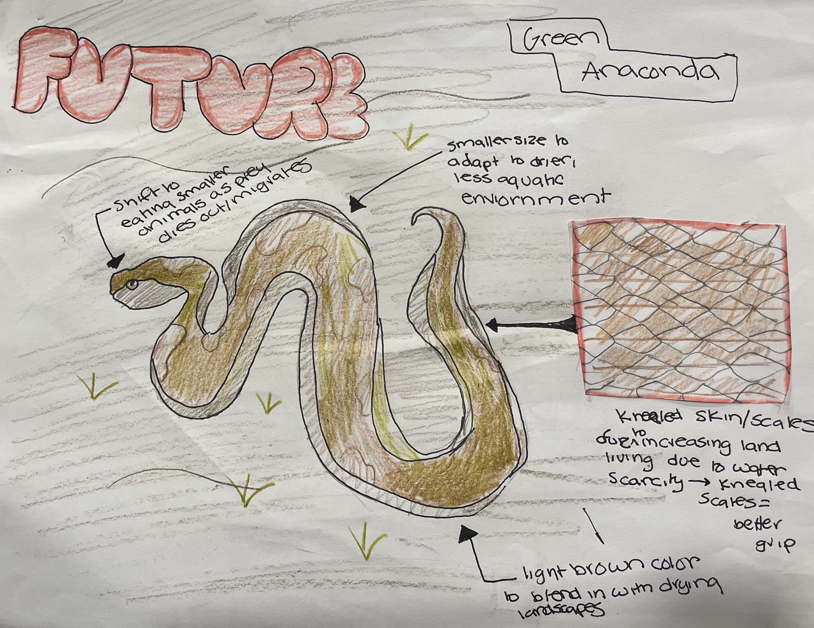As global warming rises, and the earth changes, so will the green anaconda. As vegetation becomes drier as a result of global warming, the green anaconda will adapt a browner color to better camouflage, and a smaller size to improve movement on land and require less water. A switch from smooth scales aiding water movement to kneeled scales aiding land movement is likely to occur as marshes dry out.