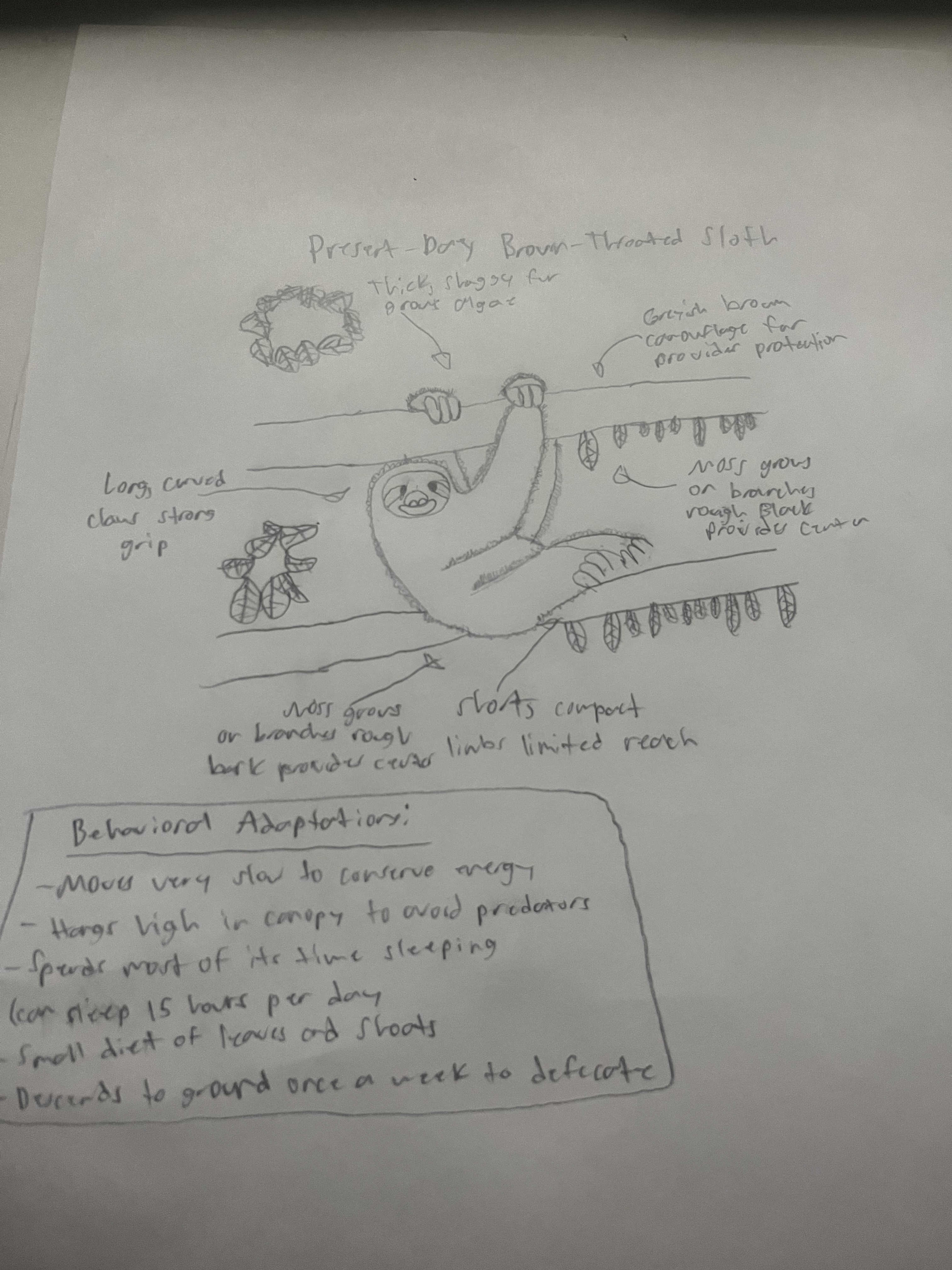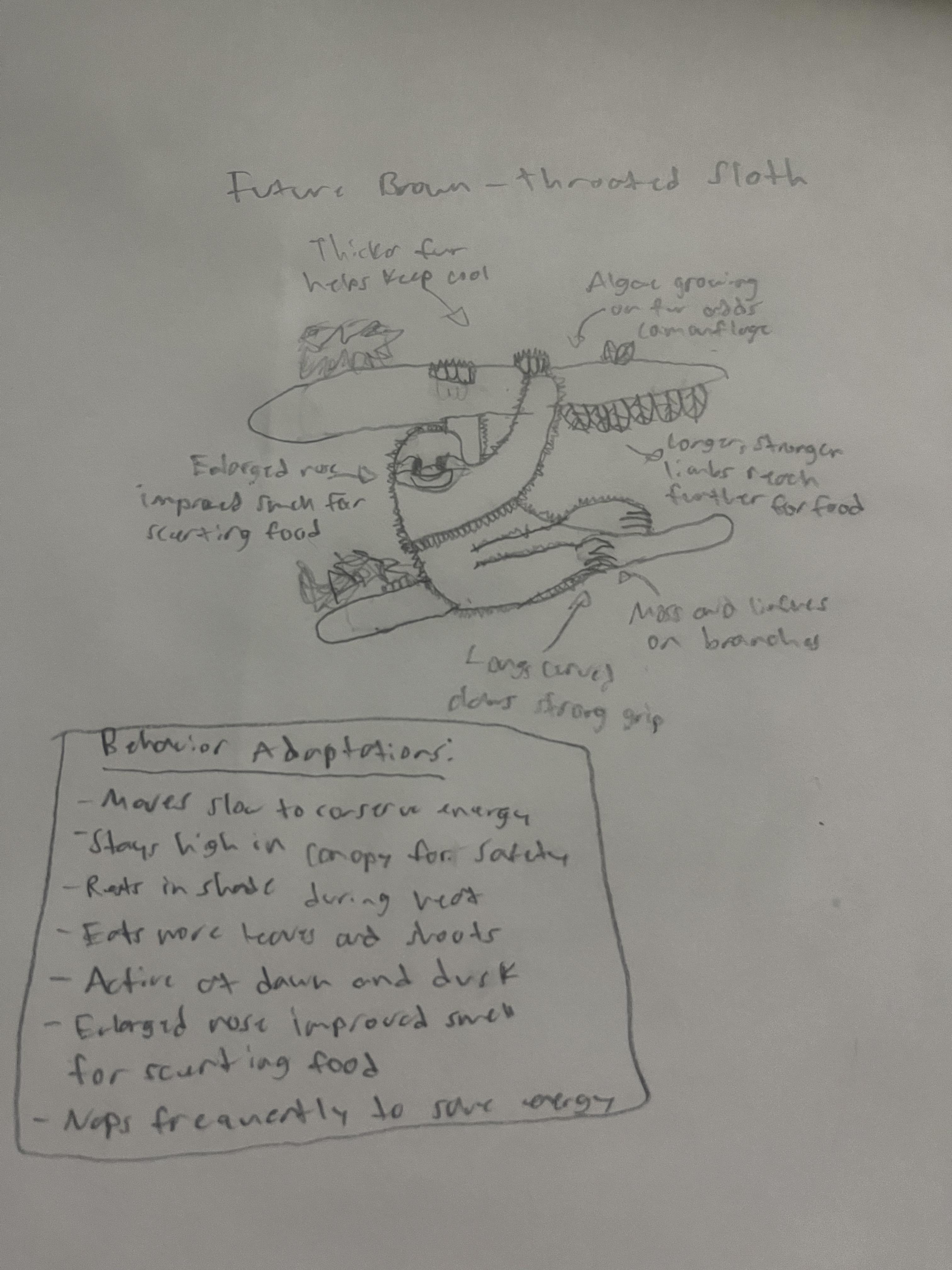 These drawings show a present-day brown-throated sloth and a future brown-throated sloth and explain their adaptations. The present-day sloth has thick fur that can grow algae, which helps it blend into the trees. It also has long curved claws to grip branches and moves very slowly to save energy. It lives high in the forest canopy and mostly eats leaves. The future sloth drawing shows how the animal might change if the rainforest becomes hotter. It may have thicker fur to help control heat, longer arms to reach more food, and stronger claws for better grip. Both drawings show how adaptations help animals survive in their environment and how species may change over time to stay alive.