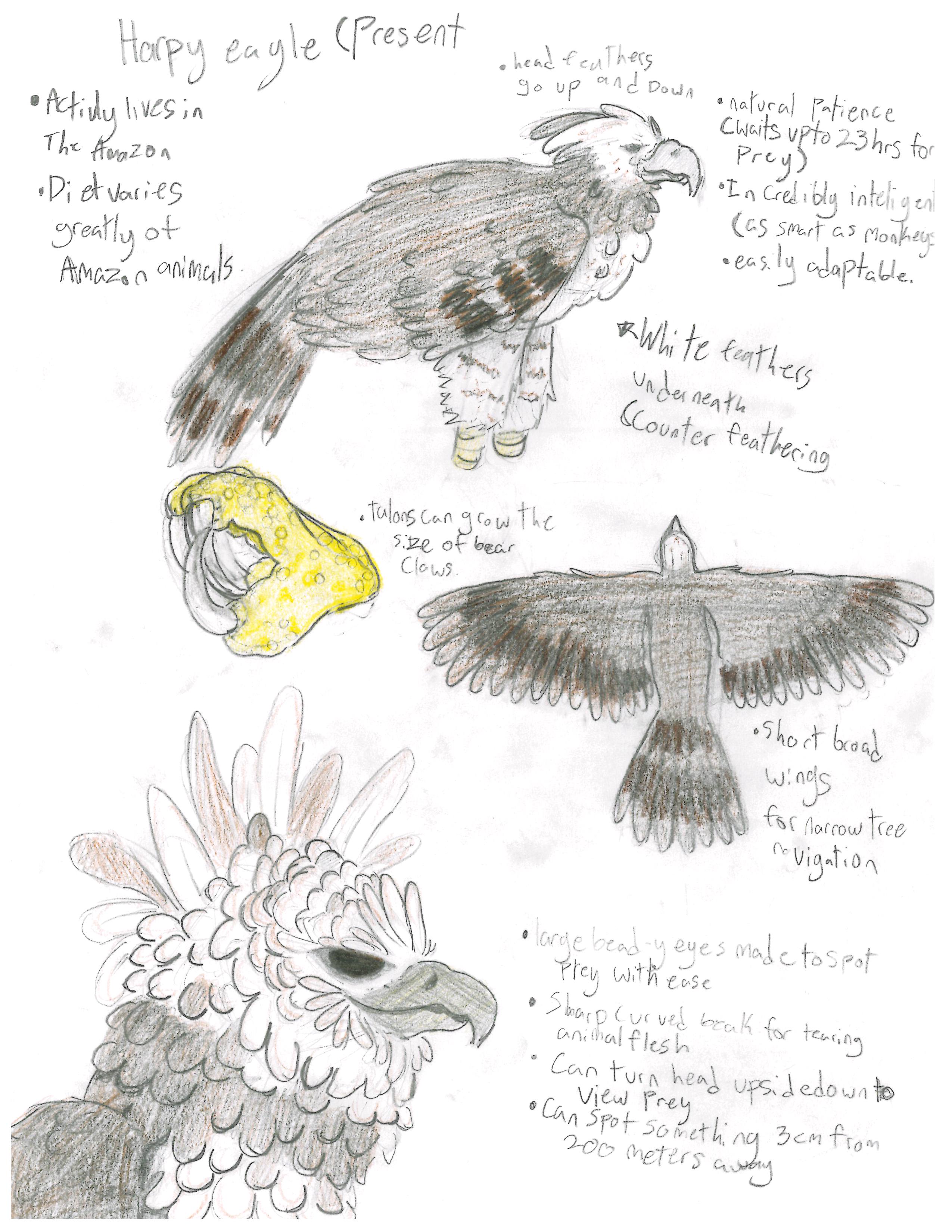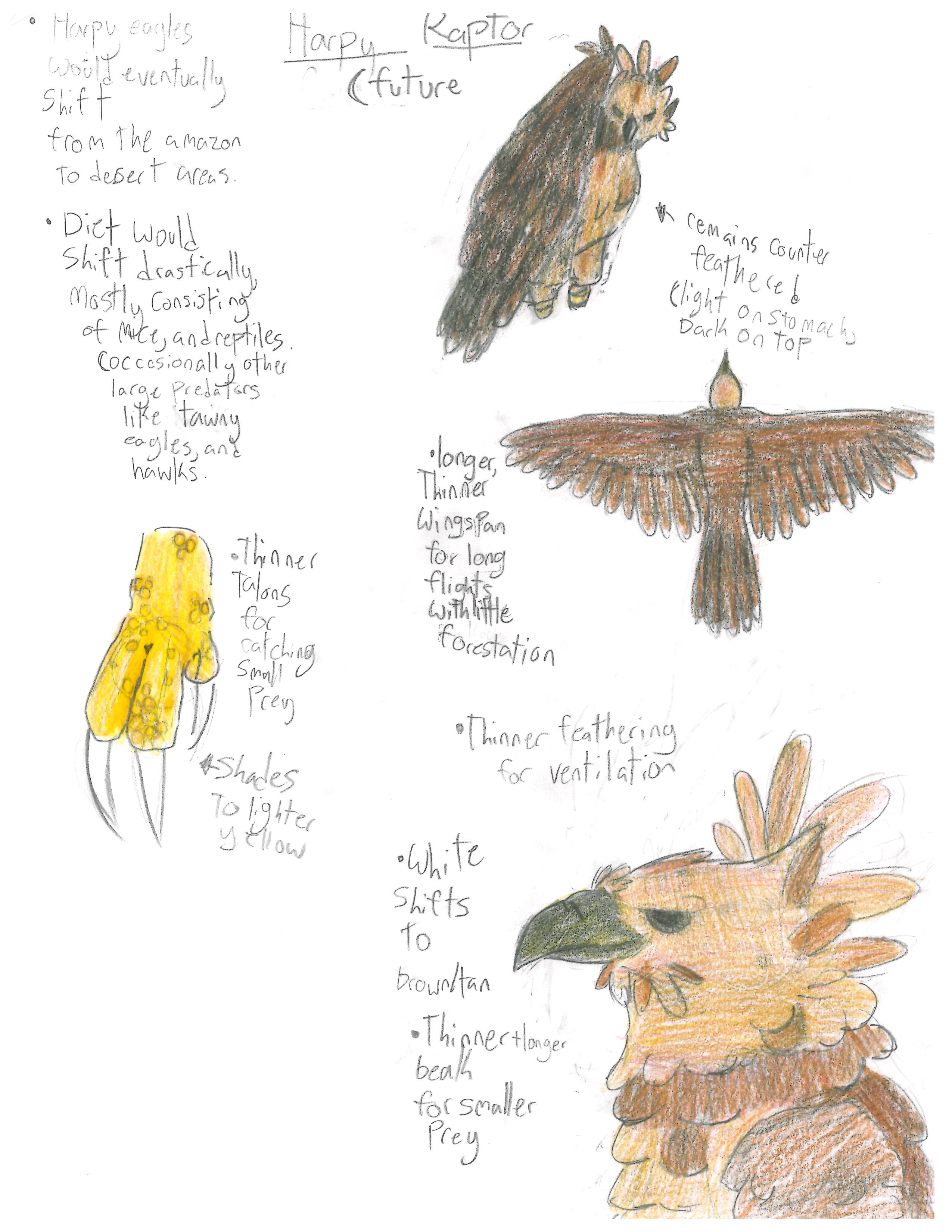 As one of the world's largest raptors, Harpy eagles face a large amount of habitational issues. Where they live, in the amazon rainforest (located mostly in Brazil) faces issues of deforestation, and climate change. These large carnivores eventually would have to move. In 1000 years they would most likely end up in desert areas. They would have thinner feathering, color changes, beak changing to be longer and thinner, a wider wingspan, and thinner talons. They would use their talons and beak for a new diet, consisting of desert reptiles, smaller birds, and on occasion other large bird predators like hawks. As the eagles they are, they would remain dominating the skies, even with the changes.